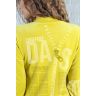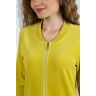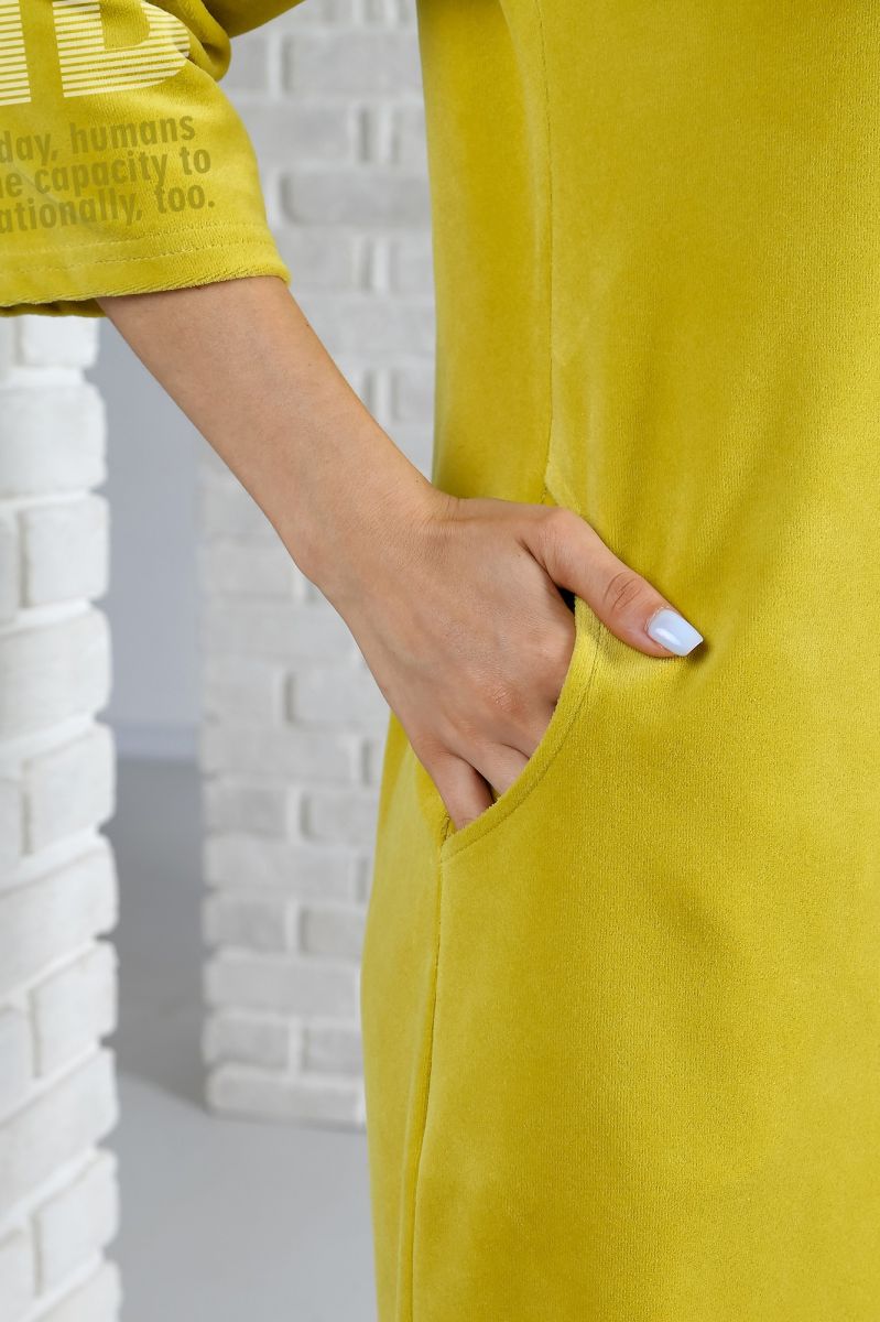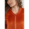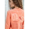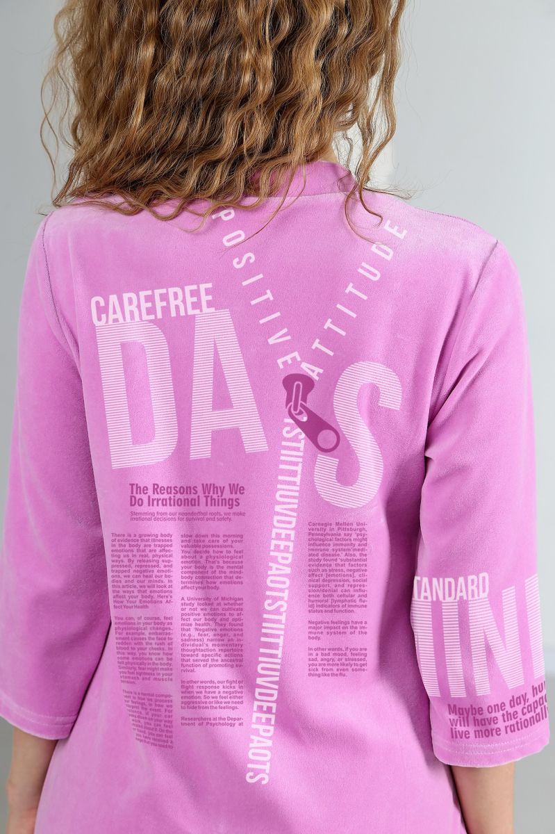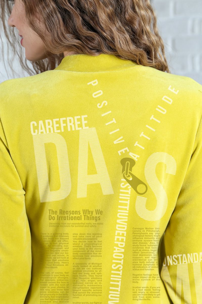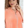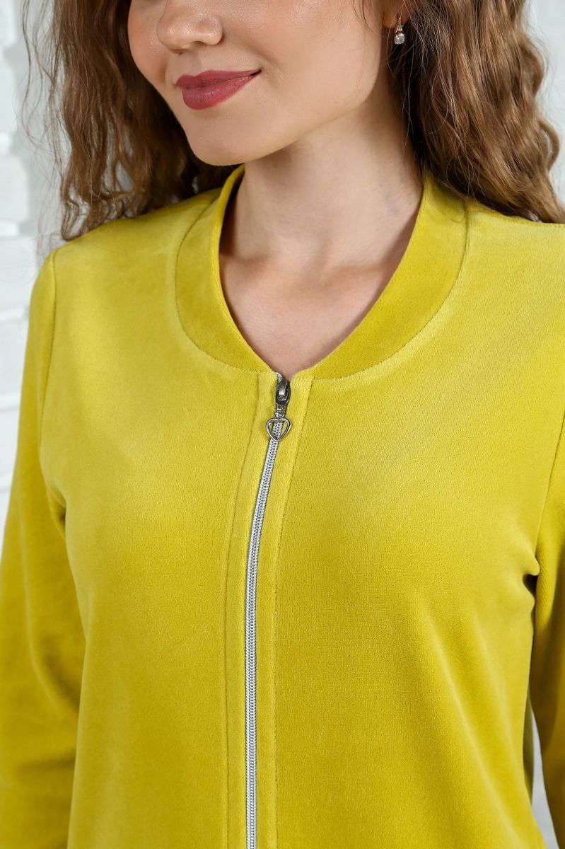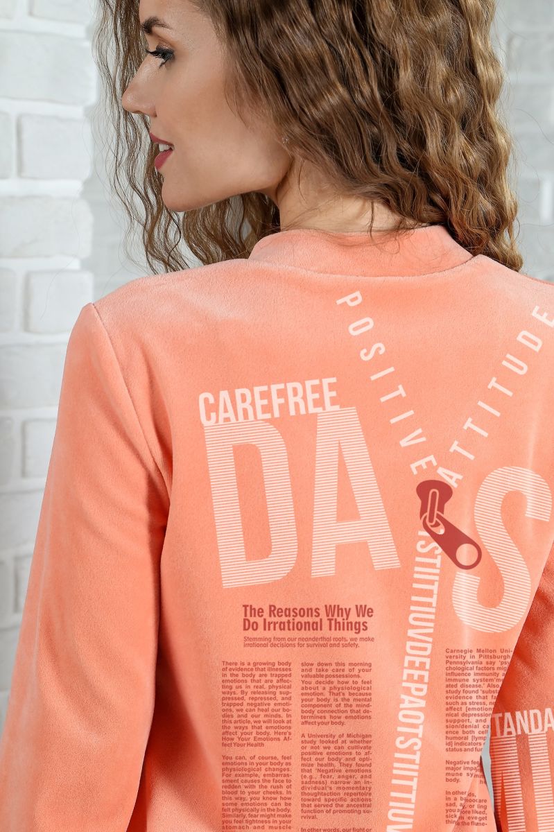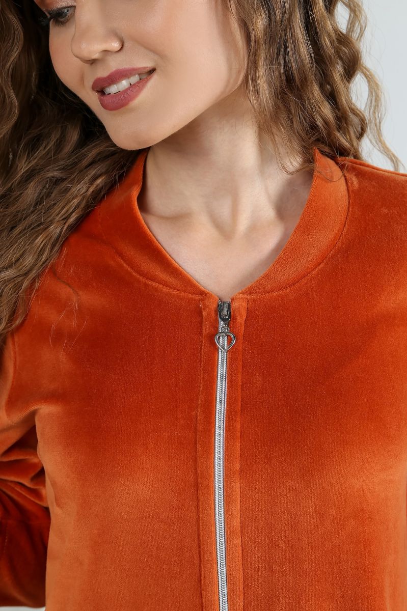 Из трикотажного гладкокрашеного полотна «велюр» прямого силуэта, с втачными рукавами ¾ длины, горловиной V-образной формы, обработанной втачной планкой, с карманами в боковых швах, центральной бортовой застежкой на тесьму «молния» и принтом на полочках.