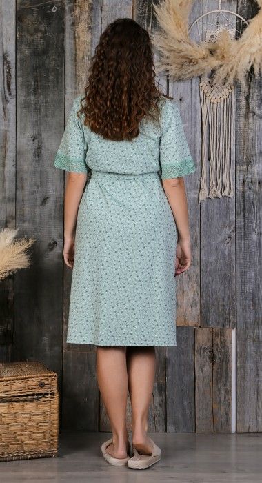 Халат из трикотажного полотна «кулирка» с набивным рисунком, на запахе, с короткими втачными рукавами, отделанными кружевом по нижним срезам.