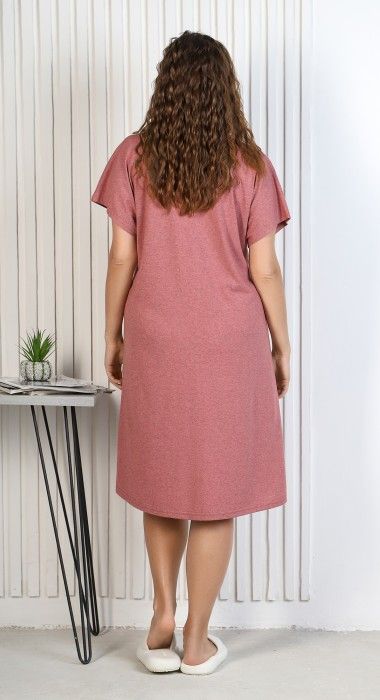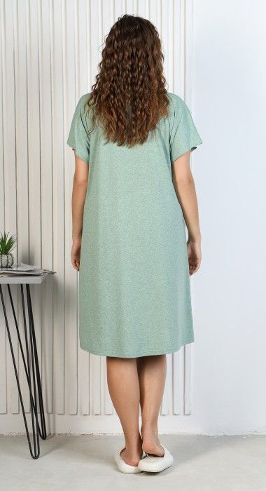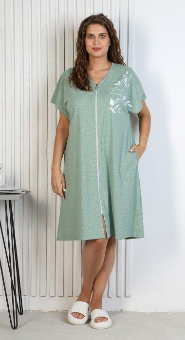 Халат женский из трикотажного полотна «кулирка-меланж», полуприлегающего силуэта, слегка расширенный книзу, с короткими цельнокроеными рукавами, карманами в боковых швах, горловиной овальной формы, центральной бортовой застежкой на тесьму «молния» и принтом на полочке в технике шелкографии. Горловина и входы в карманы окантованы основным материалом.