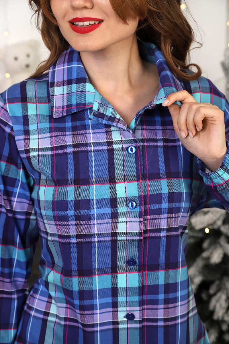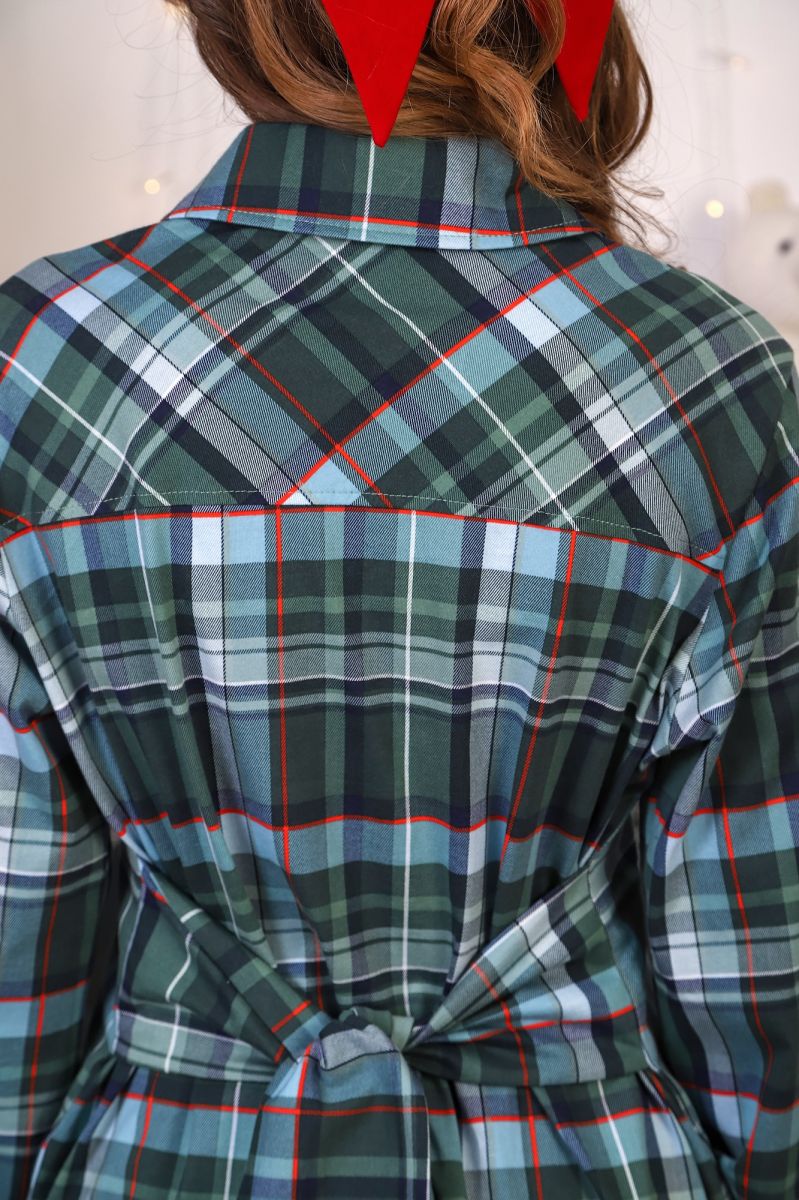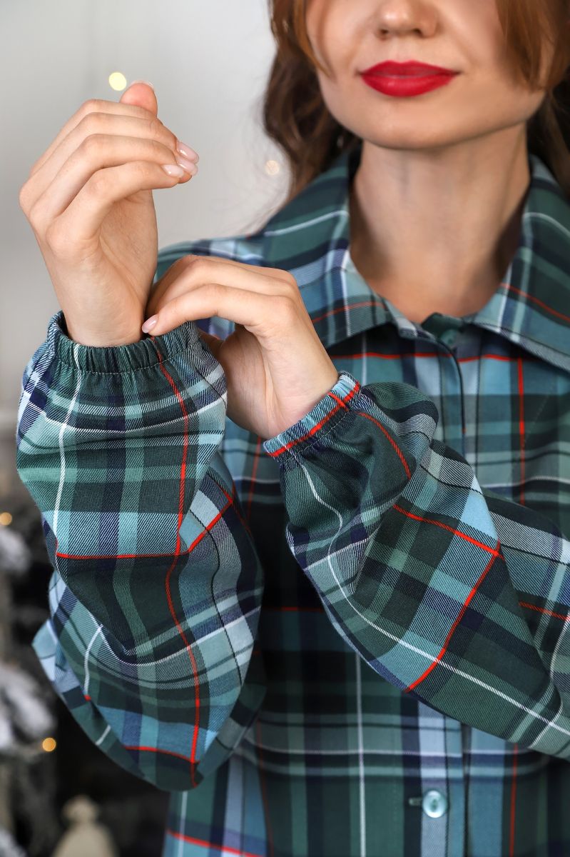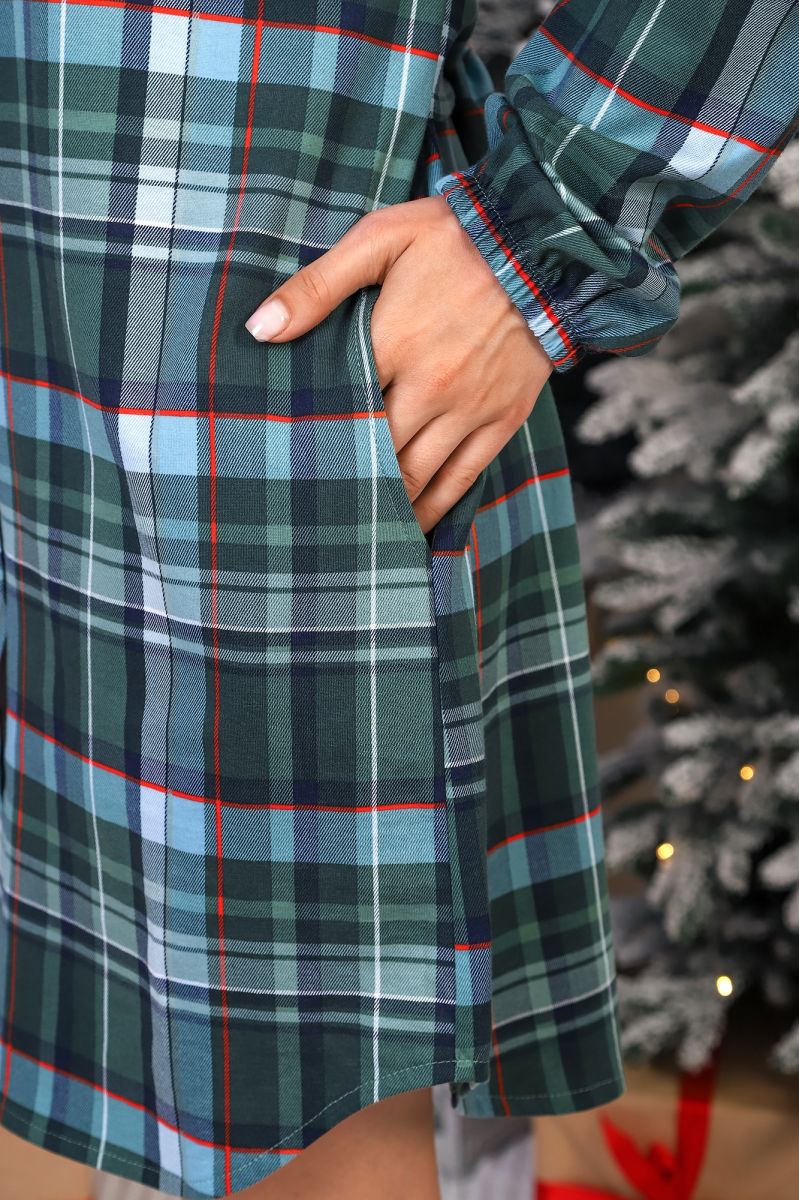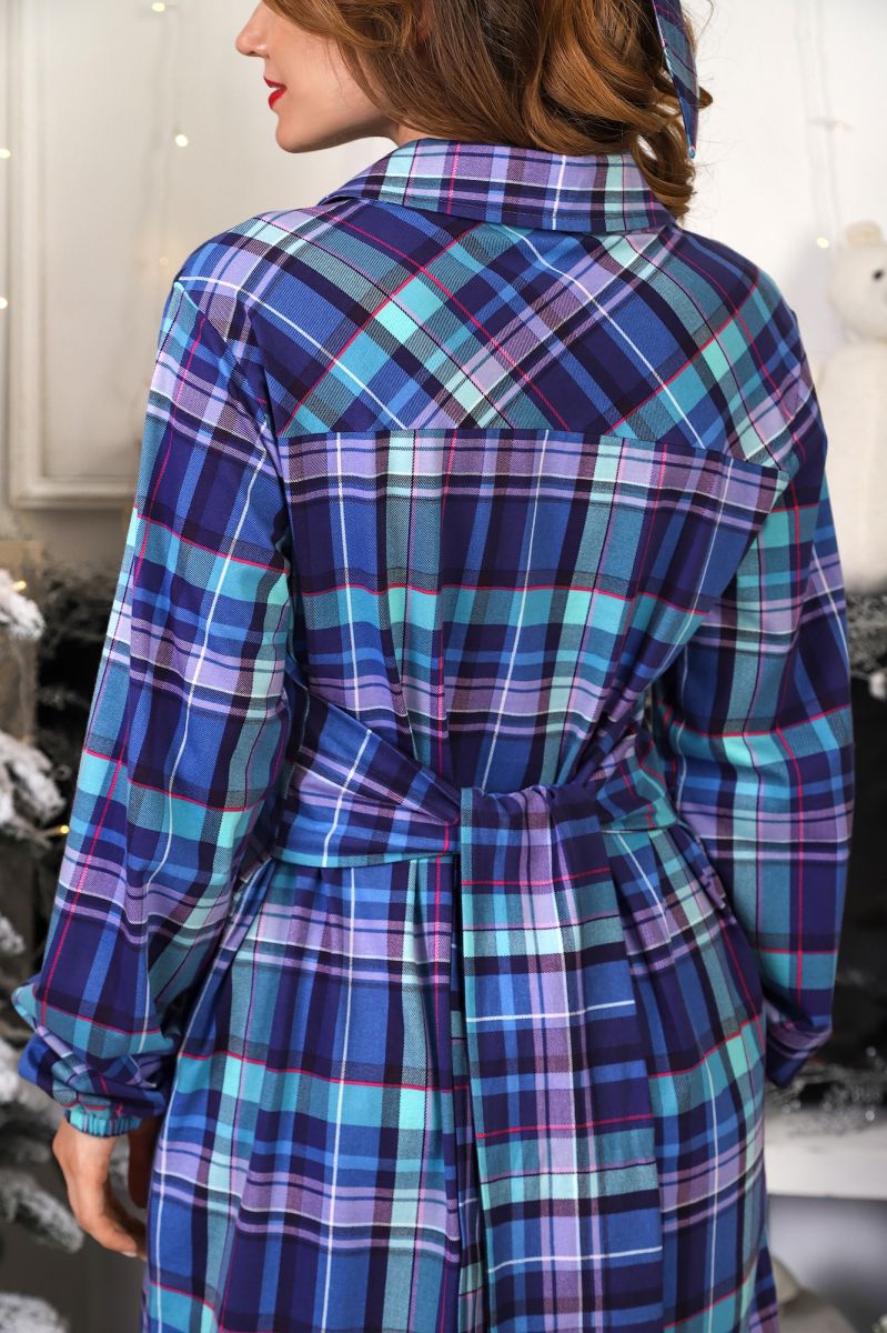 Халат из трикотажного полотна «кулирка» с набивным рисунком, прямого силуэта, с длинными втачными рукавами, стояче-отложным воротником, карманами в боковых швах и центральной бортовой застежкой на петли и пуговицы, с фигурной линией низа. Низ рукавов обработан эластичной тесьмой, в боковые швы на уровне линии талии втачаны концы двух широких завязывающихся спереди полупоясов.