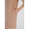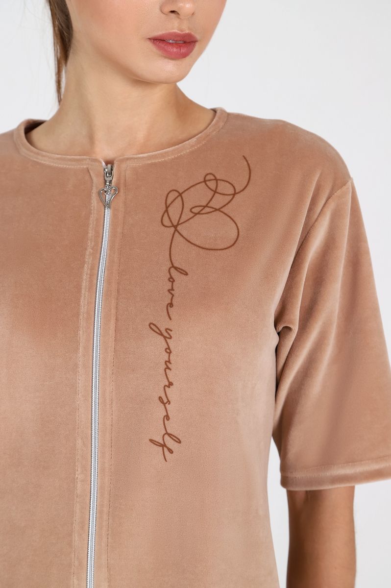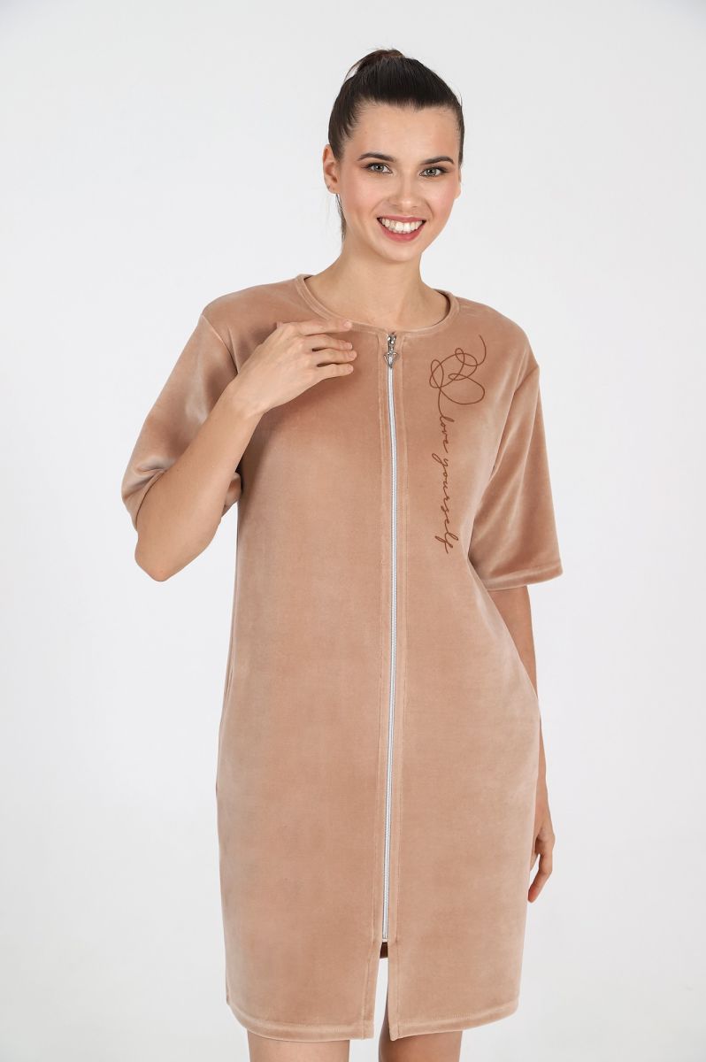 Халат из гладкокрашеного полотна «велюр», прямого силуэта, с втачными рукавами длиной ¾, горловиной овальной формы, карманами в боковых швах и центральной бортовой застежкой на тесьму «молния». На полочке выполнена печать в технике «шелкографии».