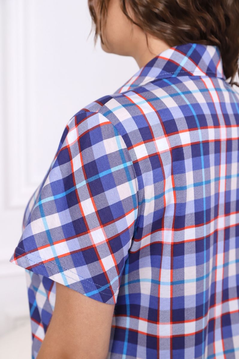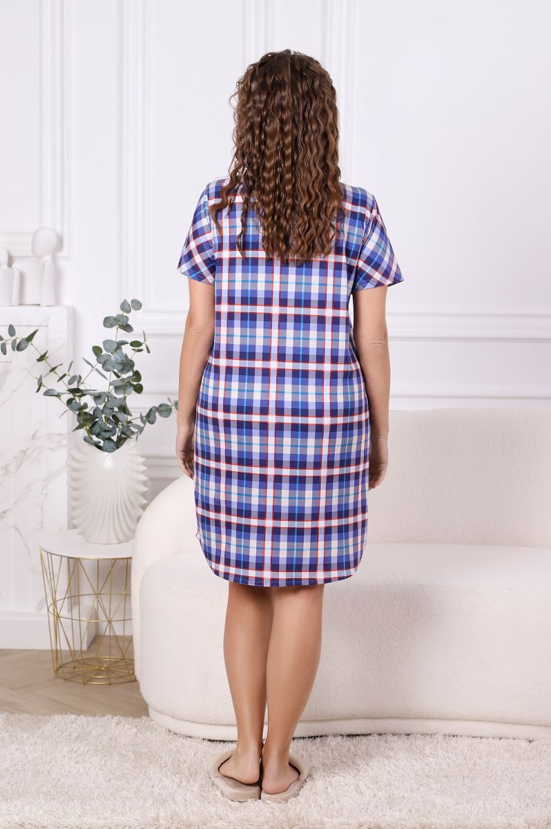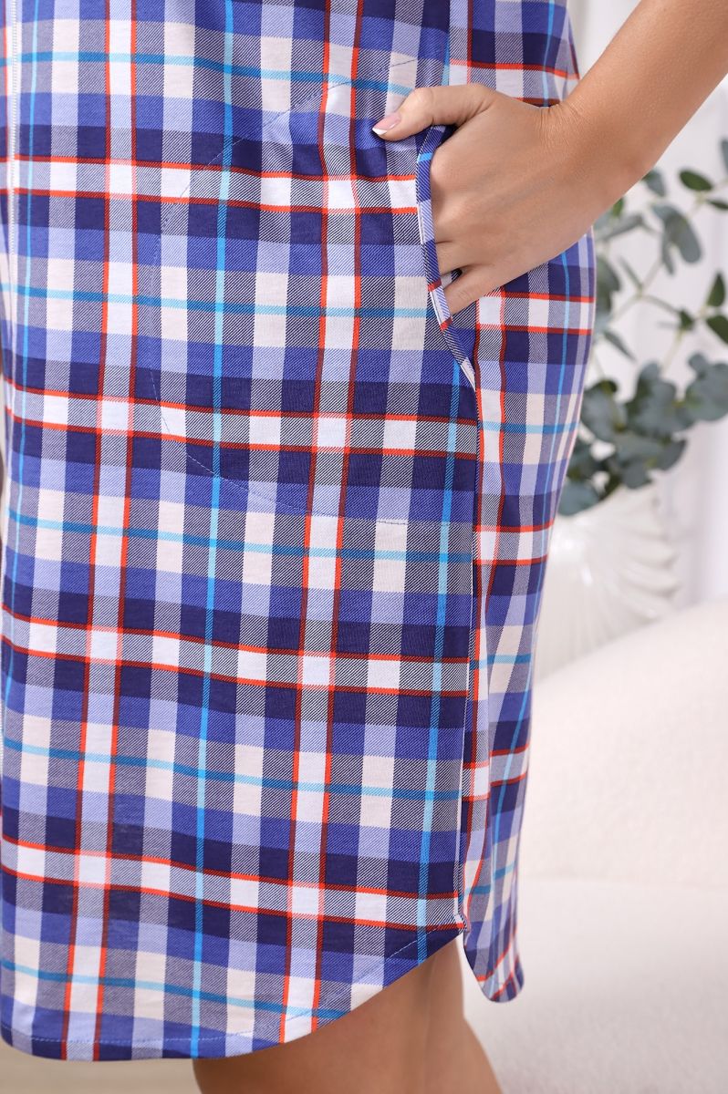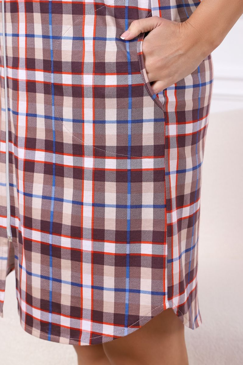 Халат женский из трикотажного полотна «кулирка» с набивным рисунком в клетку, прямого силуэта, с короткими втачными рукавами, стояче- отложным воротником и центральной бортовой застежкой на тесьму «молния».