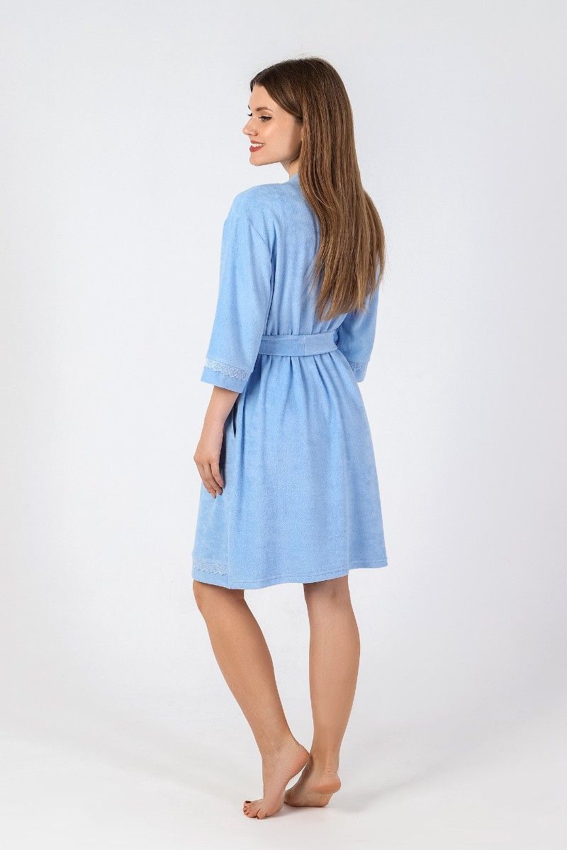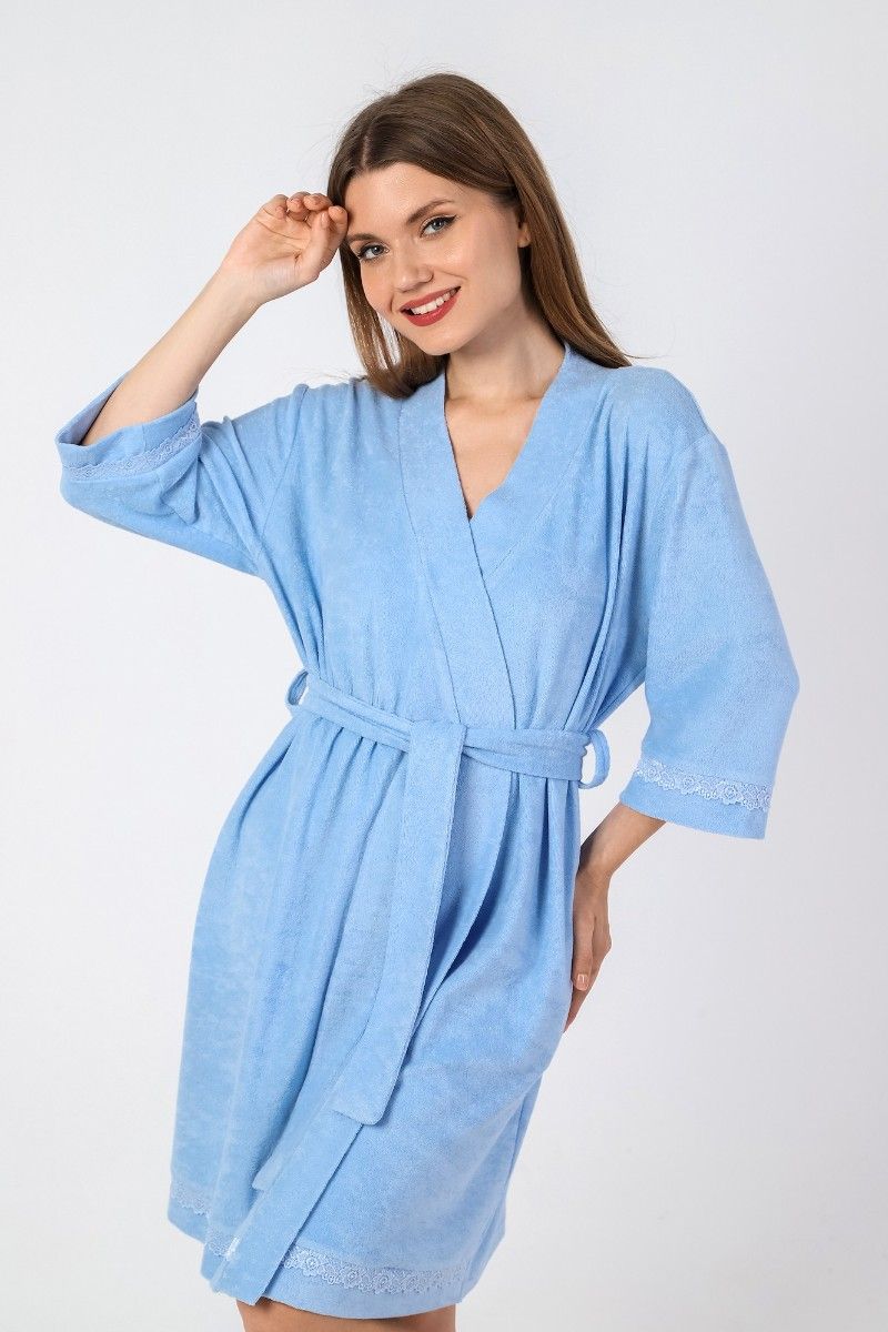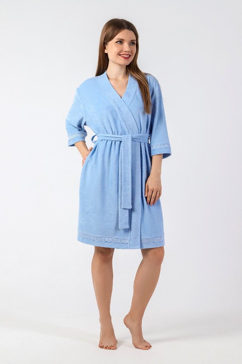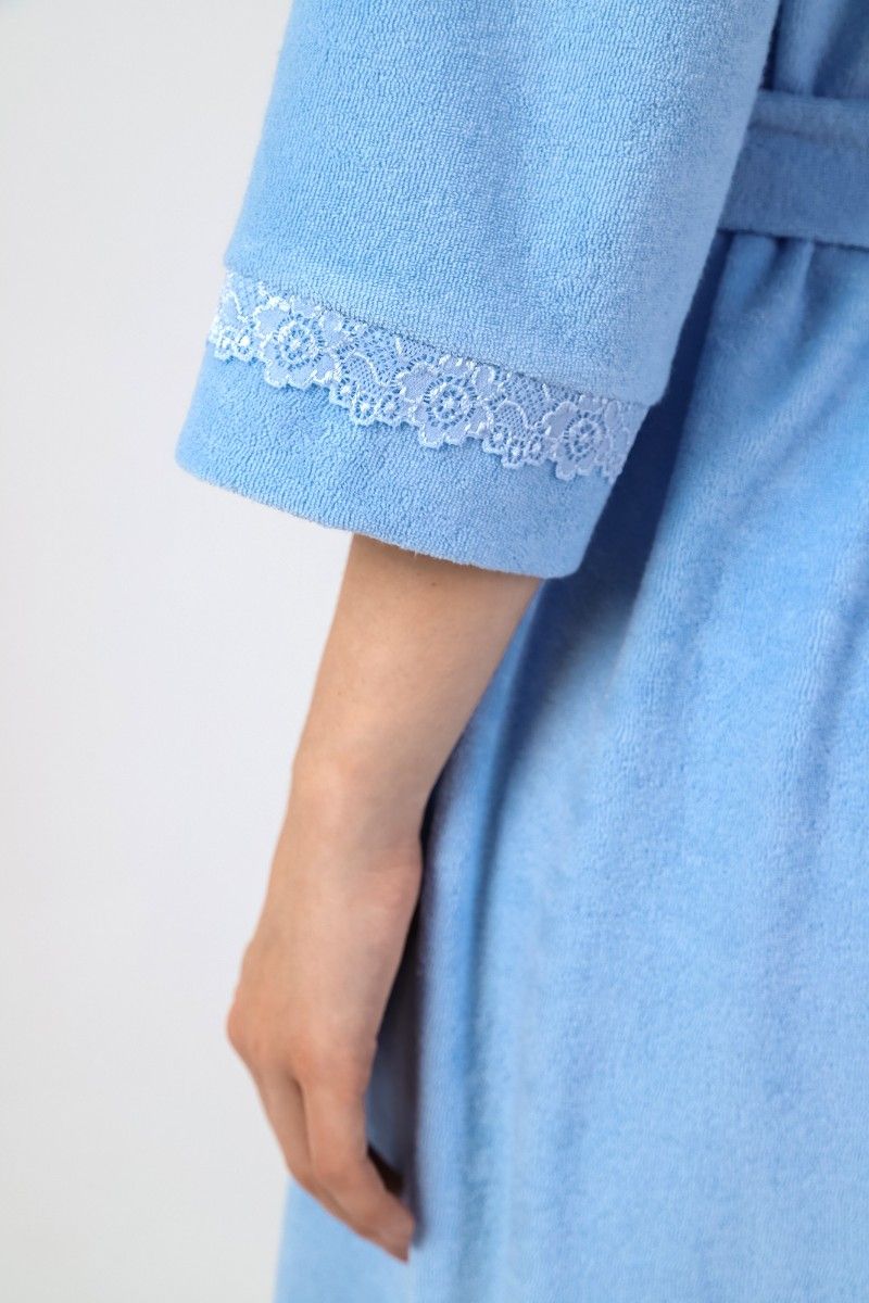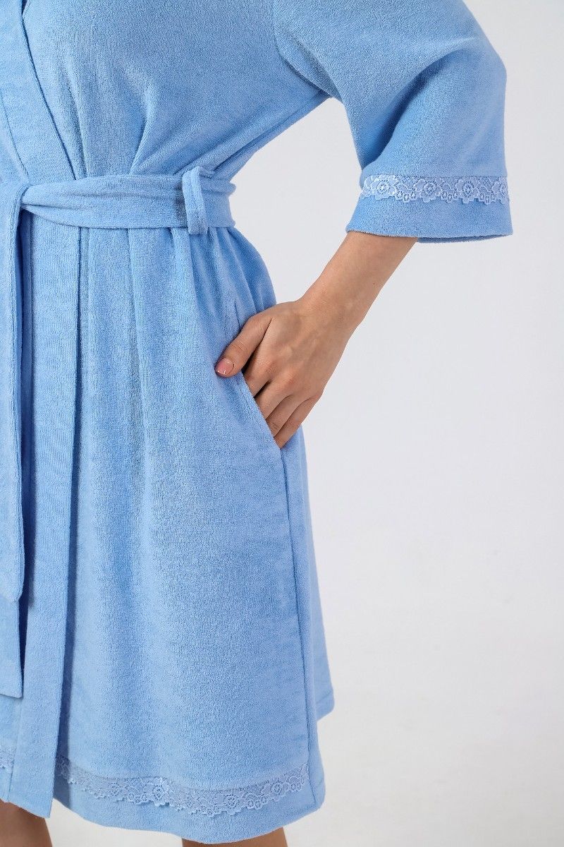 Халат молодежный из гладкокрашеного трикотажного махрового полотна, прямого силуэта, на запахе, с рукавами длиной ¾, карманами в боковых швах и съемным поясом, завязывающимся на талии и продетым в две шлевки, вставленные в боковые швы. Рукава и низ изделия отделаны кружевом. Борта и горловина обработаны притачной планкой