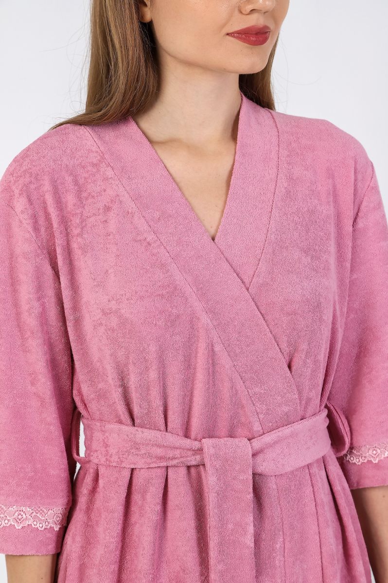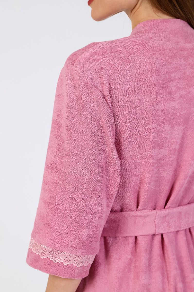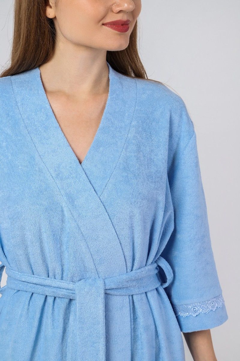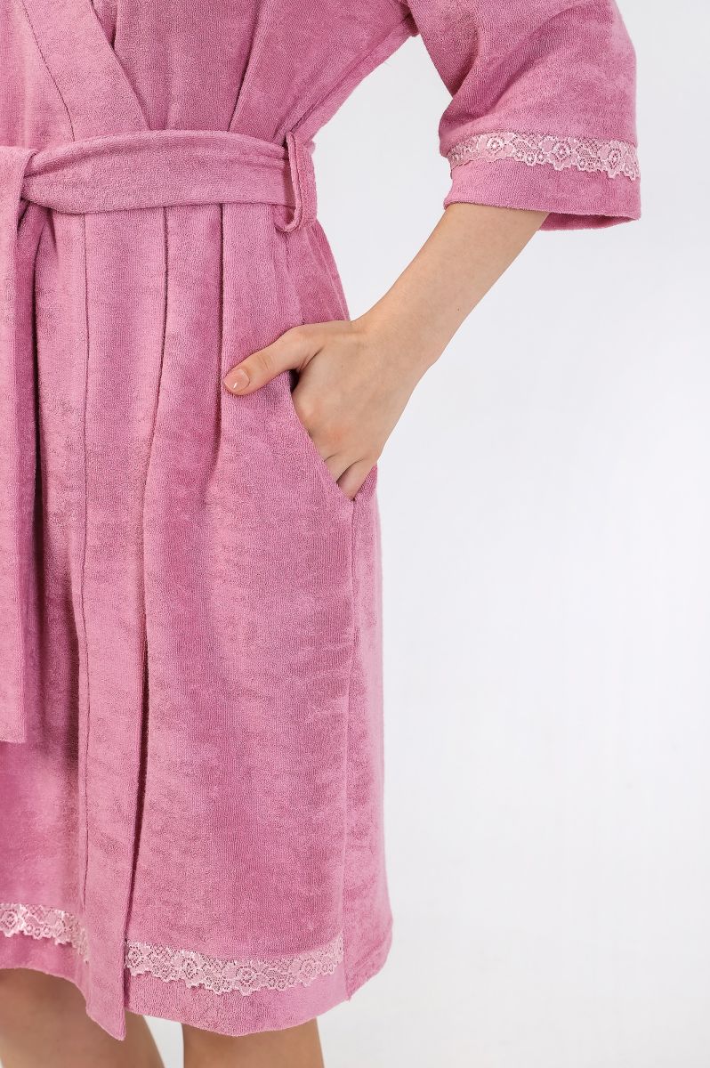 Халат молодежный из гладкокрашеного трикотажного махрового полотна, прямого силуэта, на запахе, с рукавами длиной ¾, карманами в боковых швах и съемным поясом, завязывающимся на талии и продетым в две шлевки, вставленные в боковые швы. Рукава и низ изделия отделаны кружевом. Борта и горловина обработаны притачной планкой
