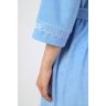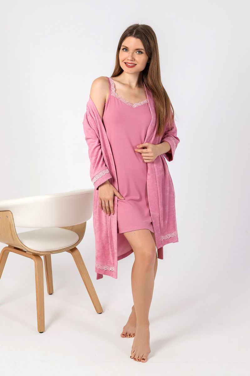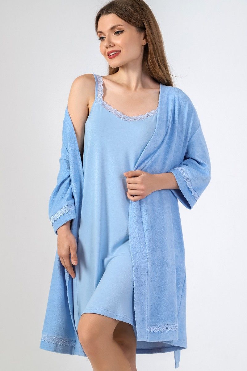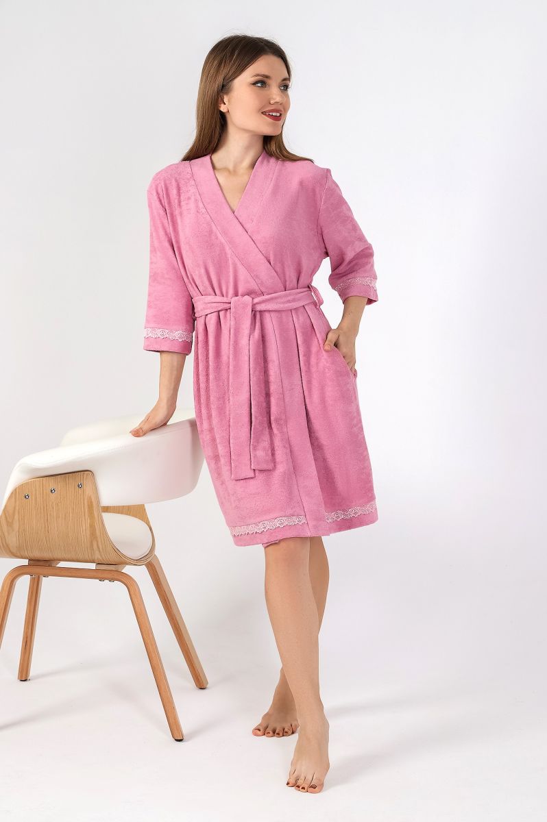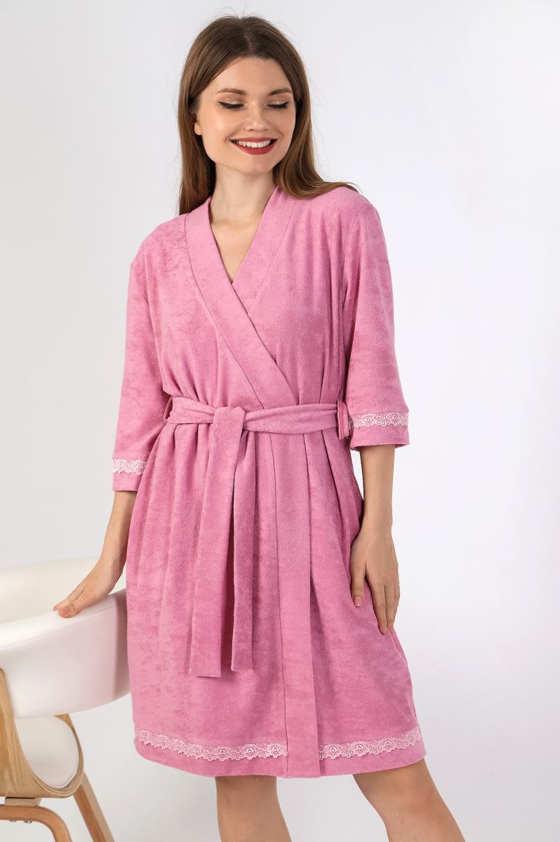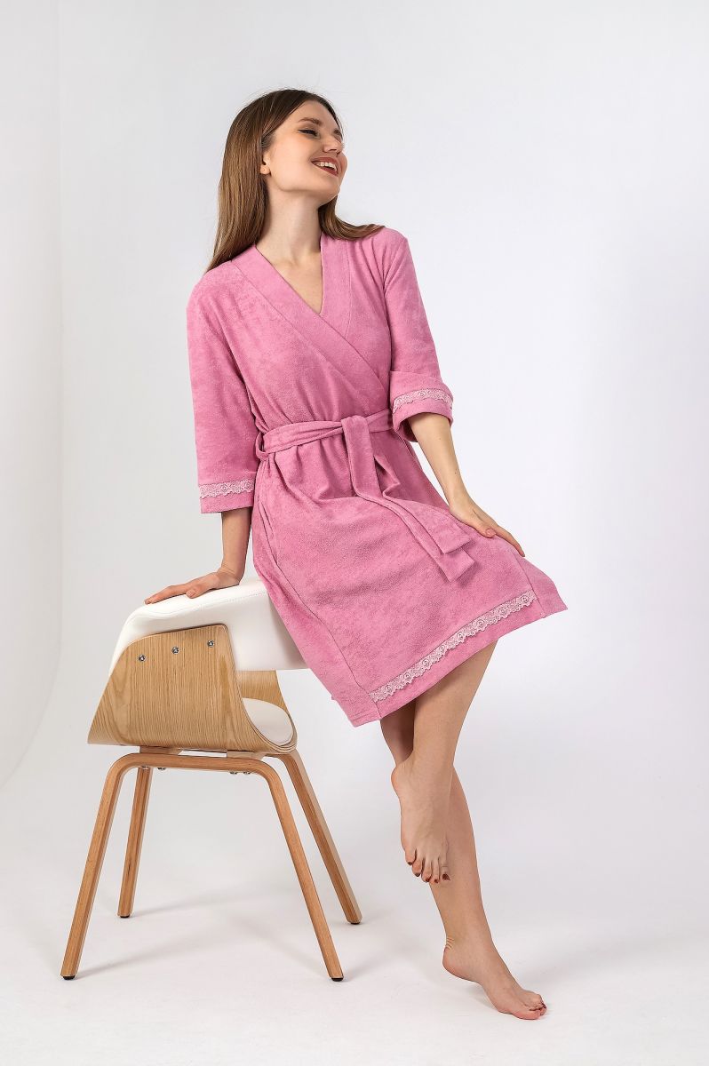 Халат молодежный из гладкокрашеного трикотажного махрового полотна, прямого силуэта, на запахе, с рукавами длиной ¾, карманами в боковых швах и съемным поясом, завязывающимся на талии и продетым в две шлевки, вставленные в боковые швы. Рукава и низ изделия отделаны кружевом. Борта и горловина обработаны притачной планкой