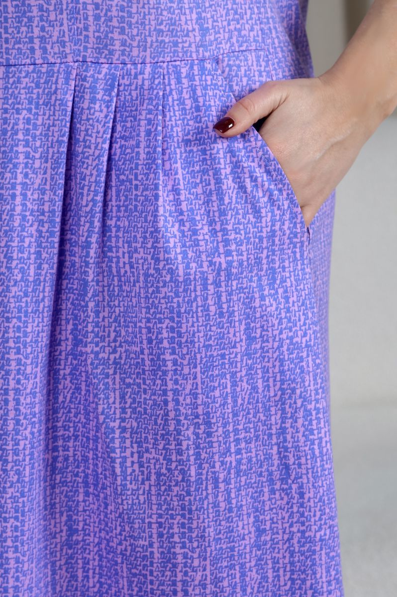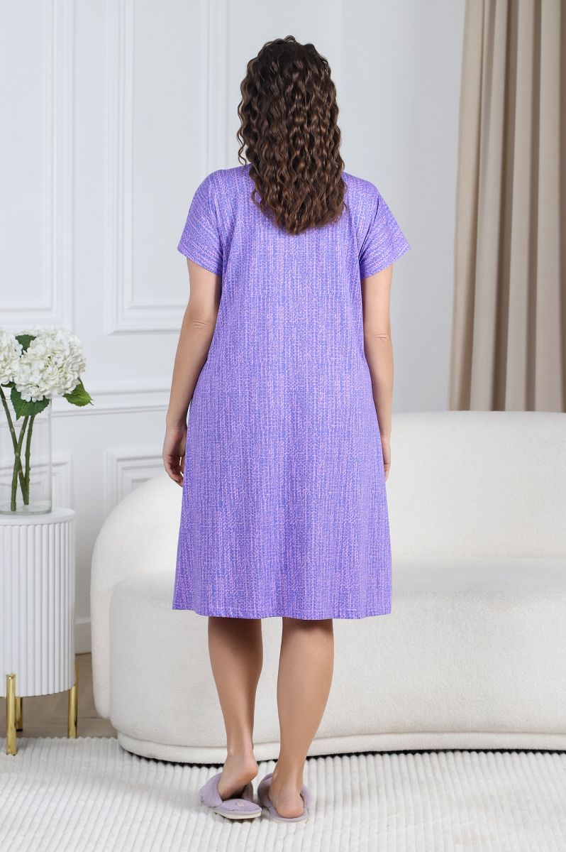 Халат женский из трикотажного полотна «кулирка» с набивным рисунком, расширенный книзу, с короткими цельнокроеными рукавами, отрезное по линии талии и присборенное по соединительному шву. На лифе выполнены рельефы.