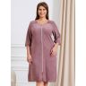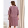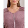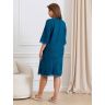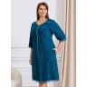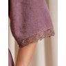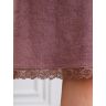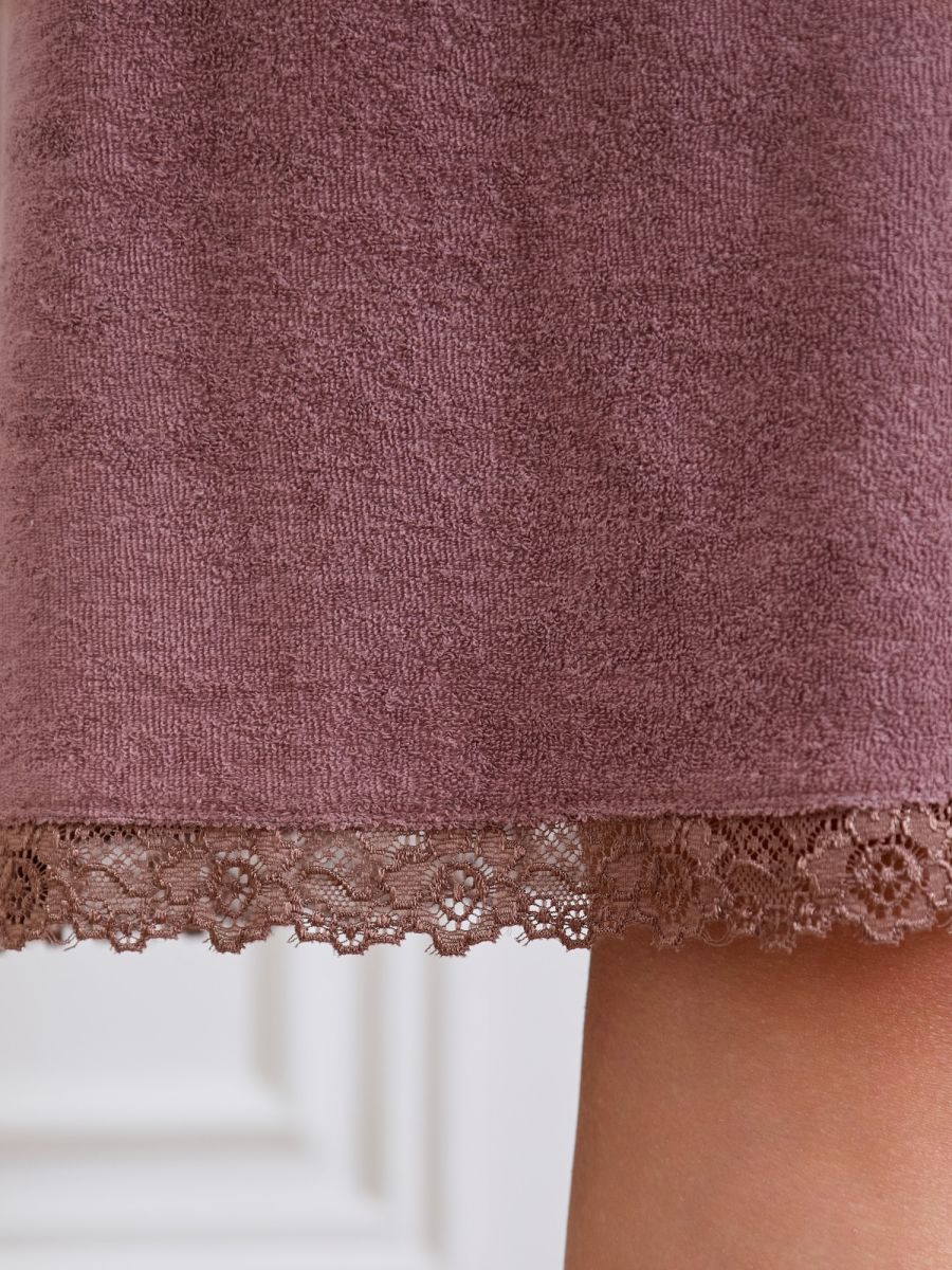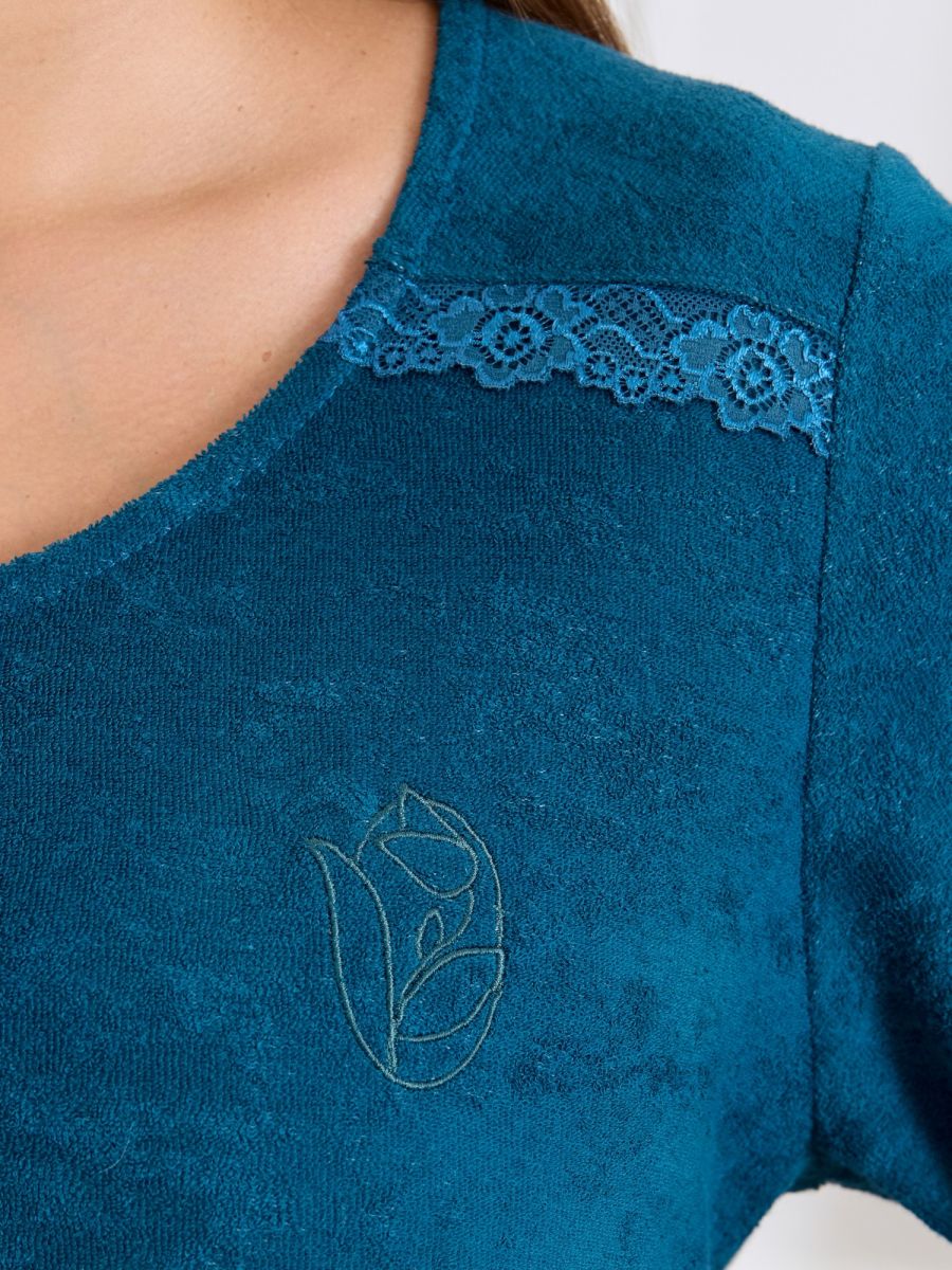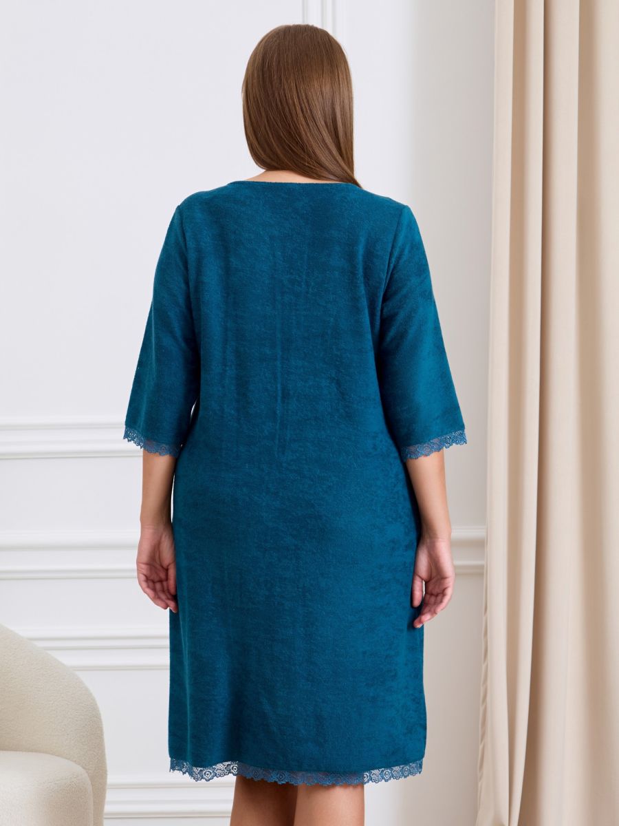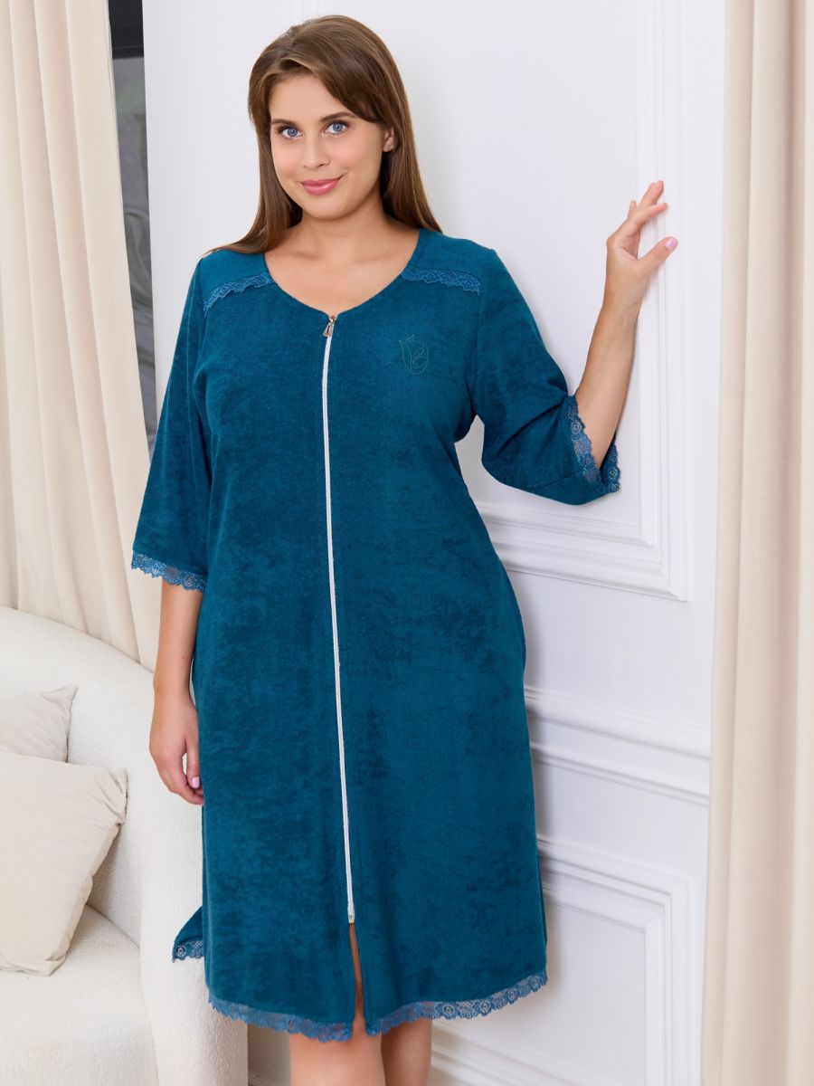 Халат женский из гладкокрашенного трикотажного махрового полотна, прямого силуэта, с горловиной овальной формы, втачными рукавами длиной ¾ длины, карманами в боковых швах и центральной бортовой застежкой на тесьму «молния». Полочка – с двумя небольшими косыми кокетками с кружевом в швах соединения кокеток с основными деталями, на левой полочке выполнена вышивка. Нижние срезы рукавов и нижние срезы изделия обработаны кружевом, в боковых швах разрезы.