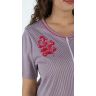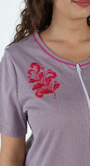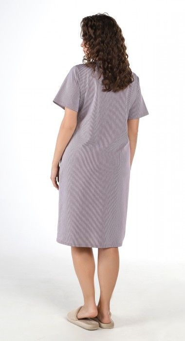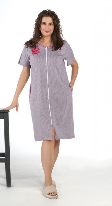 Халат из трикотажного полотна «кулирка» с набивным рисунком в полоску, прямого силуэта, с короткими втачными рукавами, горловиной овальной формы, карманами в боковых швах и центральной бортовой застежкой на тесьму «молния». Горловина и входы в карманы окантованы двойным кантом.
