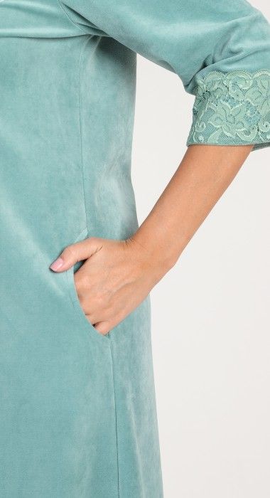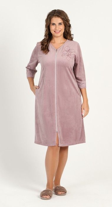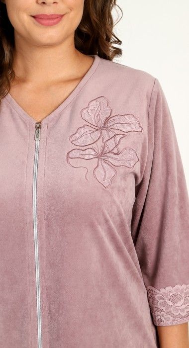 Халат женский из трикотажного полотна «вельмонд», прямого силуэта, с втачными рукавами длиной ¾, карманами в боковых швах, горловиной v-образной формы, переходящей в центральную бортовую застежку на тесьму «молния», с вышивкой на левой полочке и отделкой широким кружевом по низу рукавов.