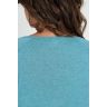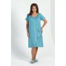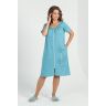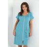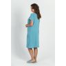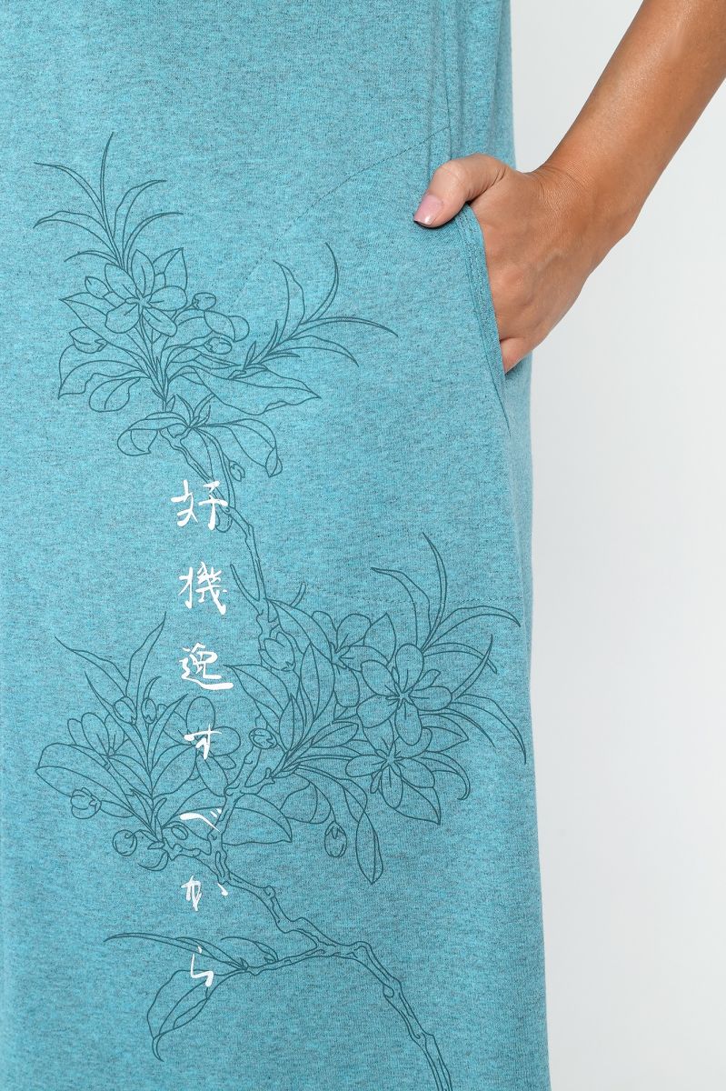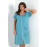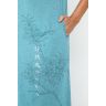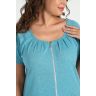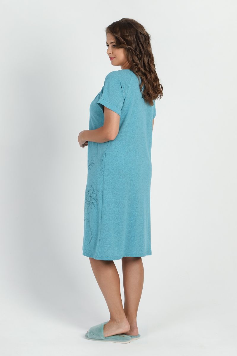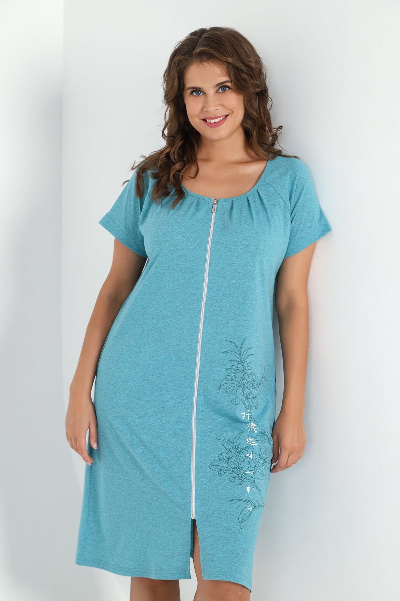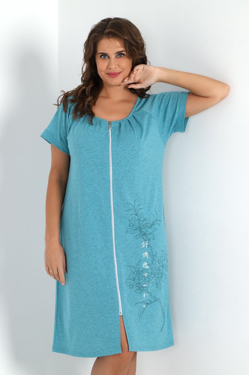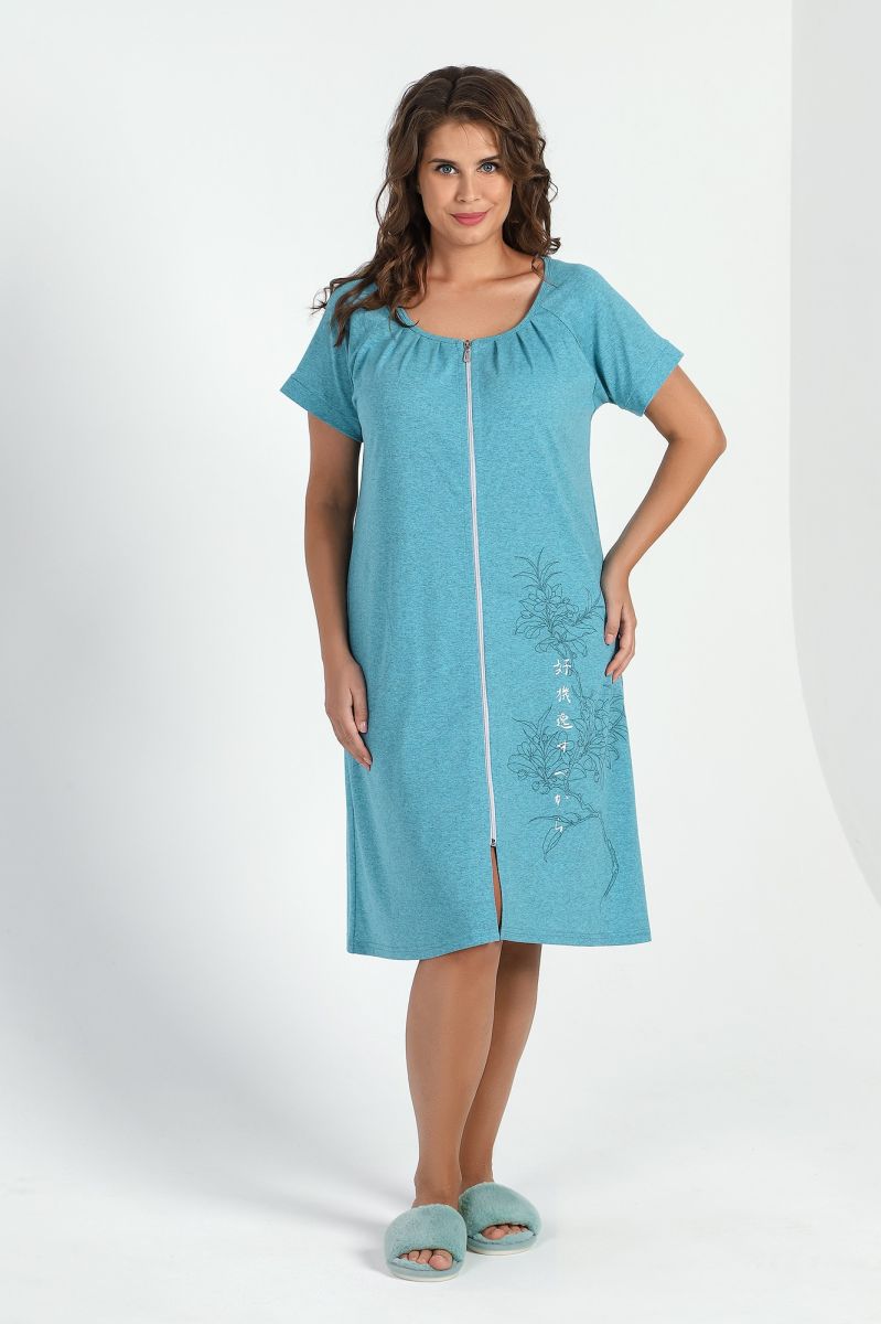 Халат женский из гладкокрашенного трикотажно полотна «кулирка» с меланжированным эффектом. Полуприталенного силуэта, с короткими рукавами покроя «реглан» и горловиной овальной формы, окантованной основным материалом, с центральной бортовой застежкой на тесьму «молния». По срезу горловины выполнены неглубокие складки, нижние резы рукавов обработаны притачными манжетами. На полочке принт, выполненный в технике «шелкографии».