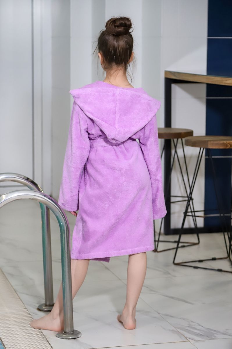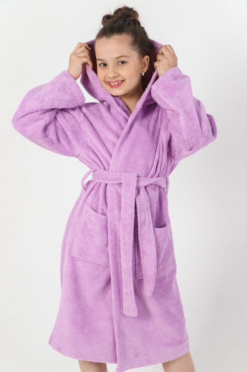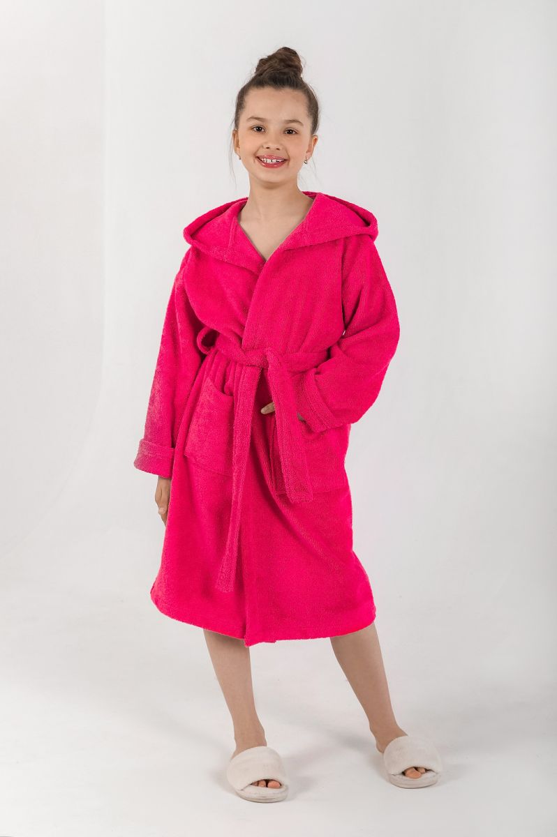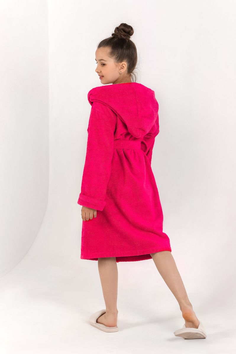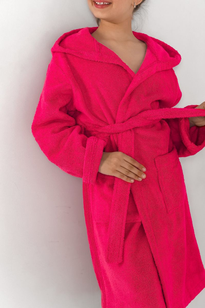 Халат для девочки из двустороннего махрового хлопкового полотна. Модель на запах, с капюшоном, с поясом в шлёвках с петлей-вешалкой по горловине спинки, с боковыми карманами.