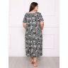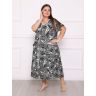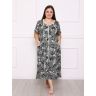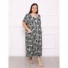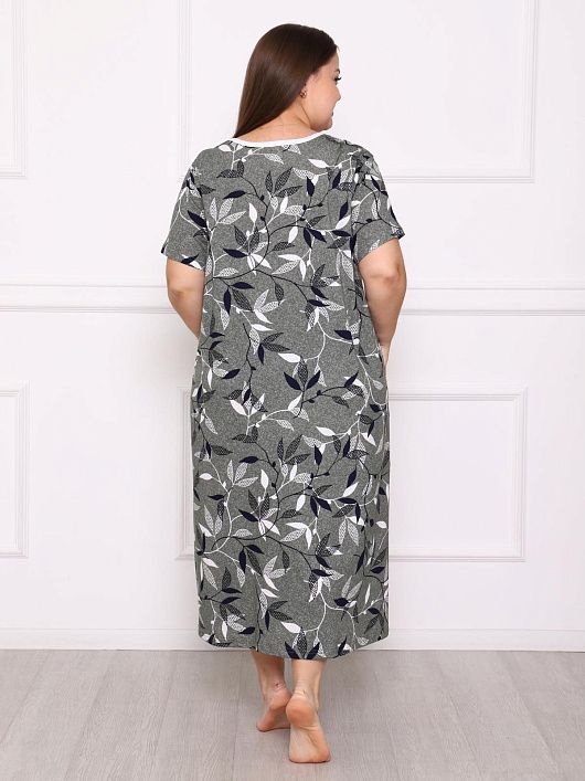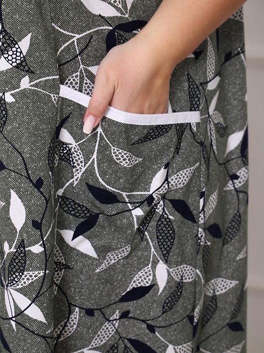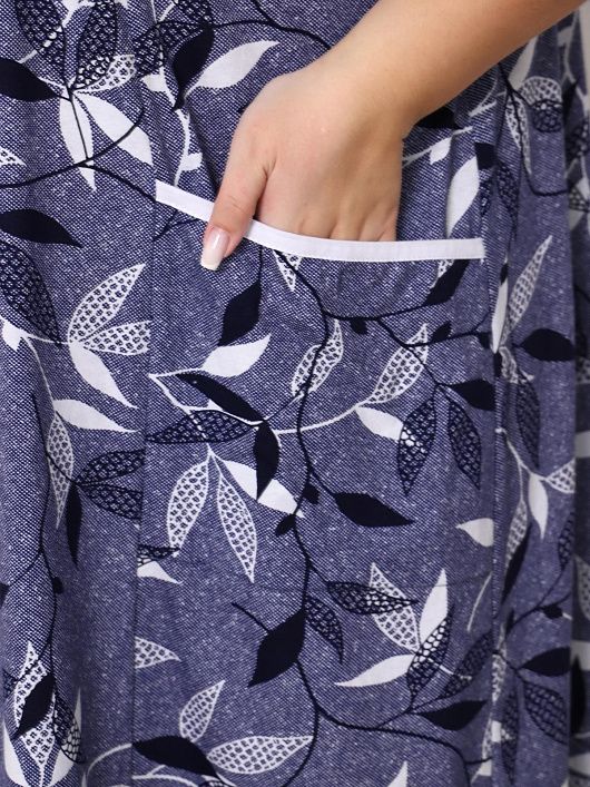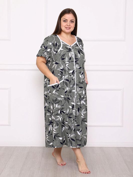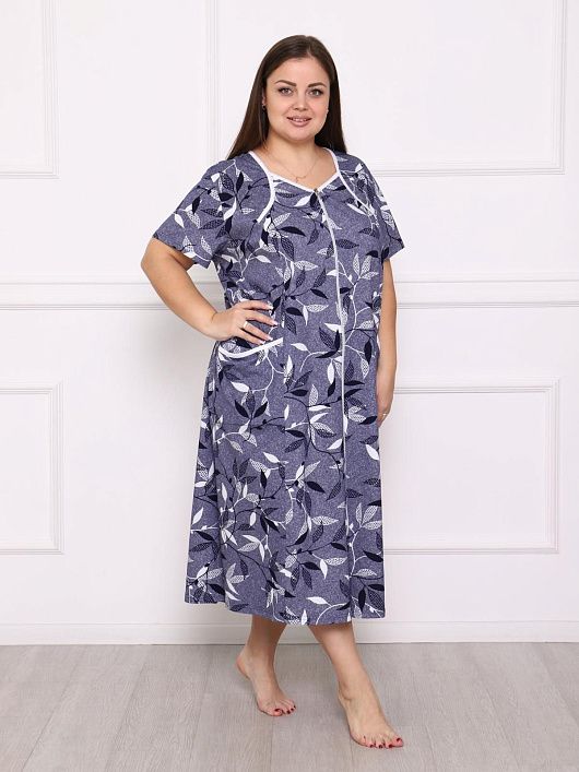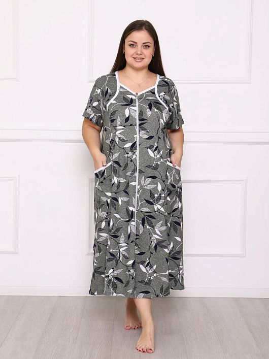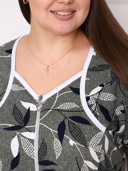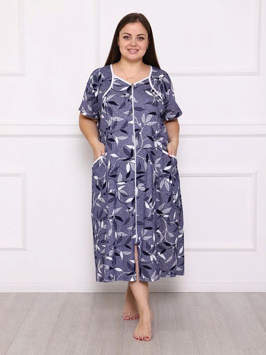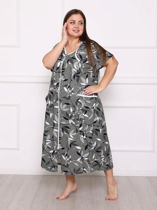 Халат женский, прямого силуэта, длинной ниже колена, с центральной застежкой встык на разъемную молнию. Рукав втачной, короткий. Вырез горловины фигурный, переходящий в кокетку. Полочка с фигурным рельефом, смещенным от центра груди и проходящим от середины проймы до линии низа. В отрезном бочке полочки расположен накладной карман. Фигурные срезы кокеток полочки, горловины и верхние срезы карманов обработаны однотонной окантовкой.
