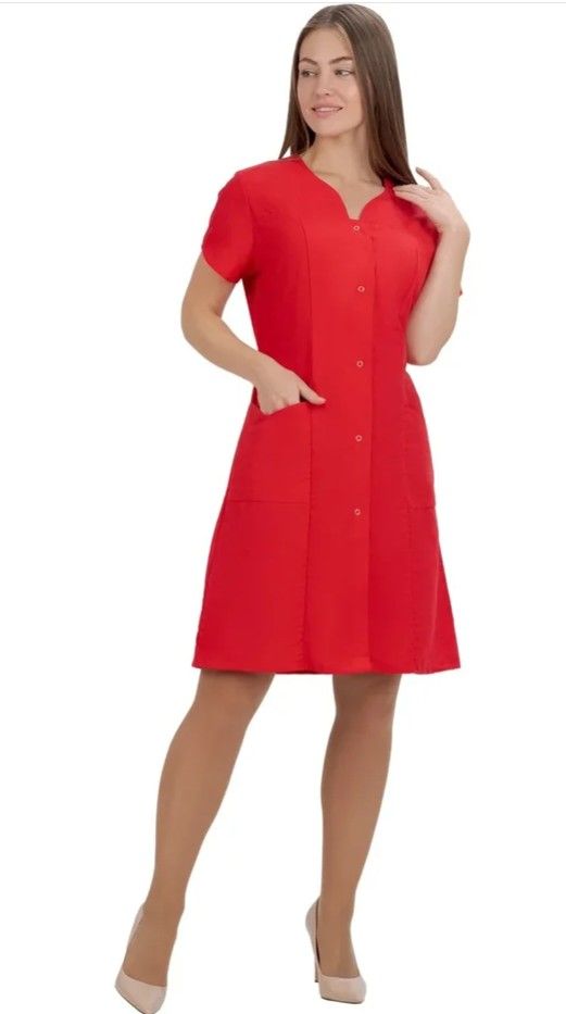 Халат медицинский женский прямого силуэта, средней длины с застежкой на кнопки. Рукав короткий. Халат предназначен для медицинских работников и СПА салонов.