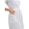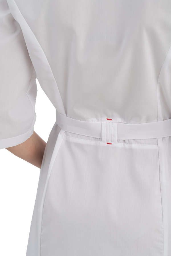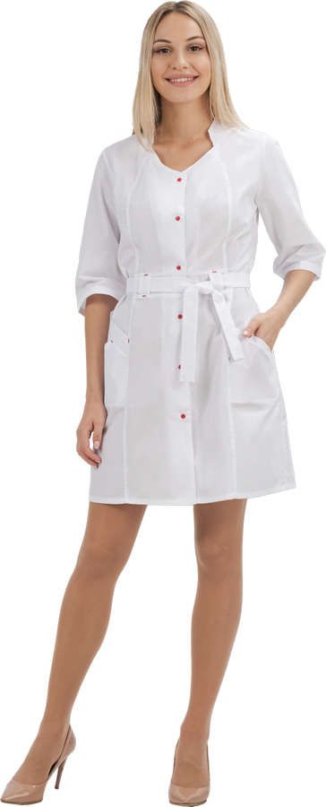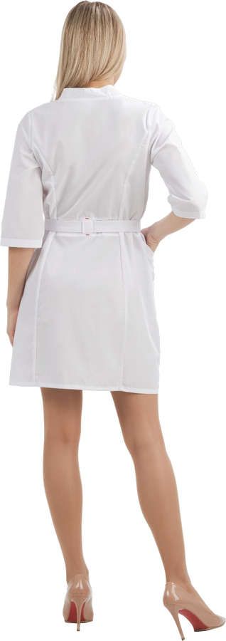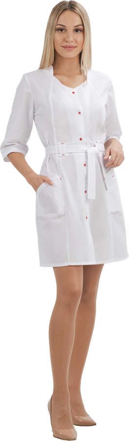 Халат медицинский женский "Муза" полуприлегающего силуэта с втачным рукавом, длиной ¾. Горловина халата оформлена стойкой до рельефов полочки, а центральная бортовая застежка на контрастные кнопки. Прилегание халата дополнительно регулируется поясом, фиксированным шлевками. На халате установлены декоративные закрепки в цвет кнопок. Элегантный и стильный халат предназначен для медицинских работников.