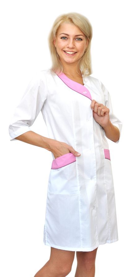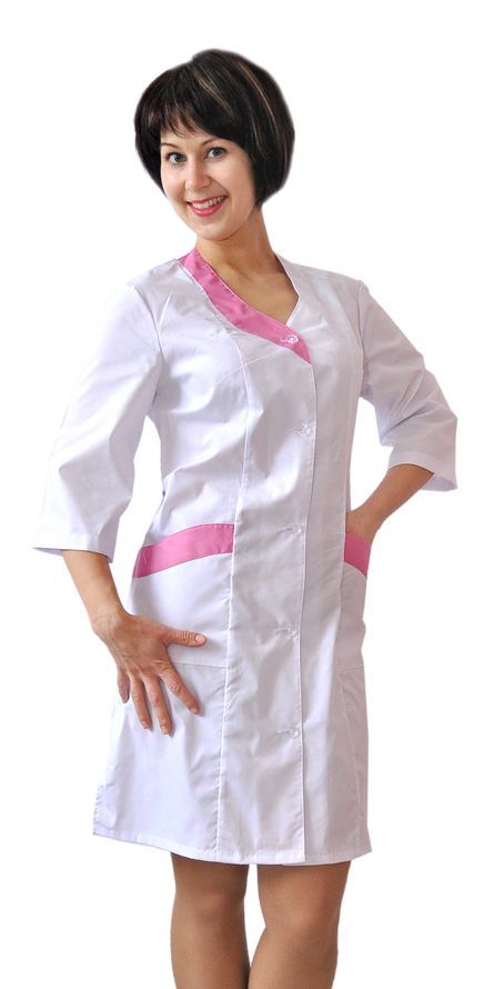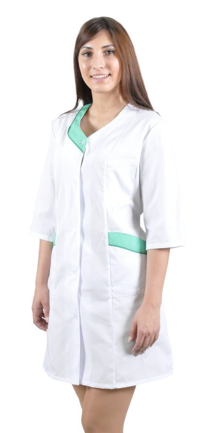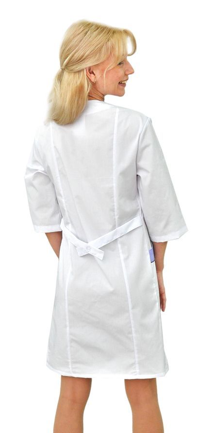 Халат приталенного силуэта, длиной чуть выше колена. Полочка с рельефными швами, с боковыми карманами, с отделкой по правой стороне выреза горловины и по верхнему краю карманов из материала контрастного цвета и канта. Застежка на пуговицы. на спинке завязывающийся пояс. Рукава длиной ¾.