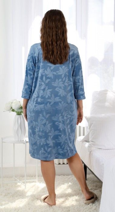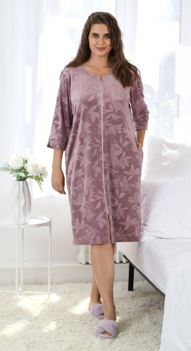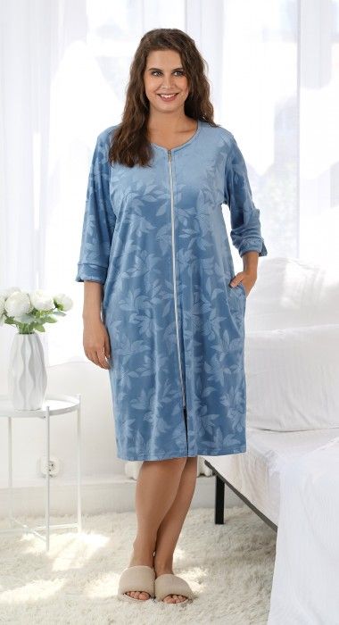 Халат женский из гладкокрашеного полотна «вельмонд», прямого силуэта, с втачными рукавами ¾ длины, карманами в боковых швах, овальной горловиной и центральной бортовой застежкой на тесьму «молния». Рукава – с фигурными притачными манжетами.