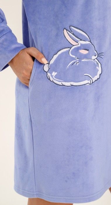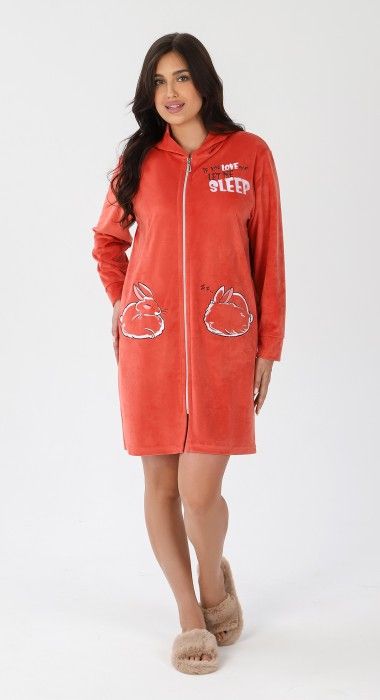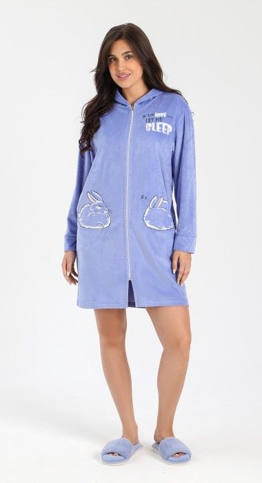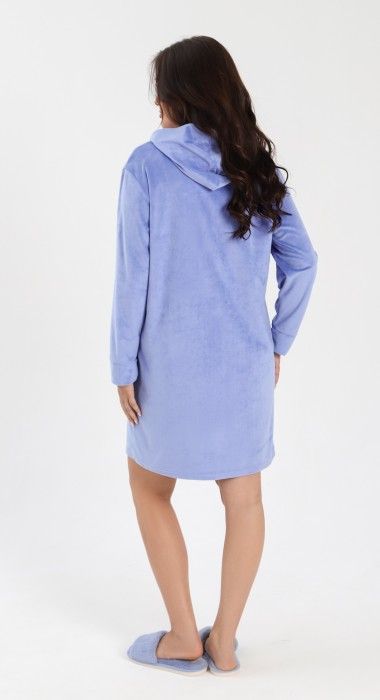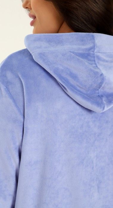 Халат молодежный из трикотажного полотна «вельмонд», прямого силуэта, с длинными втачными рукавами, капюшоном, карманами в боковых швах, и центральной бортовой застежкой на тесьму «молния». В области карманов и в верхней части левой полочки выполнена вышивка – аппликация.