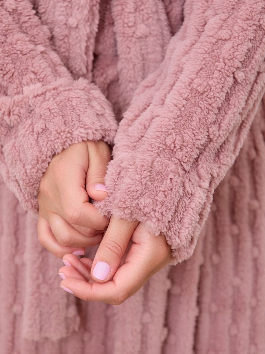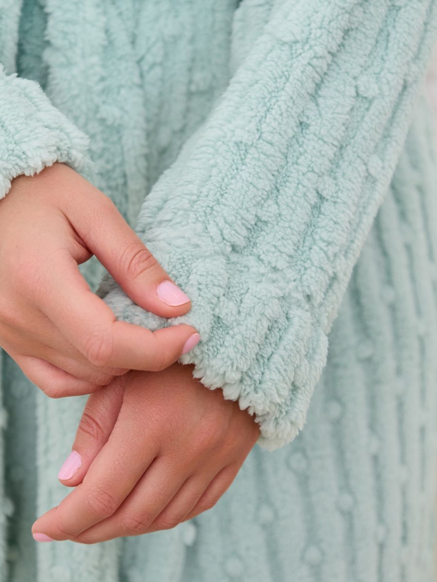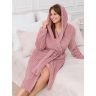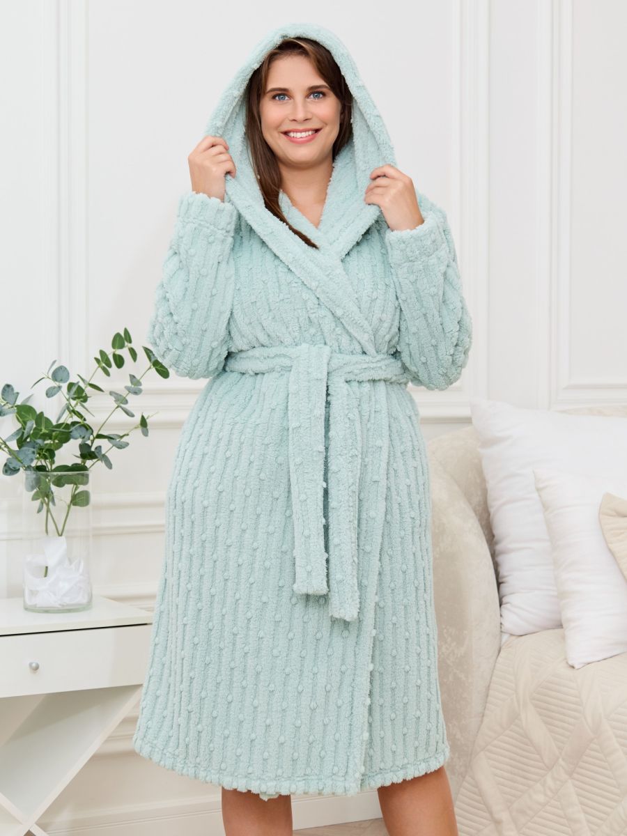 Халат женский из гладкокрашенного трикотажного полотна «велсофт» со стриженым рисунком, прямого силуэта, на запахе, с длинными втачными рукавами, капюшоном, карманами в боковых швах и съемным поясом, фиксирующимся на талии двумя шлевками в боковых швах.