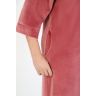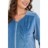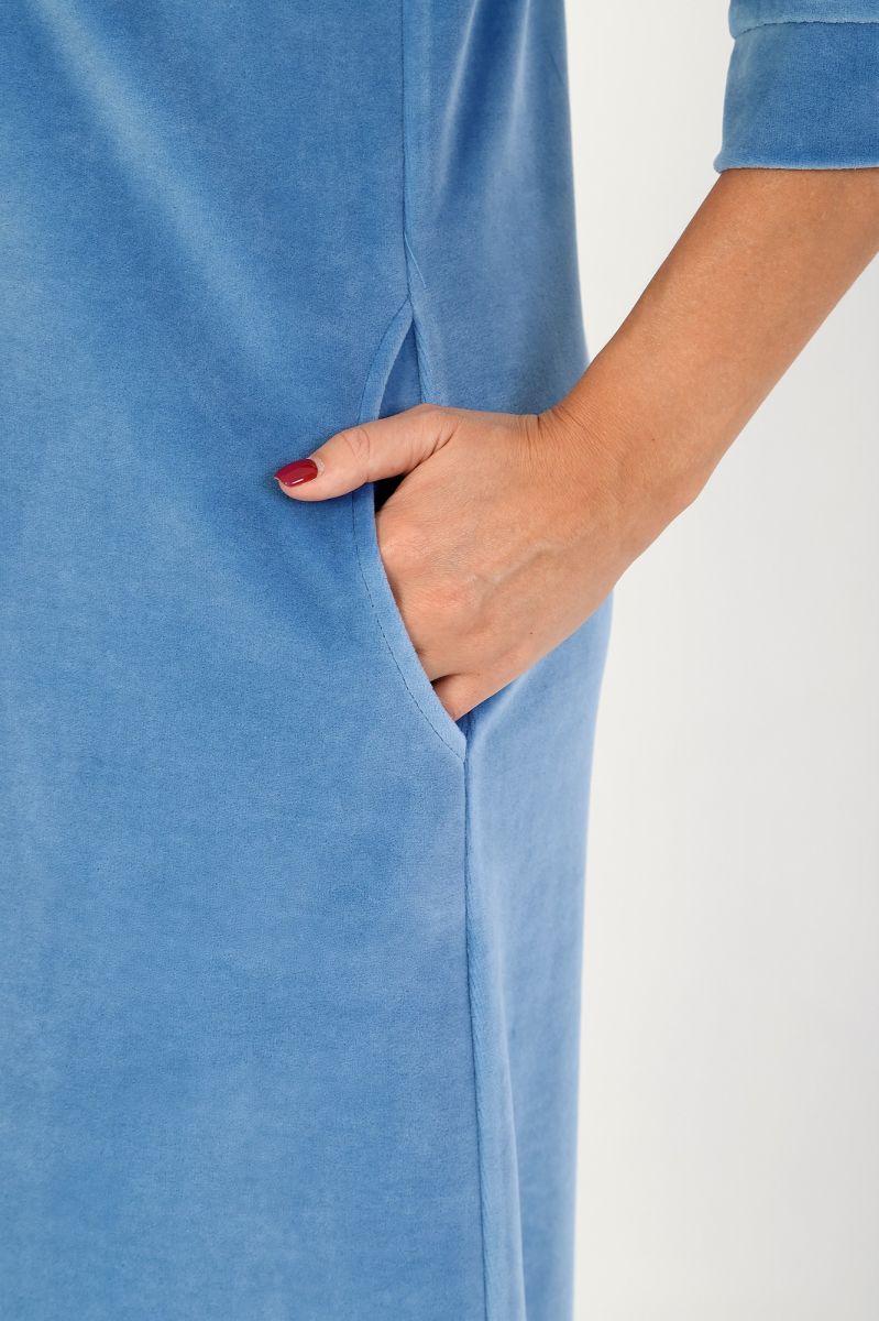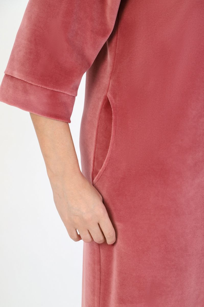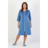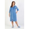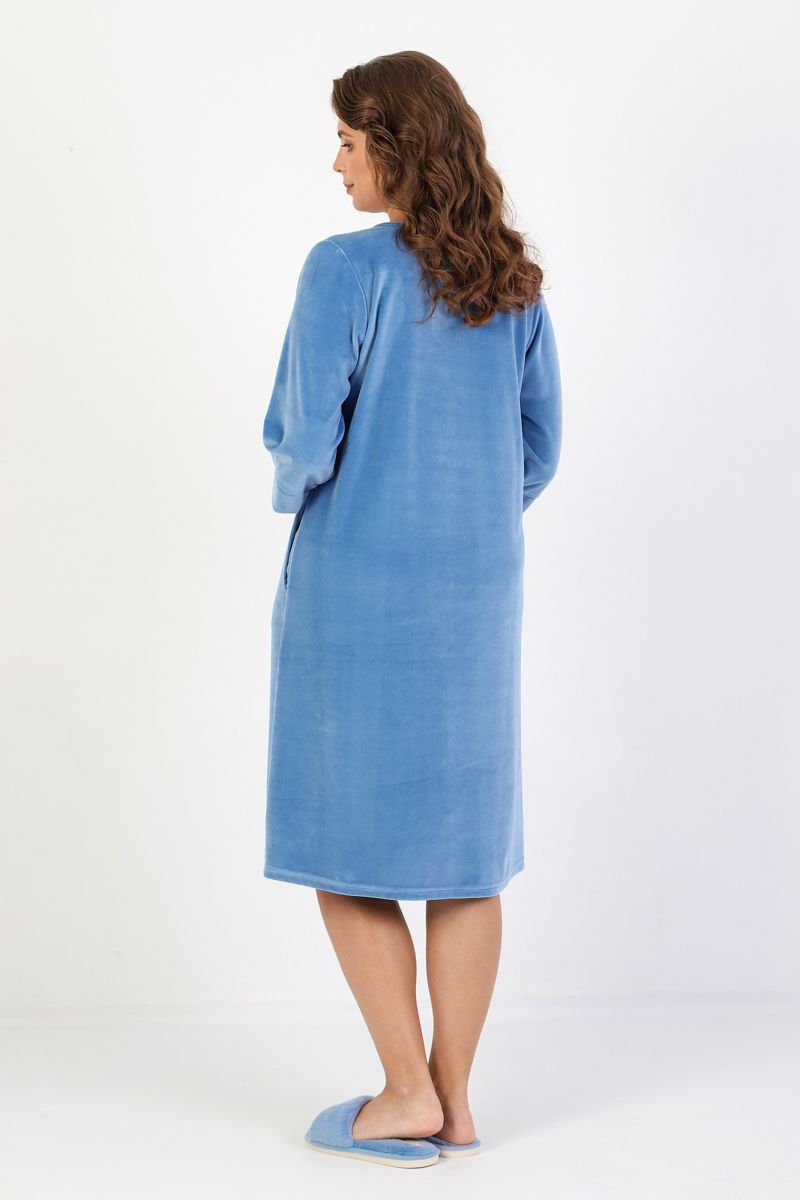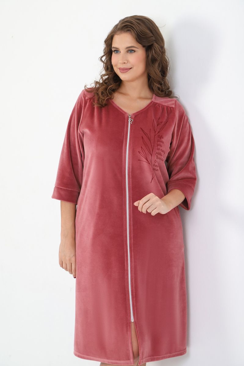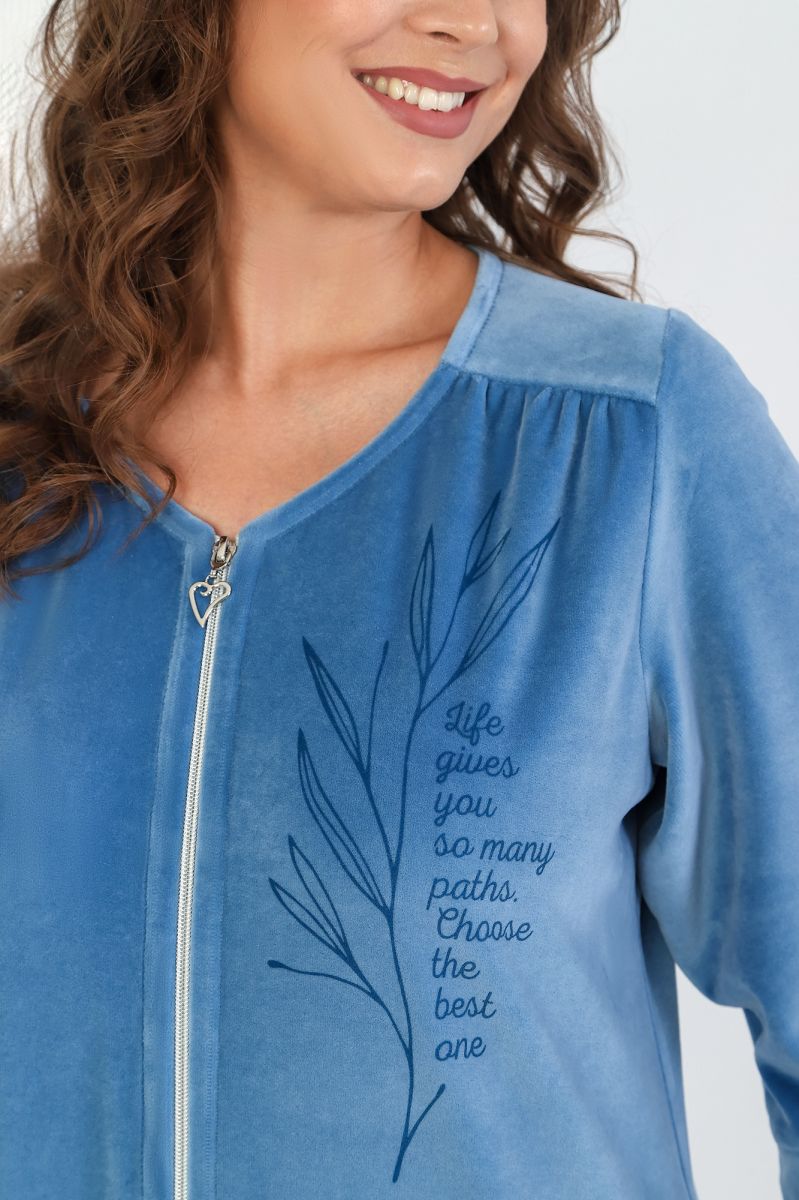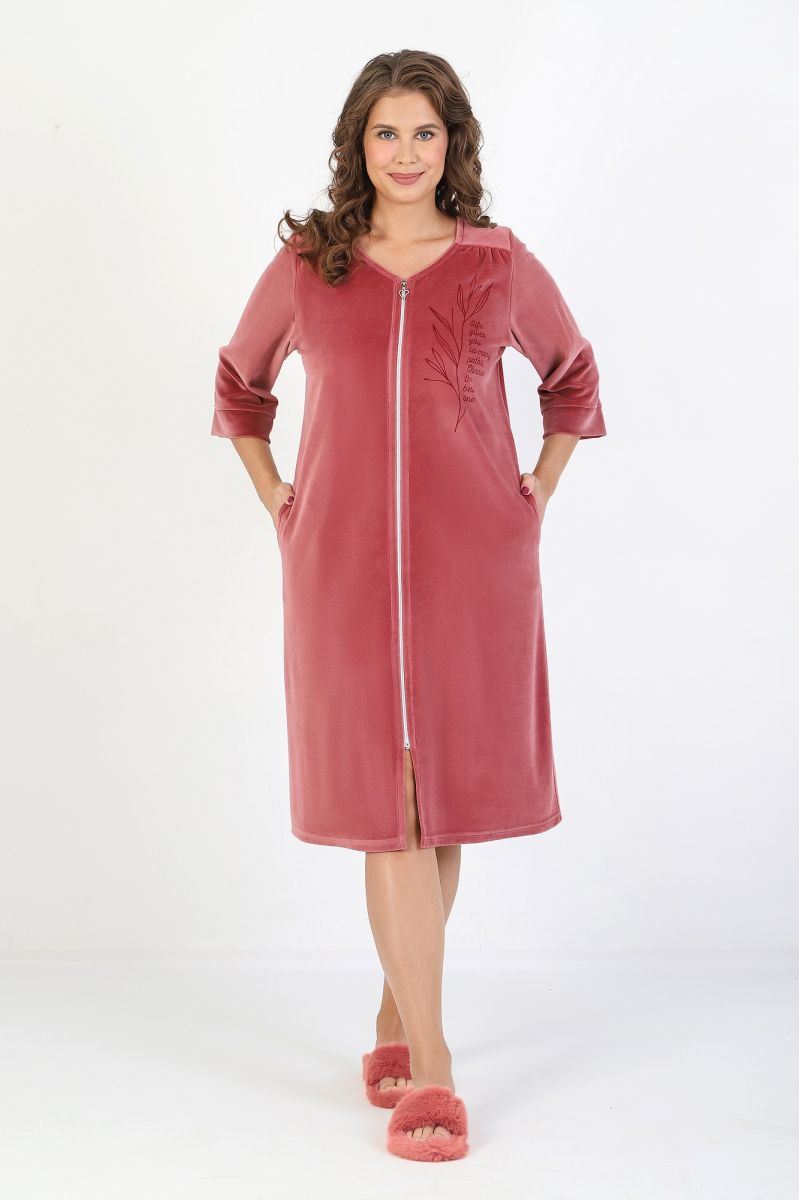 Халат женский из гладкокрашеного полотна «велюр», слегка расширенный книзу, с втачными рукавами ¾ длины, карманами в боковых швах, горловиной V-образной формы, центральной бортовой застежкой на тесьму «молния» и принтом на полочках, выполненным в технике «шелкографии».