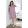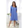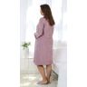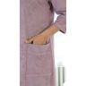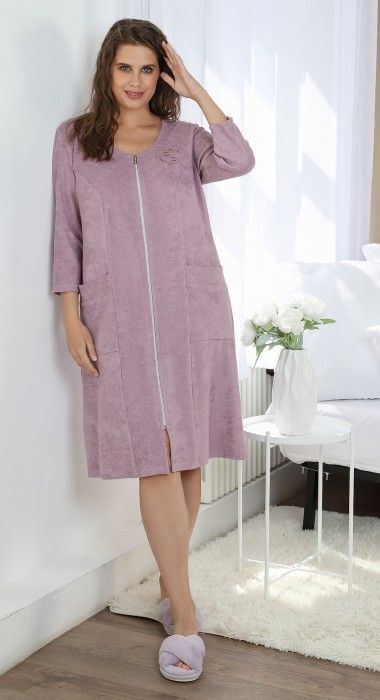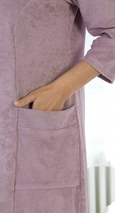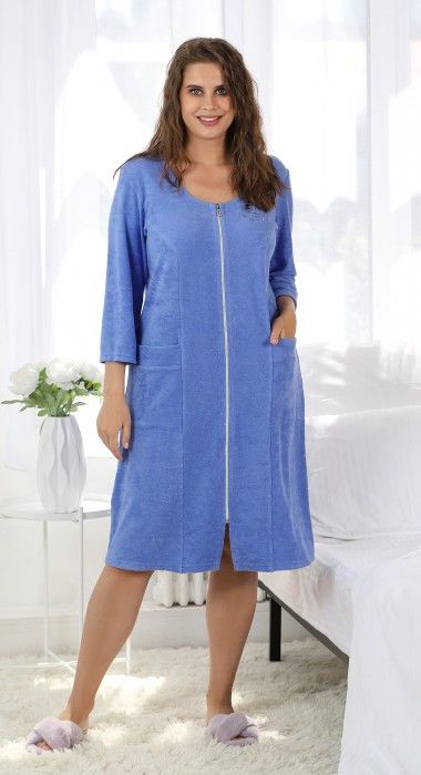 Халат женский из гладкокрашенного трикотажного полотна «махра», прямого силуэта, с рукавами ¾, горловиной овальной формы, двумя накладными карманами на уровне бедер и центральной бортовой застежкой на тесьму «молния». Полочка – с рельефными швами, выходящими из пройм, в верхней части левой полочки вышивка.
