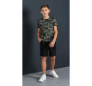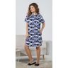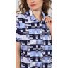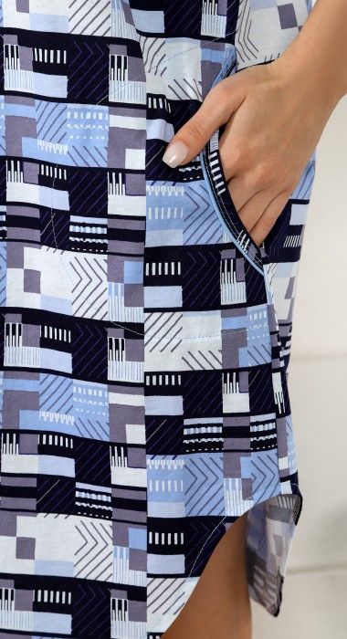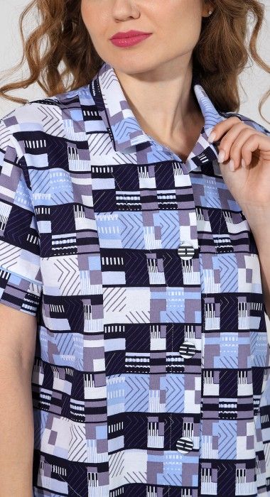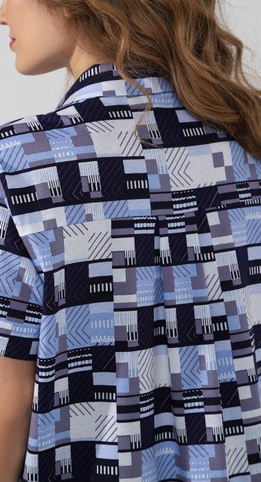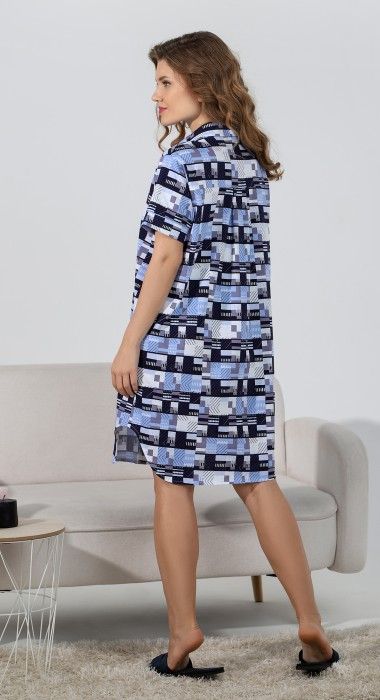 Халат из трикотажного полотна «кулирка» с набивным рисунком, прямого силуэта, с короткими втачными рукавами, стояче-отложным воротником, карманами в боковых швах и центральной бортовой застежкой на петли и пуговицы и фигурной линией низа. Входы в карманы обработаны двойным кантом. Низ рукавов – с притачными манжетами и узким кантом контрастного цвета в соединительных швах. Спинка – с притачной кокеткой и бантовой складкой в центре соединительного шва. Кокетка спинки и притачные манжеты рукавов выкроены по косой.