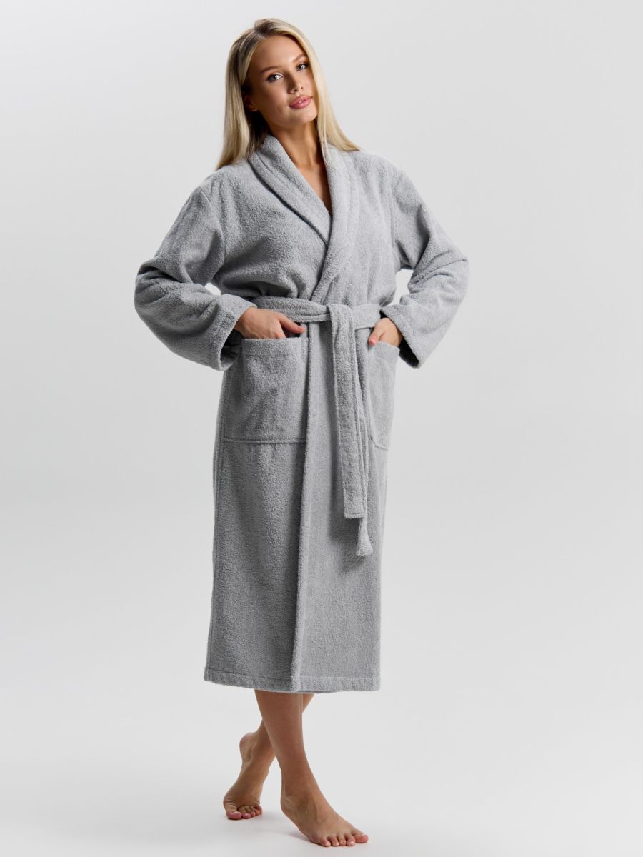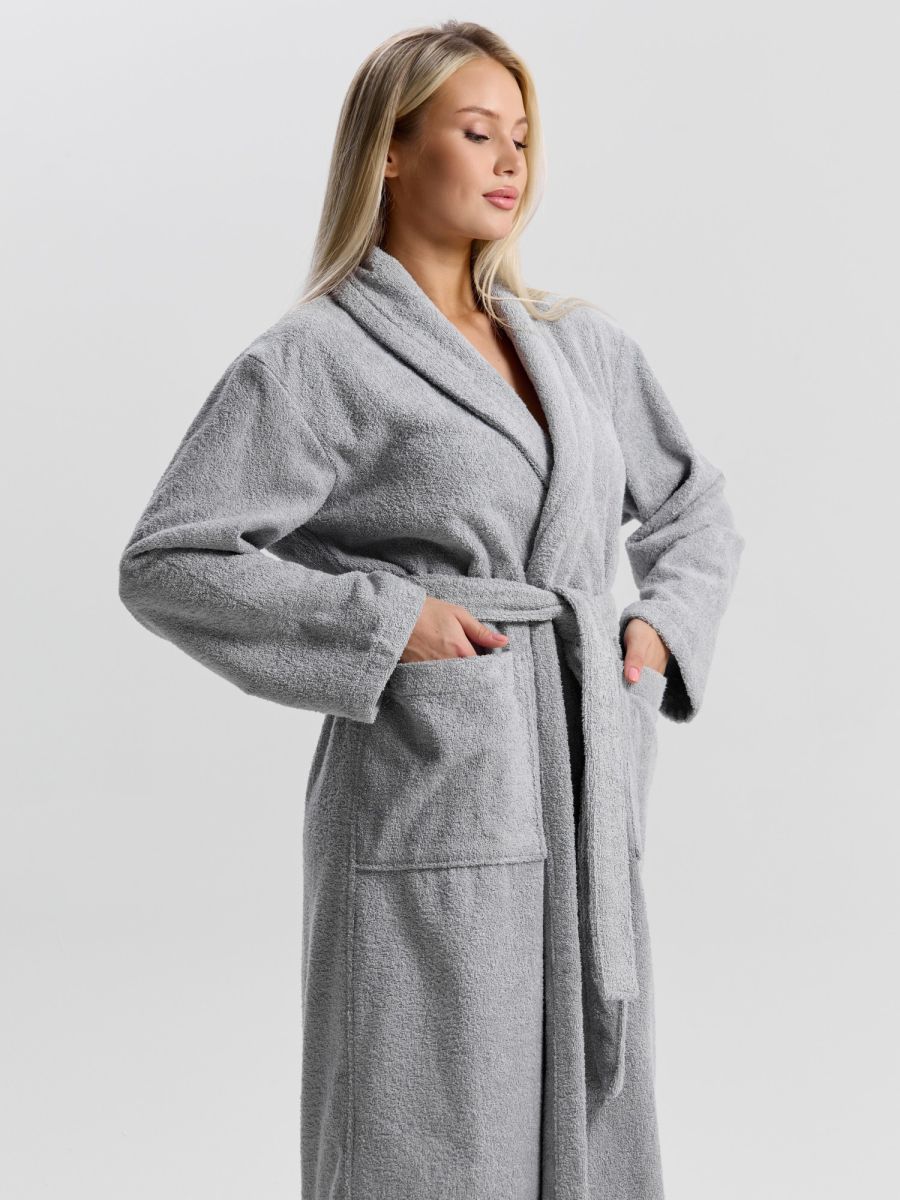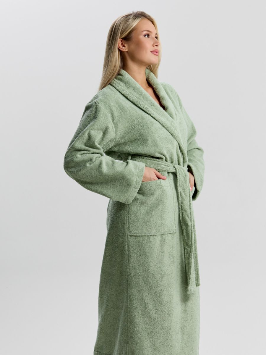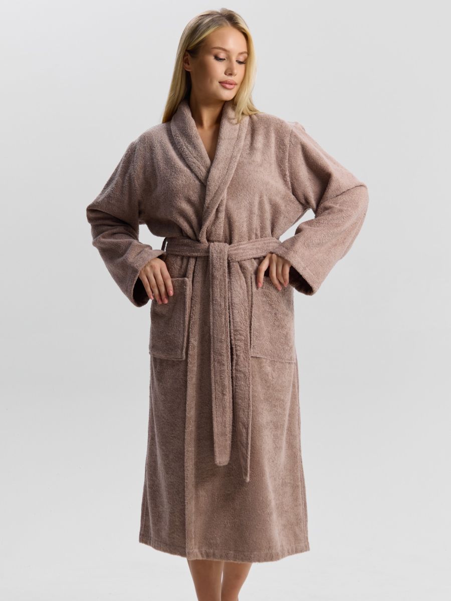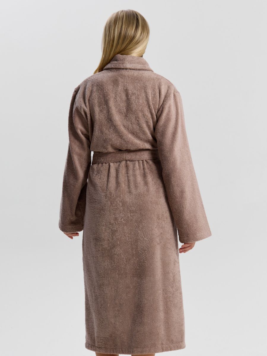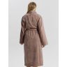 Женский халат из двустороннего махрового хлопкового полотна. Модель на запах, с поясом в шлёвках, с боковыми карманами, с воротником "шаль", с петлей-вешалкой по горловине спинки.