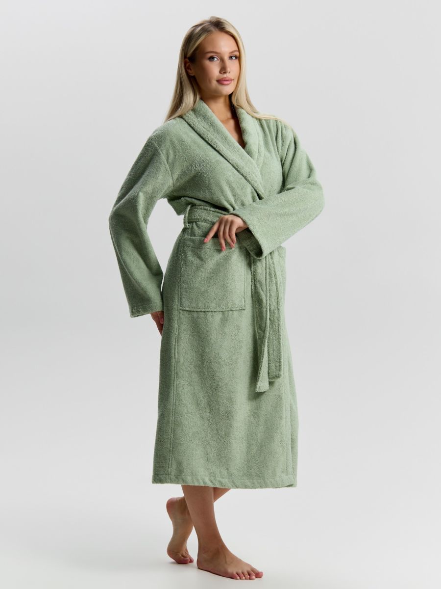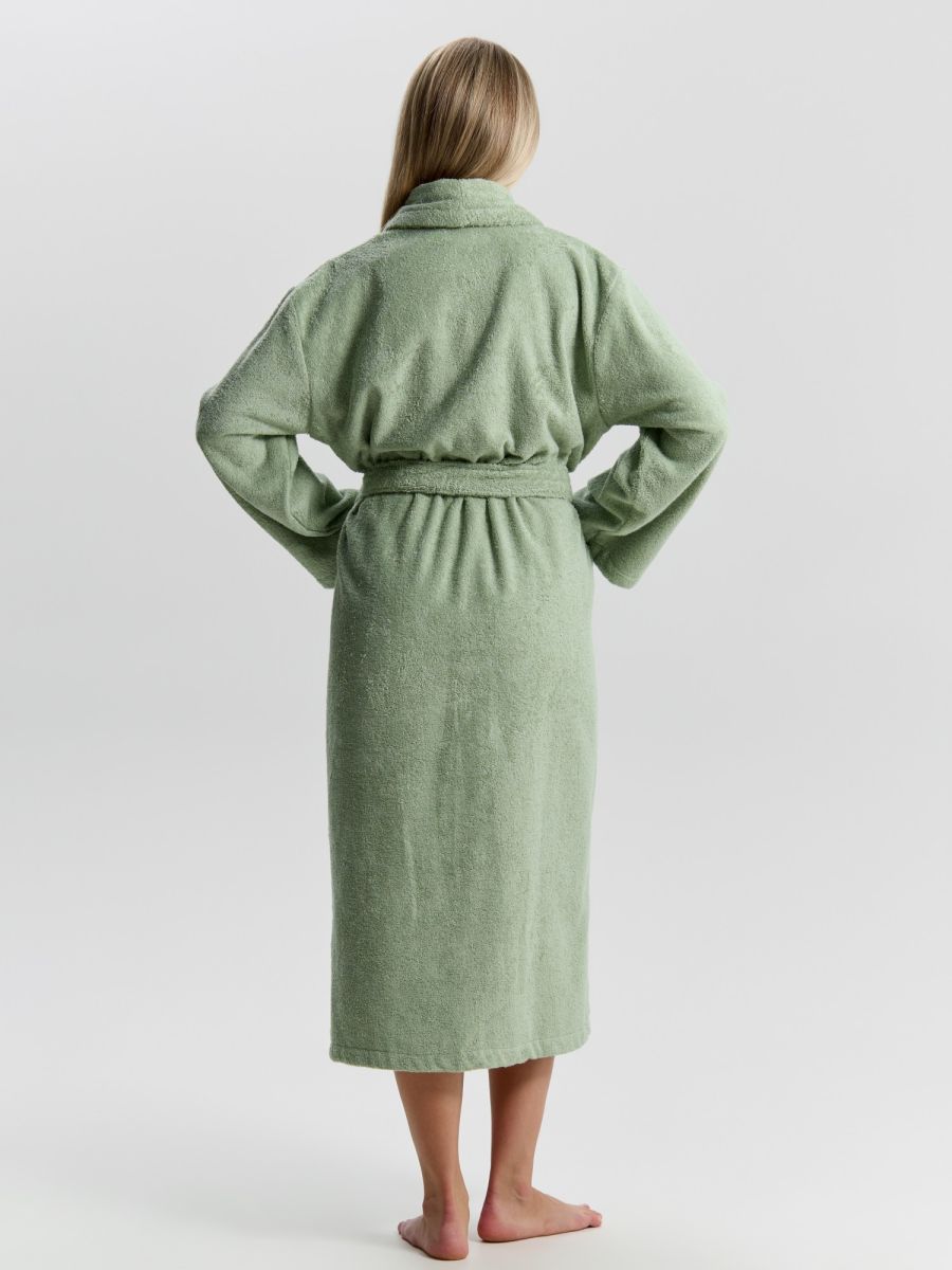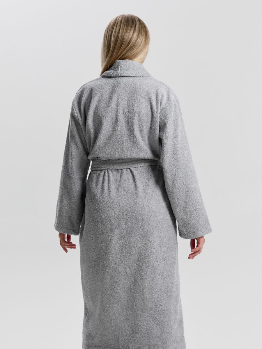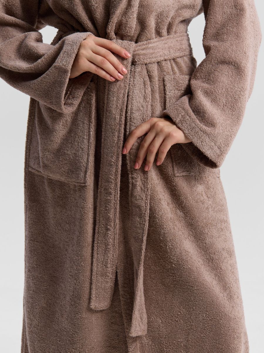 Женский халат из двустороннего махрового хлопкового полотна. Модель на запах, с поясом в шлёвках, с боковыми карманами, с воротником "шаль", с петлей-вешалкой по горловине спинки.