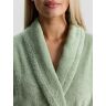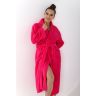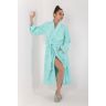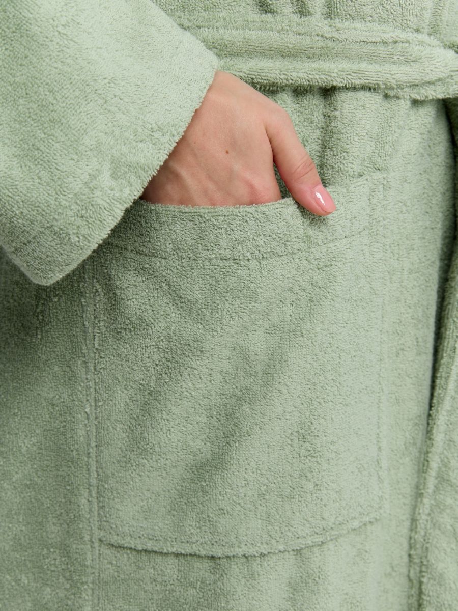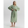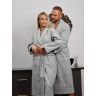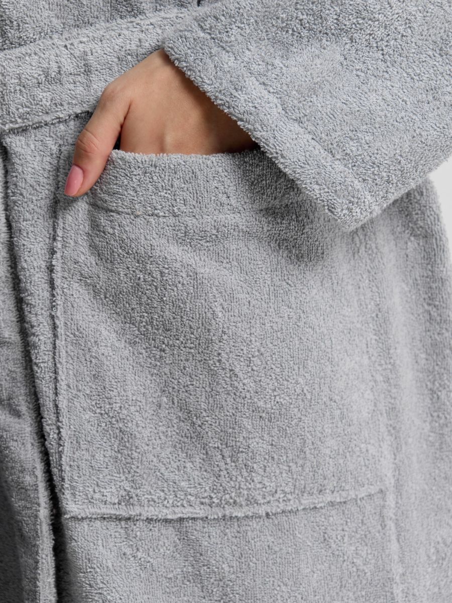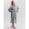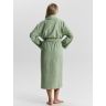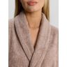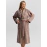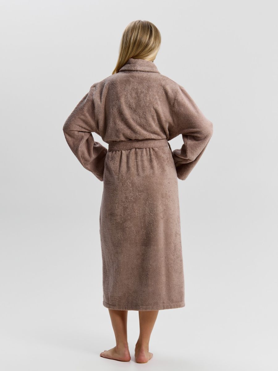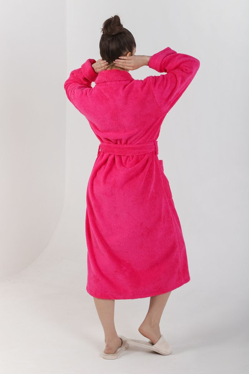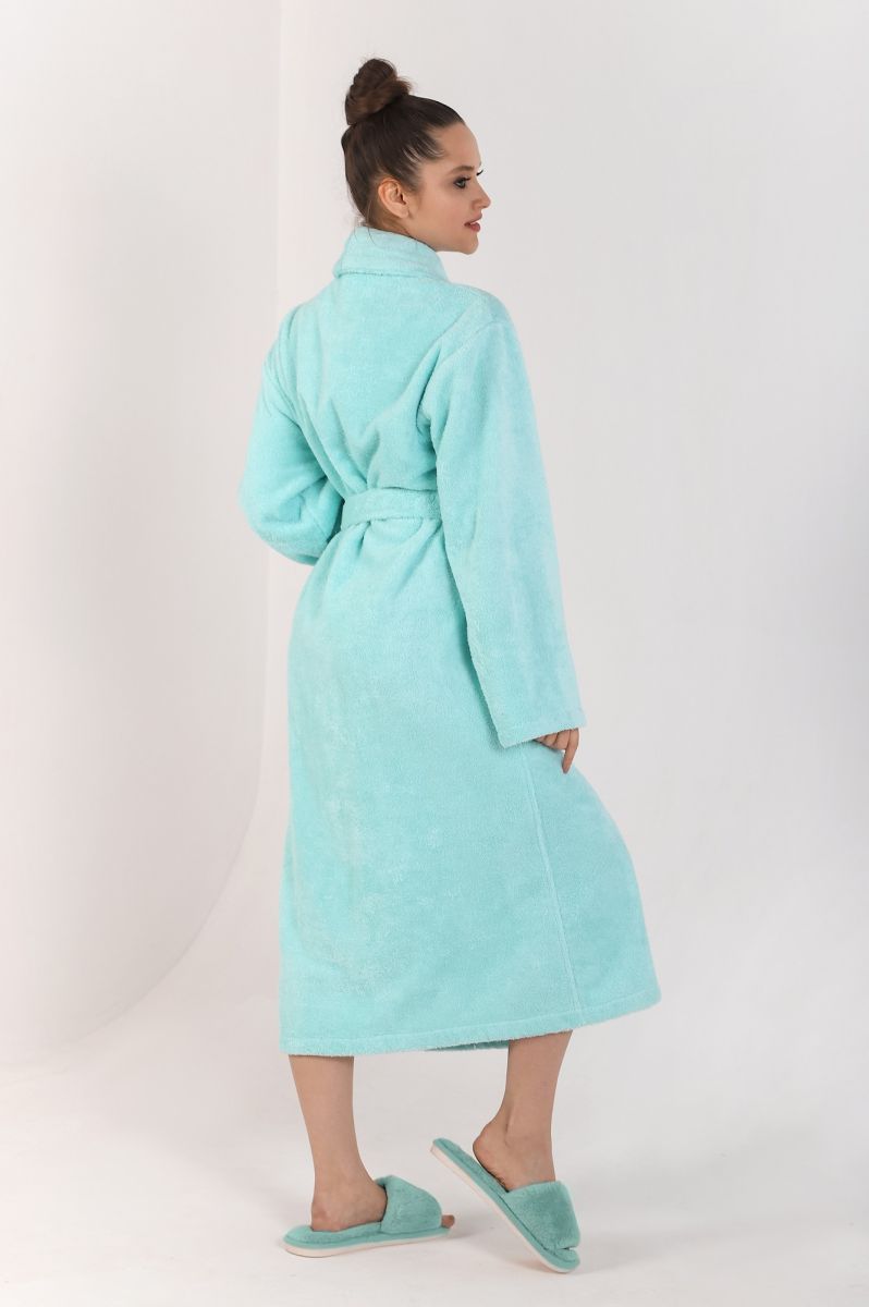 Женский халат из двустороннего махрового хлопкового полотна. Модель на запах, с поясом в шлёвках, с боковыми карманами, с воротником "шаль", с петлей-вешалкой по горловине спинки.