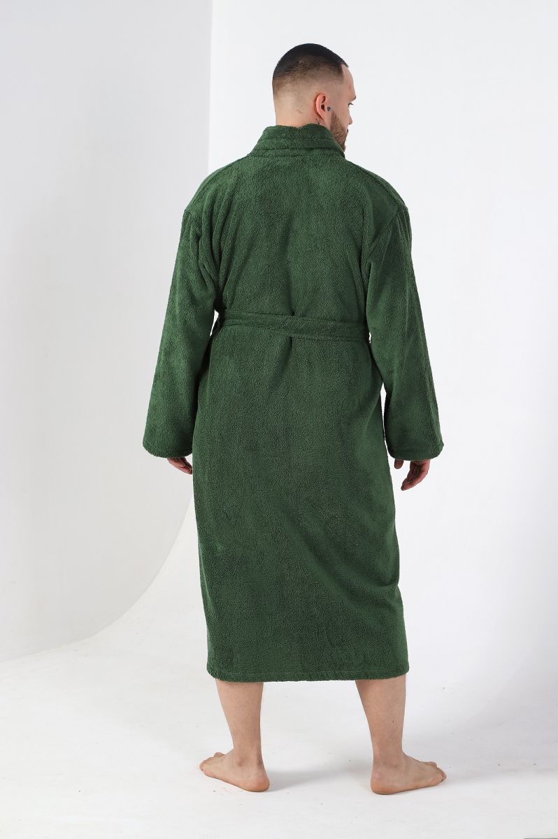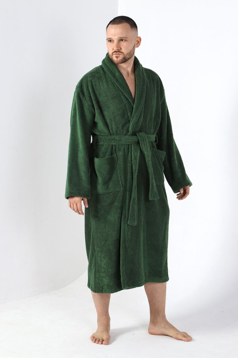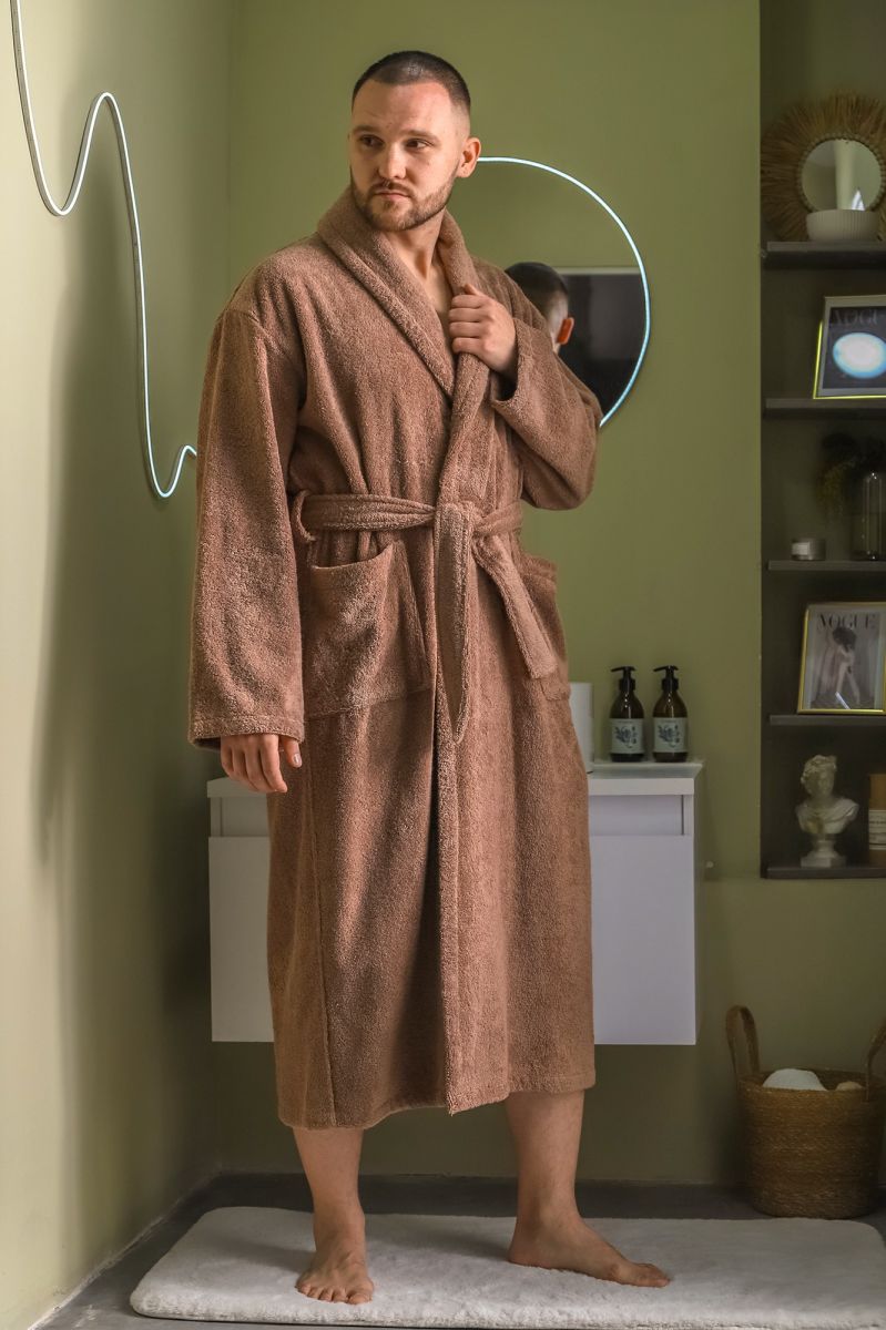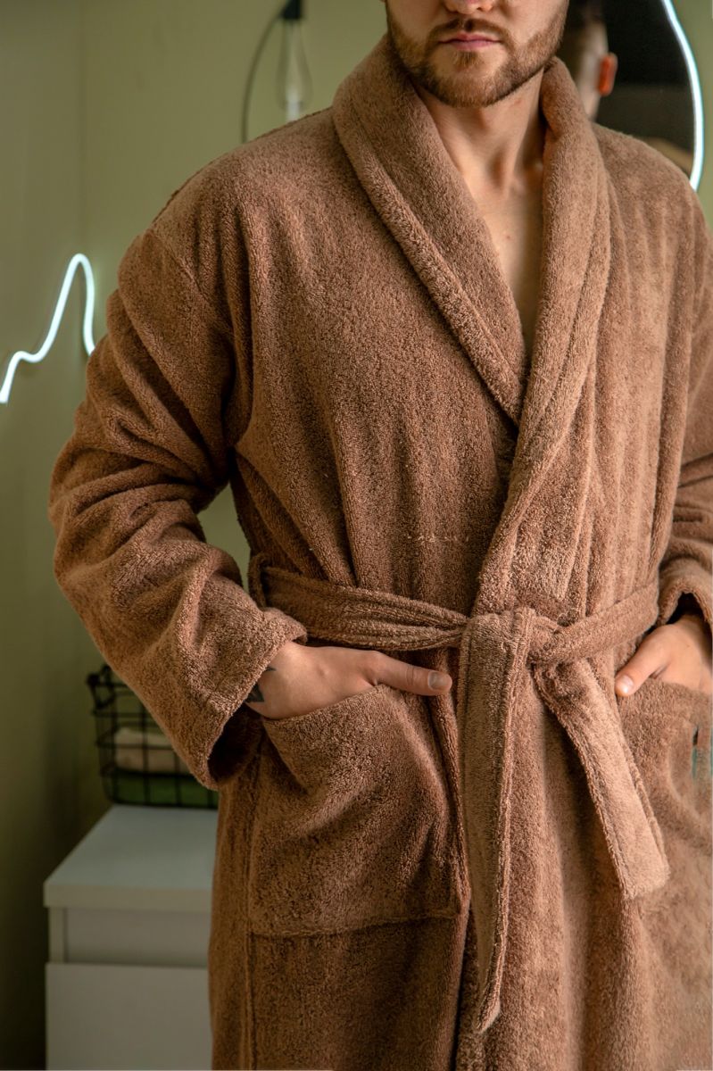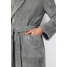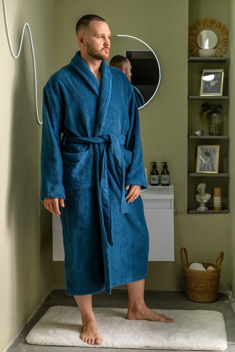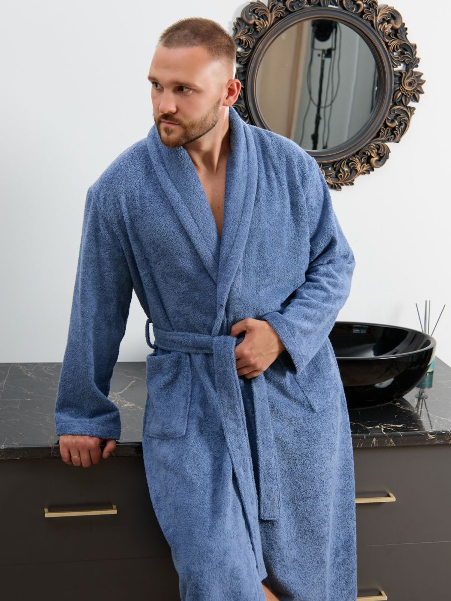 Мужской халат из двустороннего махрового хлопкового полотна. Модель на запах, с поясом в шлёвках, с боковыми карманами, с воротником "шаль", с петлей-вешалкой по горловине спинки.