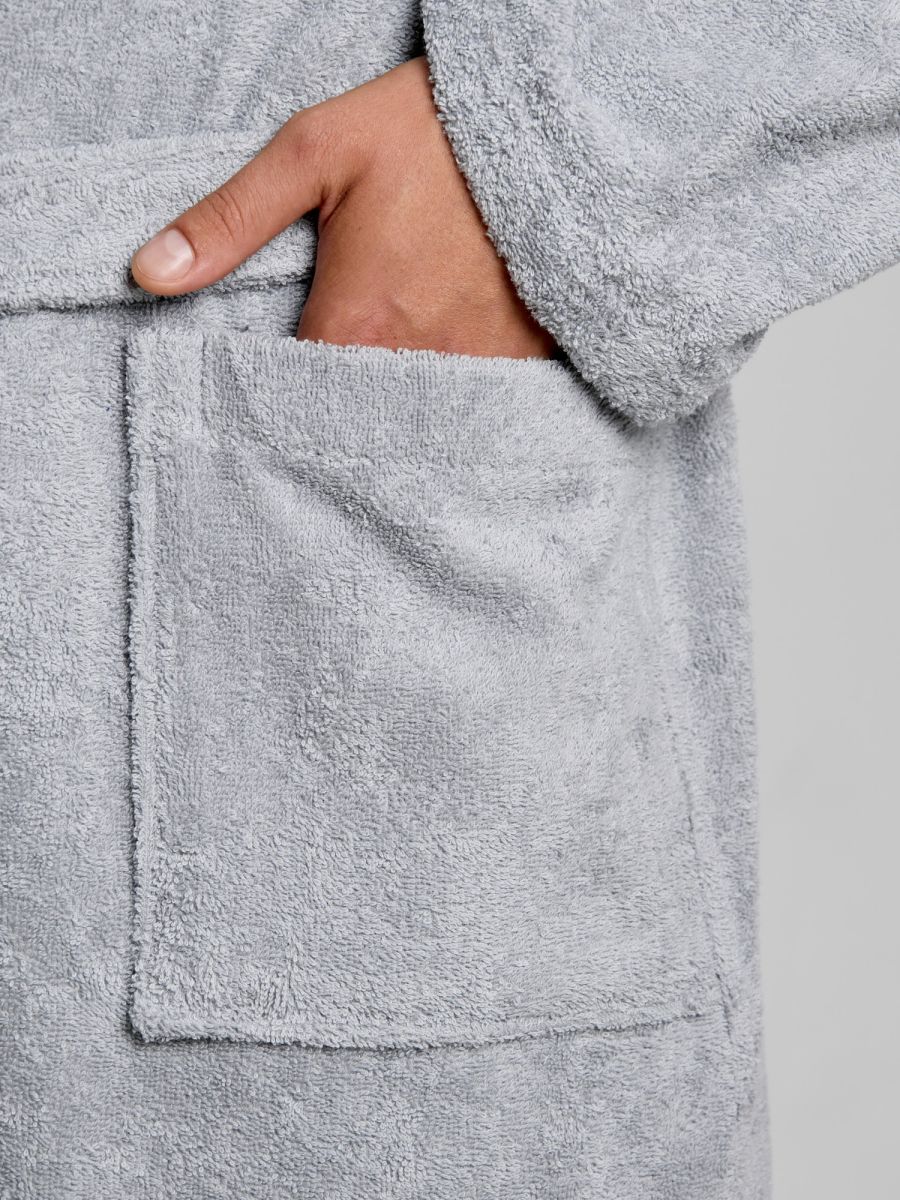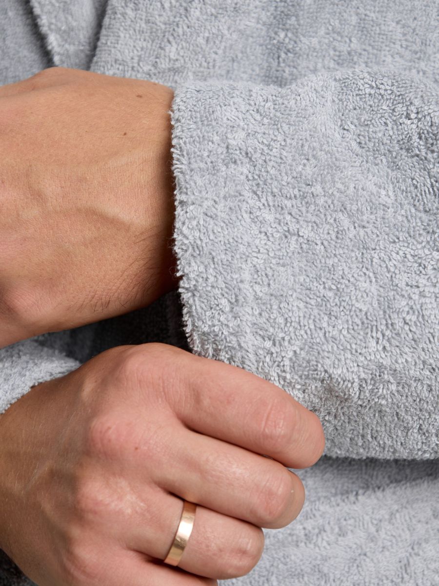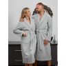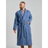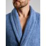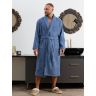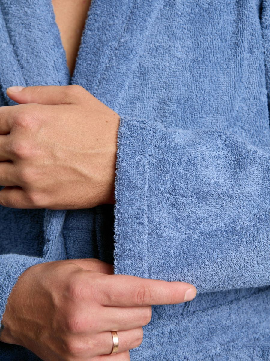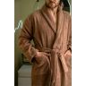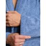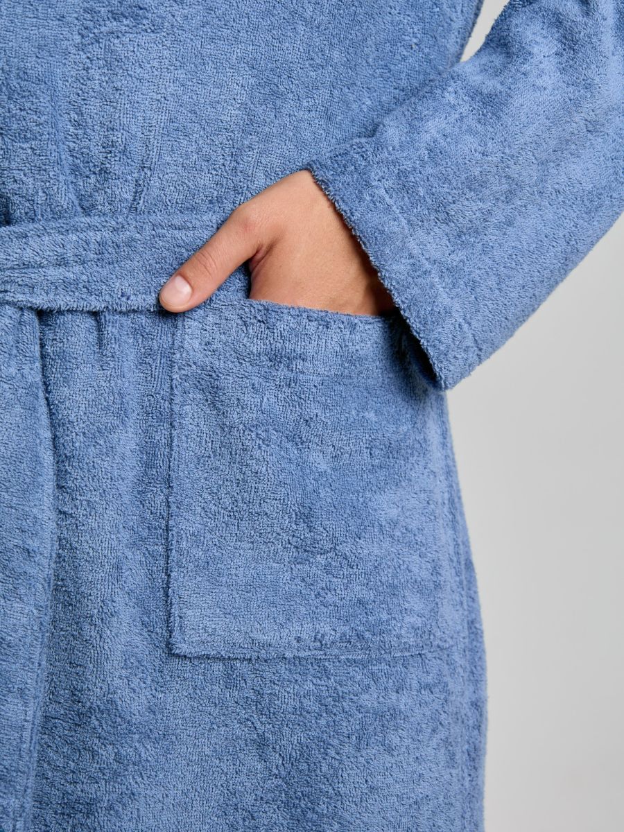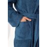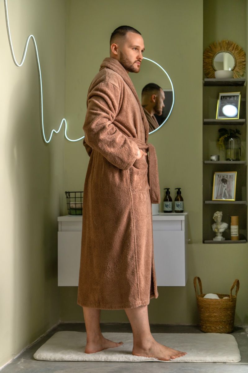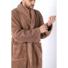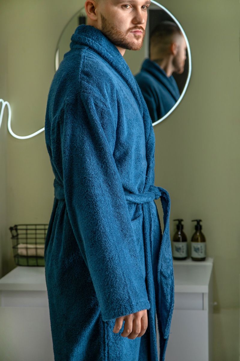 Мужской халат из двустороннего махрового хлопкового полотна. Модель на запах, с поясом в шлёвках, с боковыми карманами, с воротником "шаль", с петлей-вешалкой по горловине спинки.