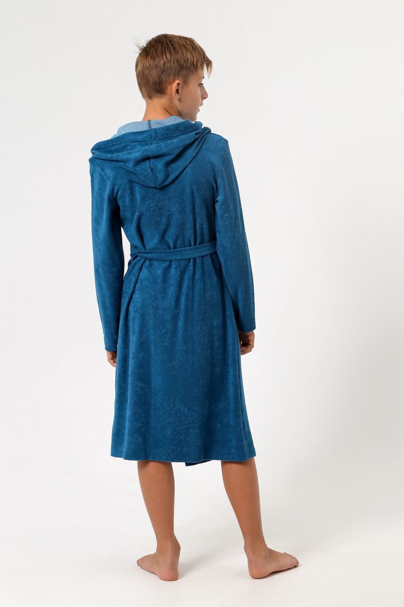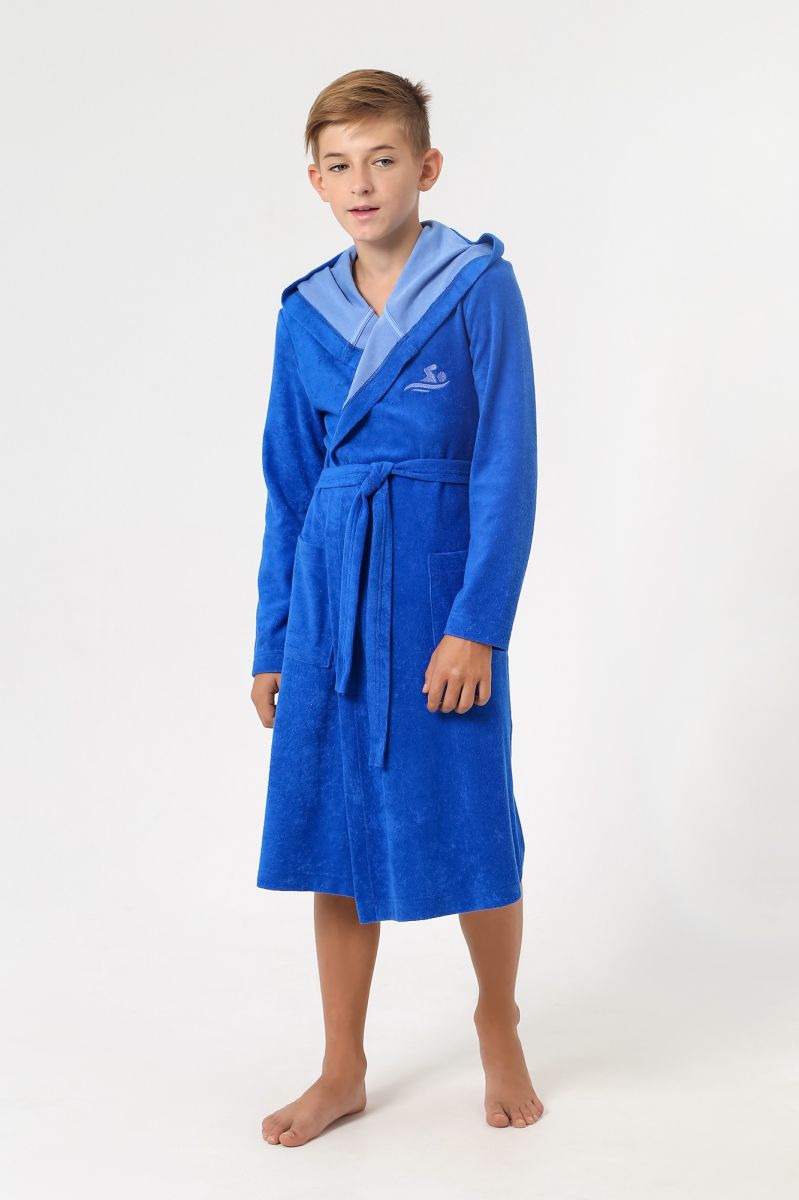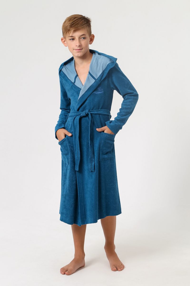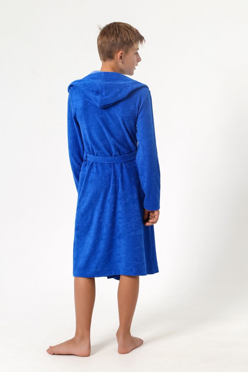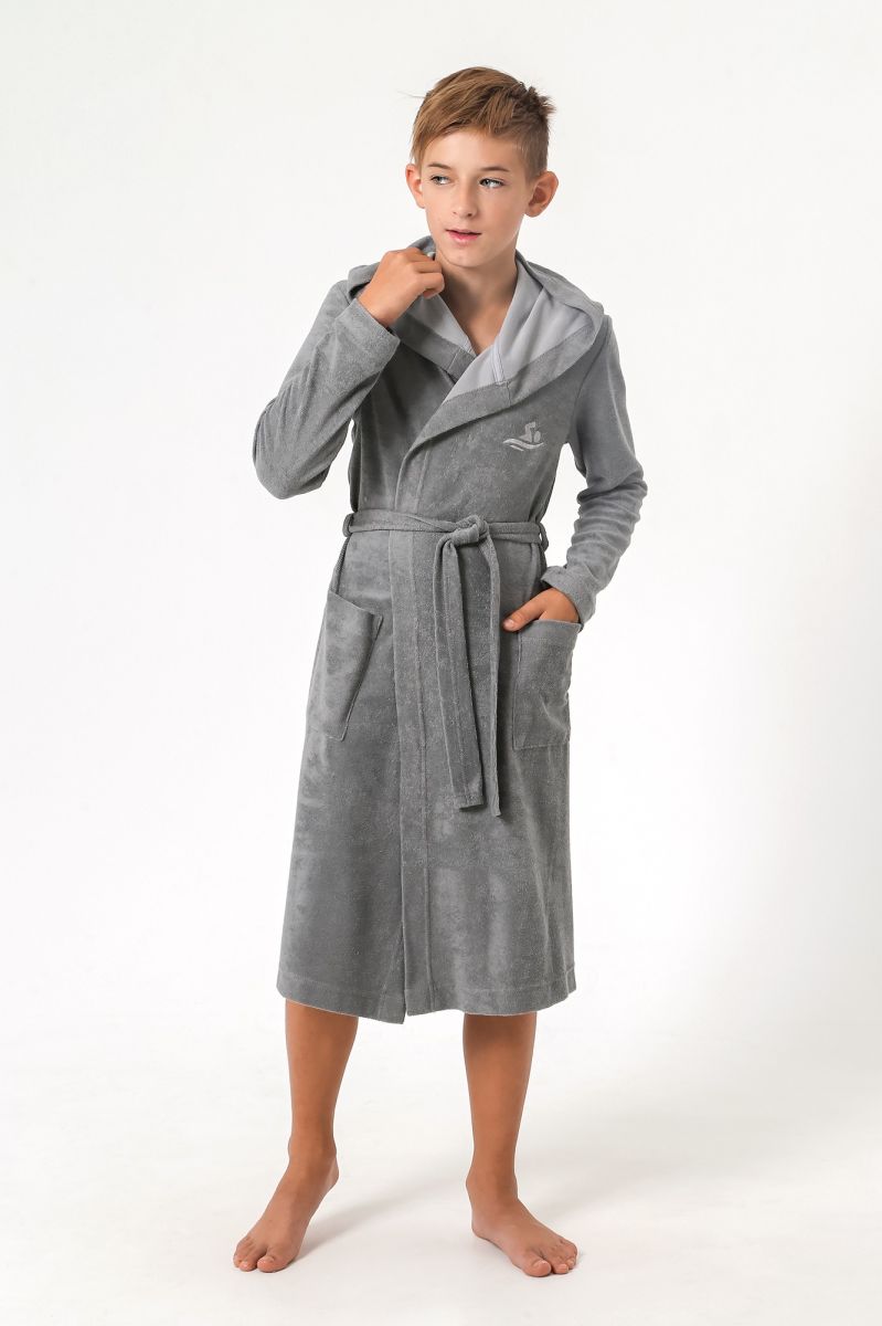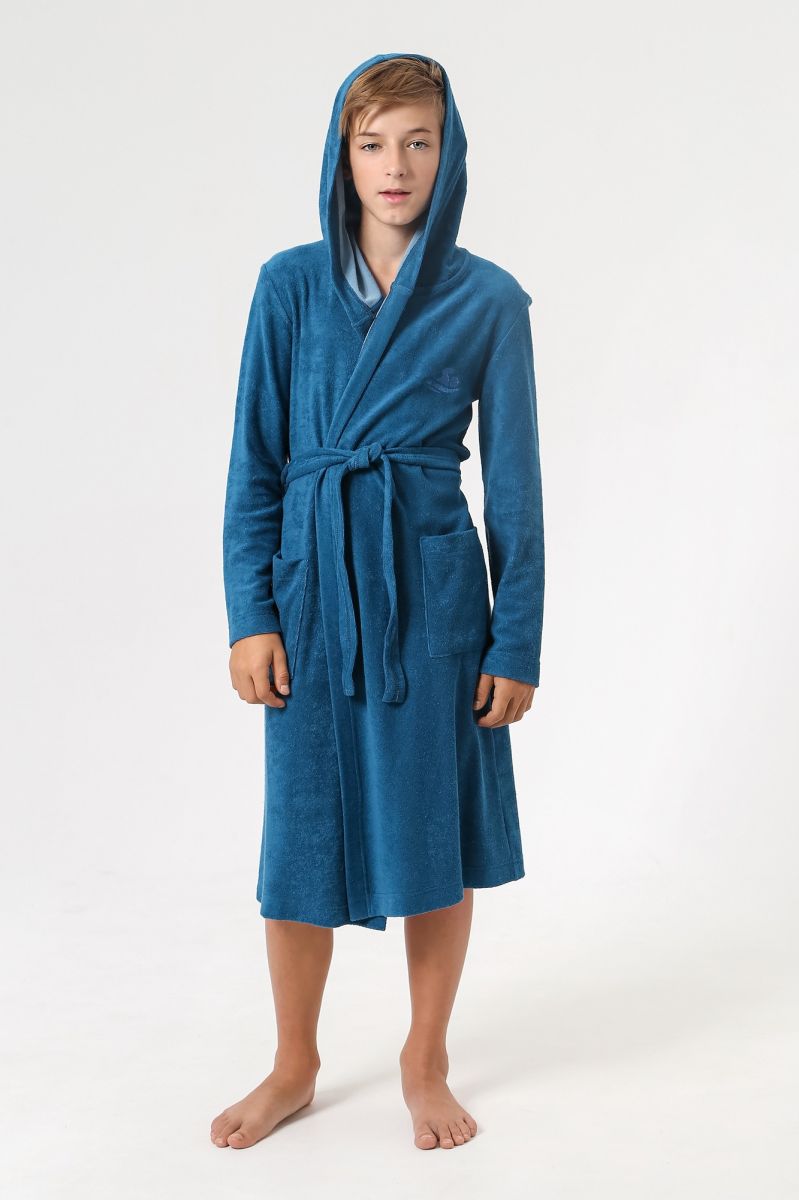 Халат для мальчика, из одностороннего махрового трикотажного полотна. Модель на запАх, с поясом в шлёвках, с боковыми карманами, с капюшоном и с небольшой вышивкой на левой полочке.