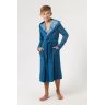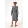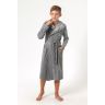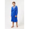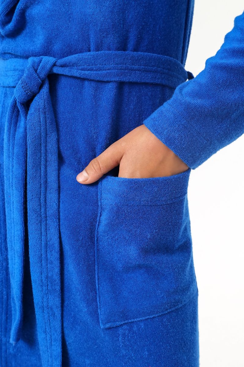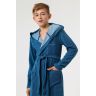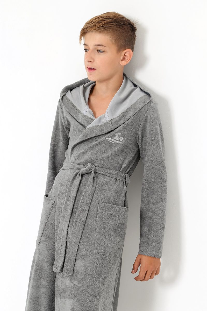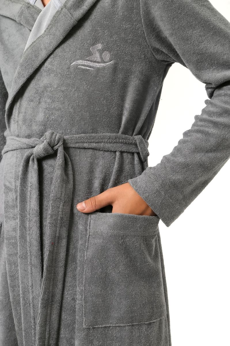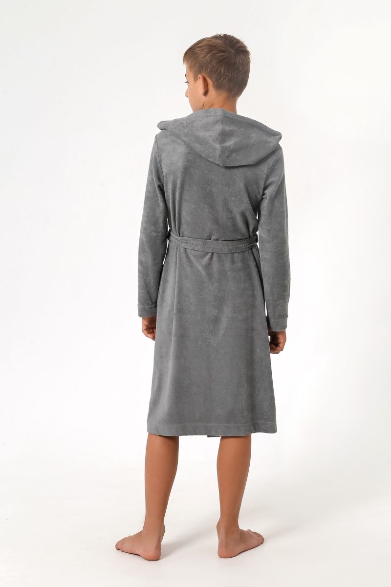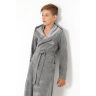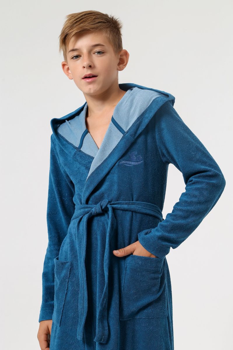 Халат для мальчика, из одностороннего махрового трикотажного полотна. Модель на запАх, с поясом в шлёвках, с боковыми карманами, с капюшоном и с небольшой вышивкой на левой полочке.