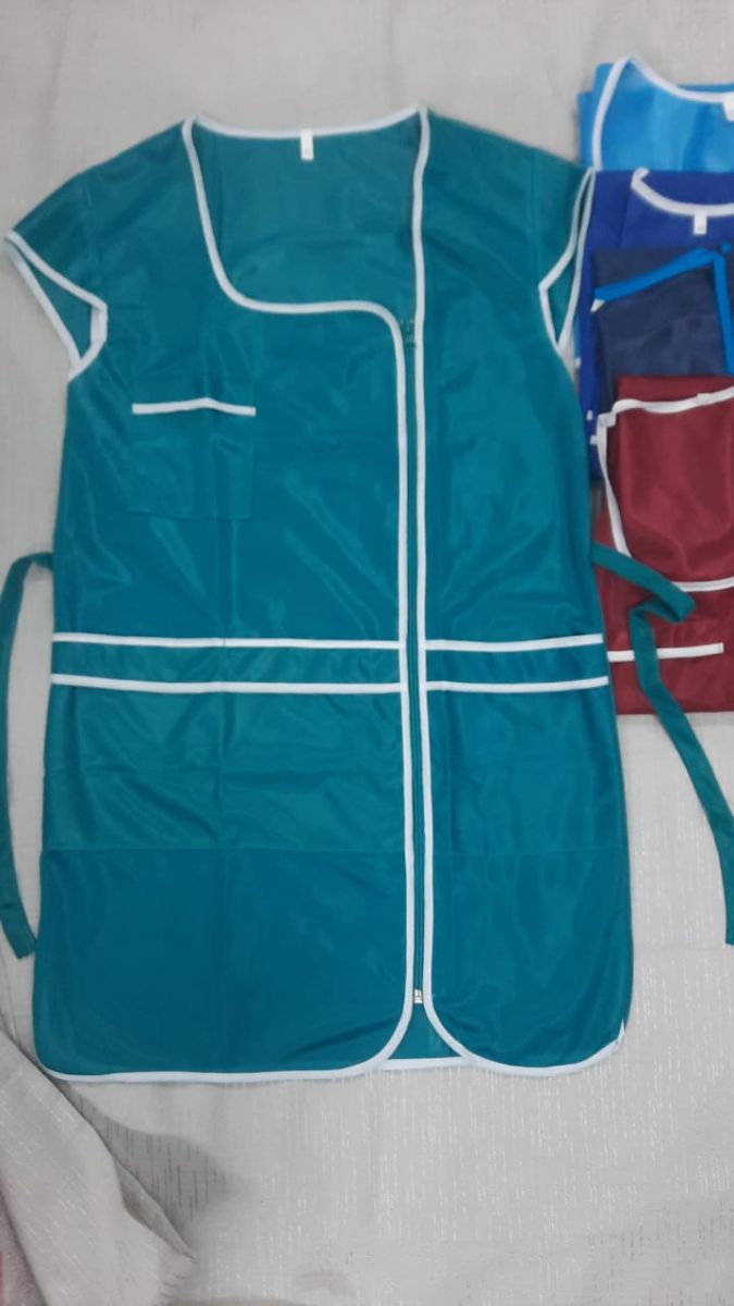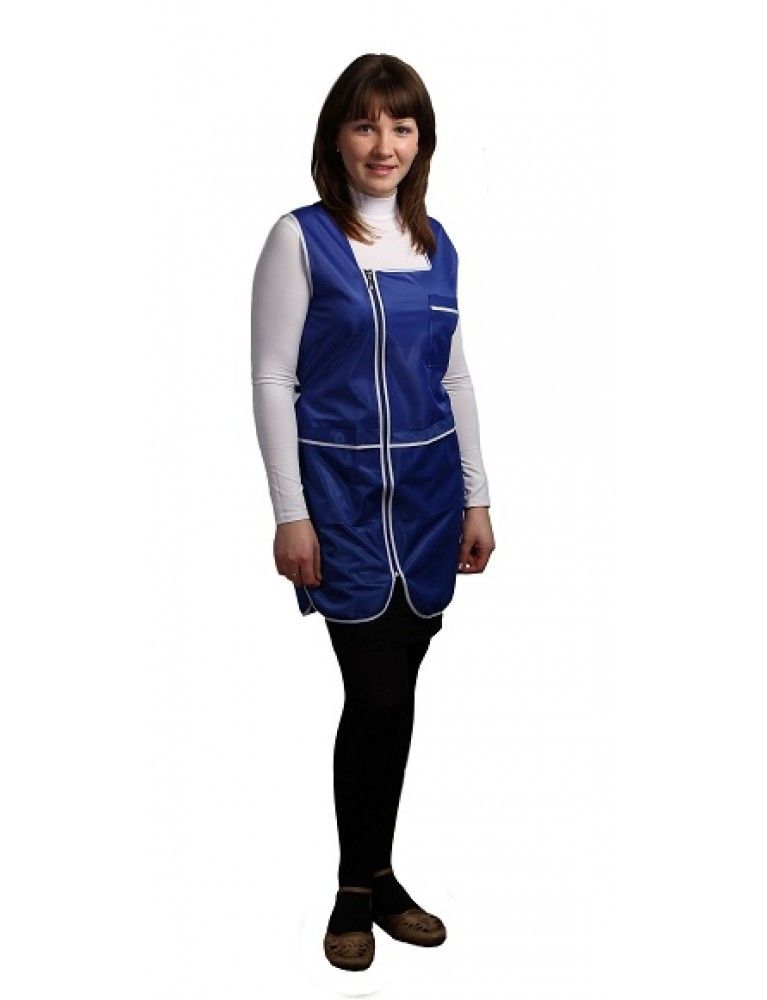 Халат для продавцов (модель ХП-5) без рукава. Спереди изделие застегивается на молнию. Имеет декоративные элементы. Ткань пошива нейлон.