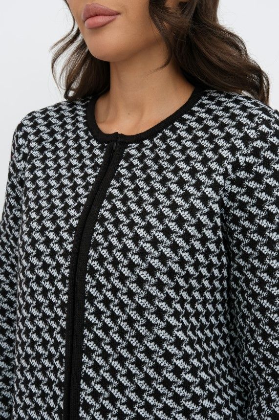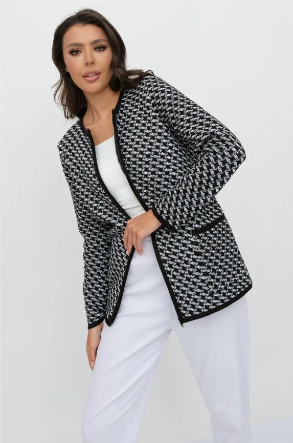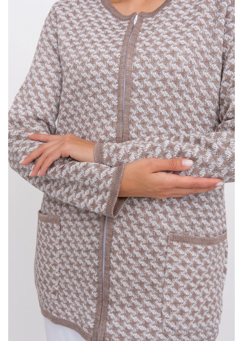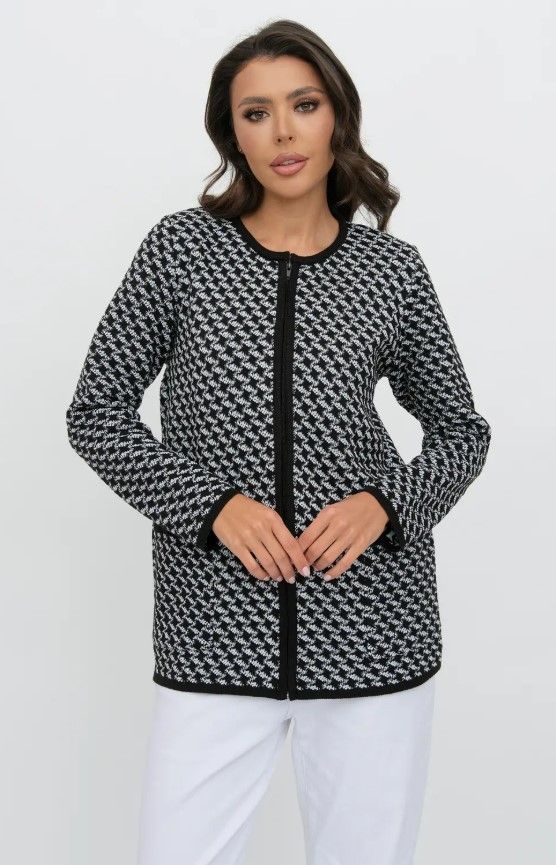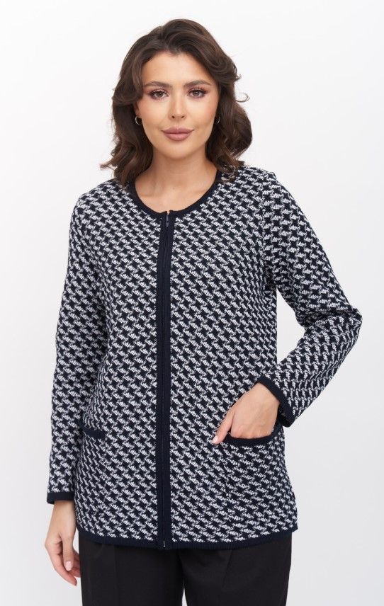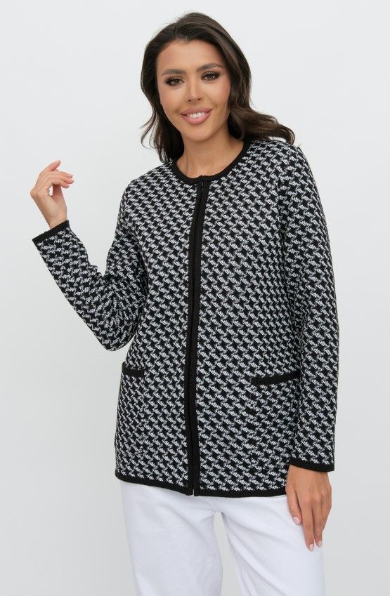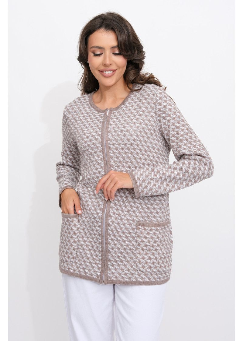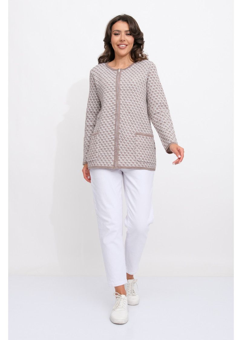 Женский вязаный жакет полуприлегающего силуэта. По переду застегивается на молнию, вырез горловины круглый. Рукава втачные длинные. Два накладных кармана квадратной формы. Жакет выполнен жаккардовым переплетение образуя неброский рисунок.
