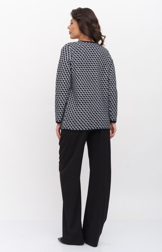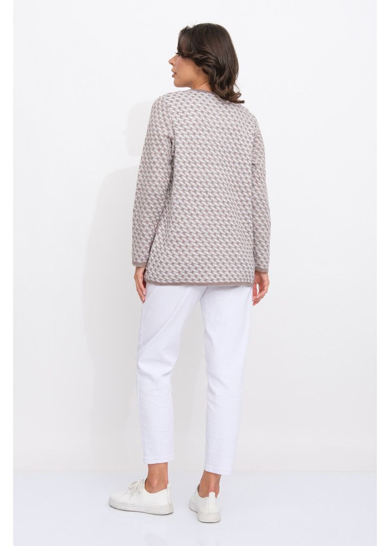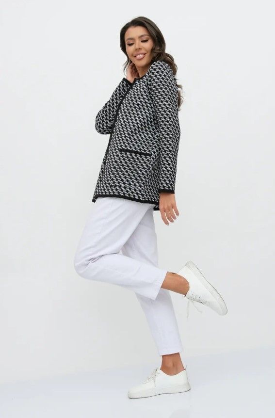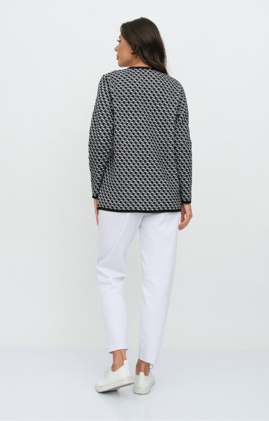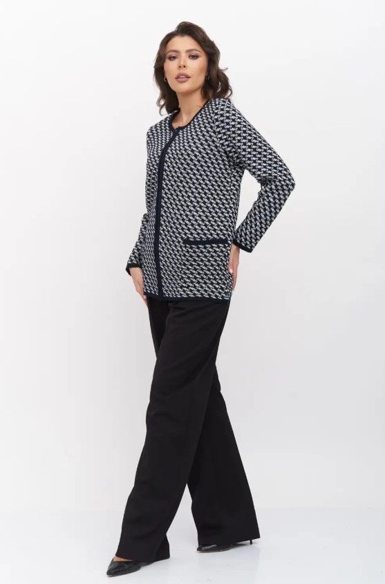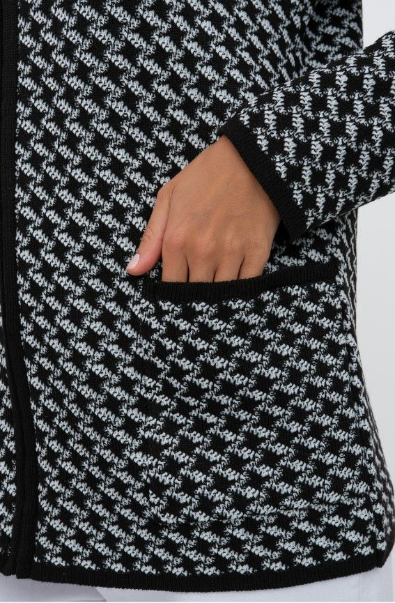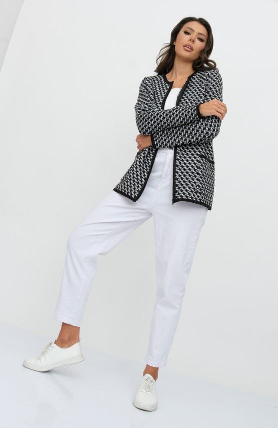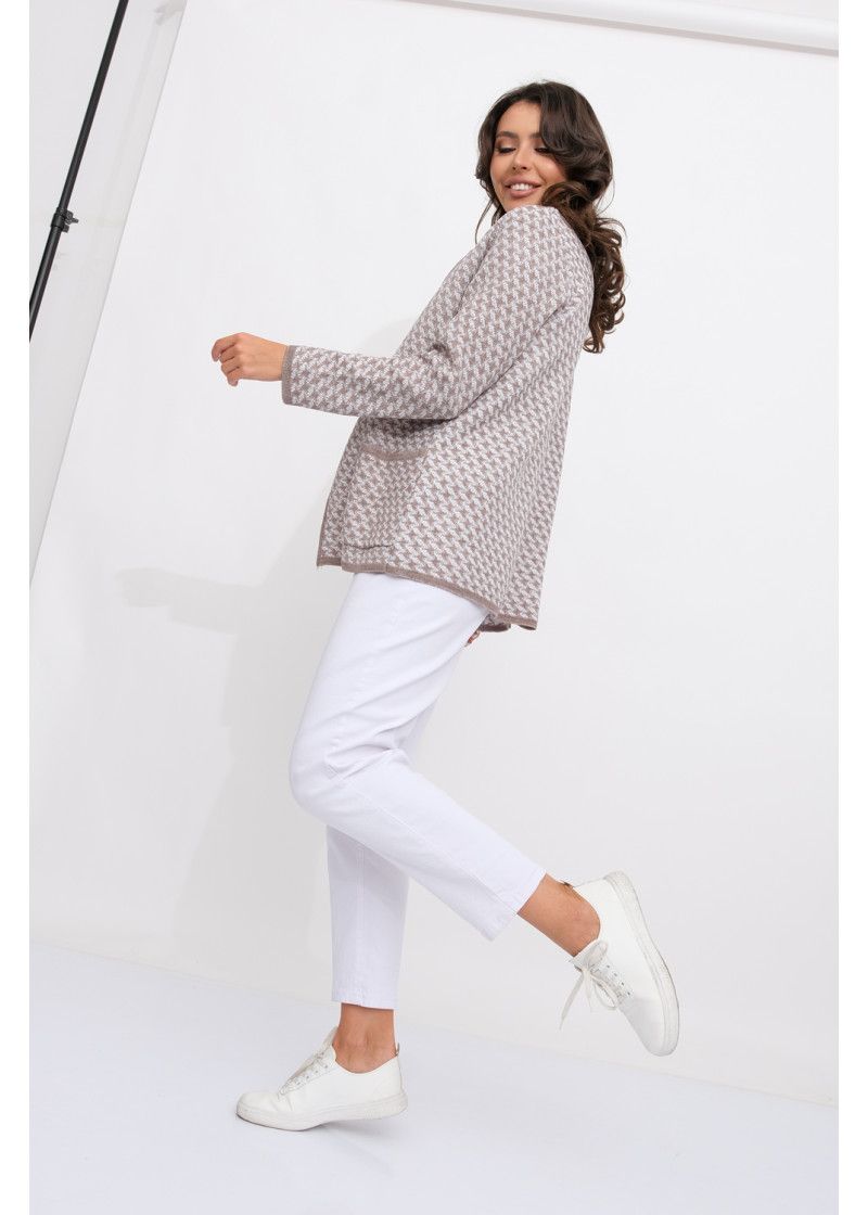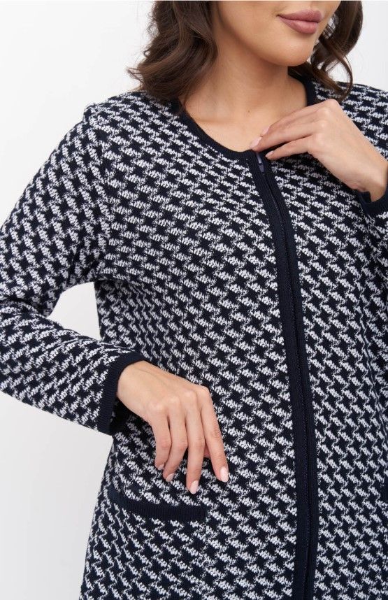Женский вязаный жакет полуприлегающего силуэта. По переду застегивается на молнию, вырез горловины круглый. Рукава втачные длинные. Два накладных кармана квадратной формы. Жакет выполнен жаккардовым переплетение образуя неброский рисунок.