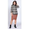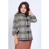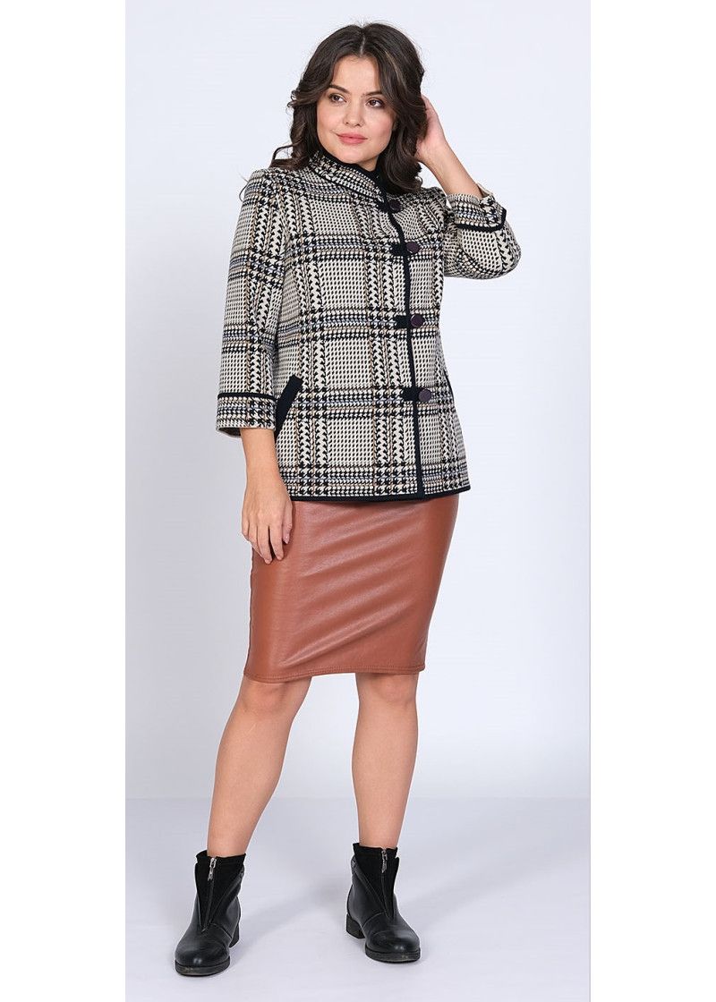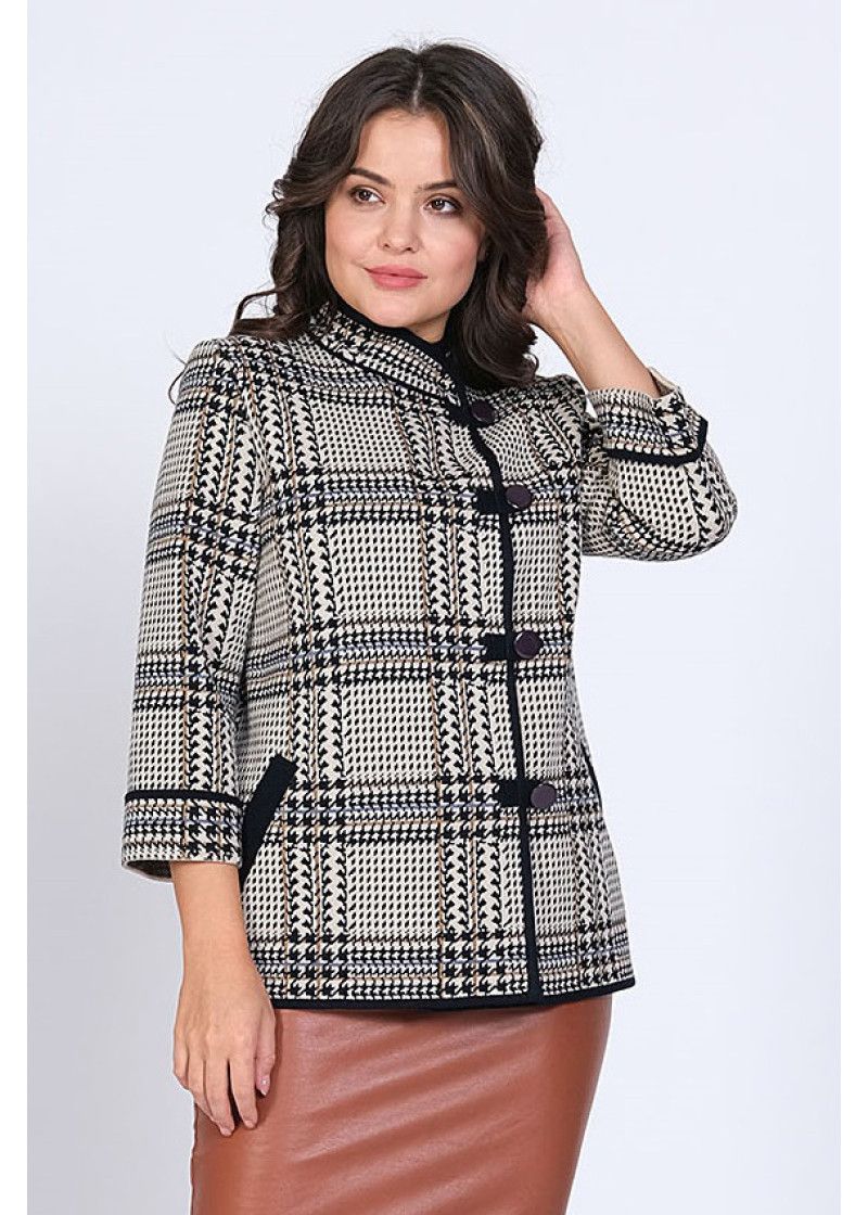 Жакет женский полуприлегающего силуэта с воротником стойкой. Рукава втачные длинные. Два прорезных кармана. Жакет застегивается на пуговицы и навесные петли. Изделие выполнено жаккардовым рисунком, образующим клетку. По отвороту на рукавах, низу изделия, краю воротника и полочке проходит отделка в контрастном цвете.