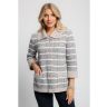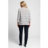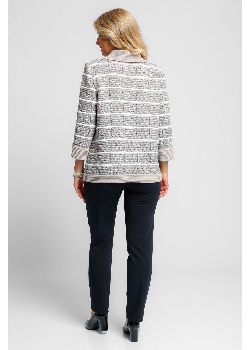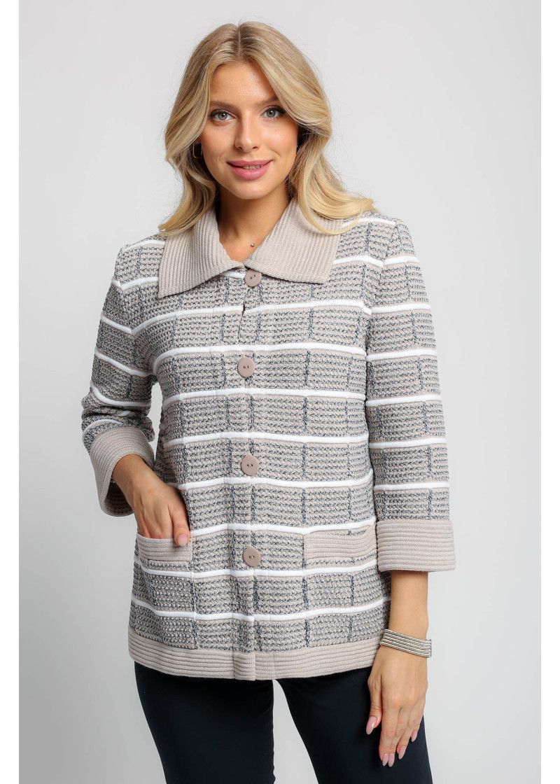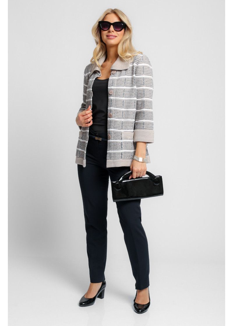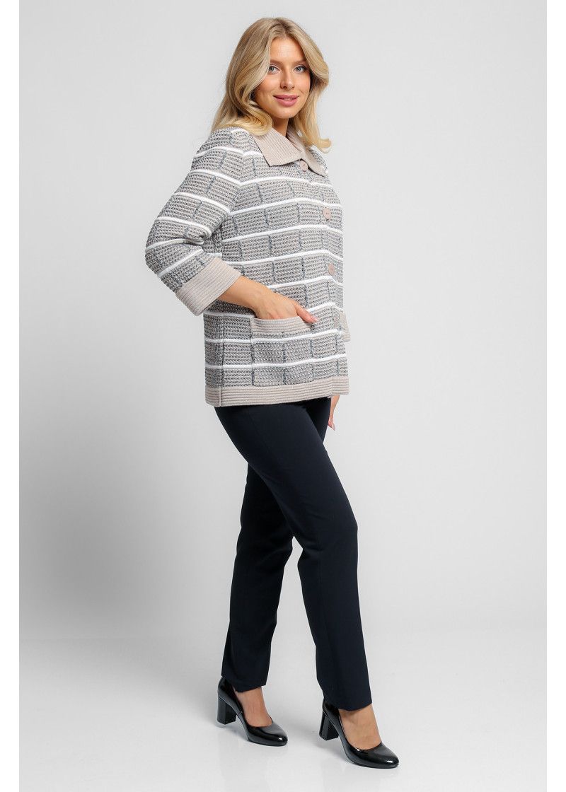 Вязаный женский жакет свободного силуэта с рубашечным отложным воротником. Рукав втачной длиной 7/8 с отворотом. По бокам два накладных кармана с листочкой. Жакет застегивается на пуговицы с навесной петлей. Изделие выполнено жаккардовым переплетением образующим валики.