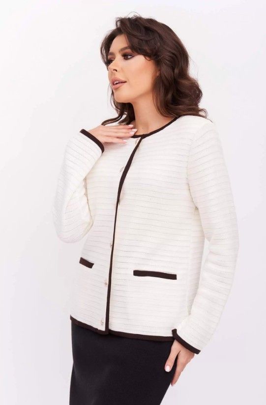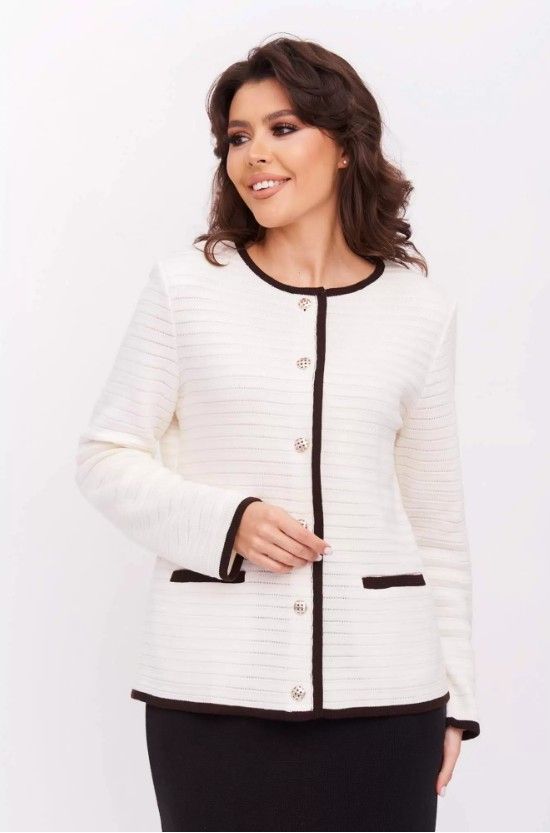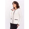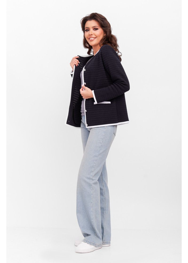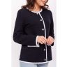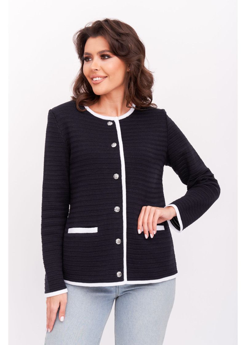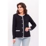 Жакет женский полуприлегающего силуэта с круглой горловиной. Жакет застегивается на металические пуговицы. Рукава втачные длинные. Два прорезных кармана. Горловина, низ рукавов, низ изделия и вход в карманы выполнены контрастным цветом.