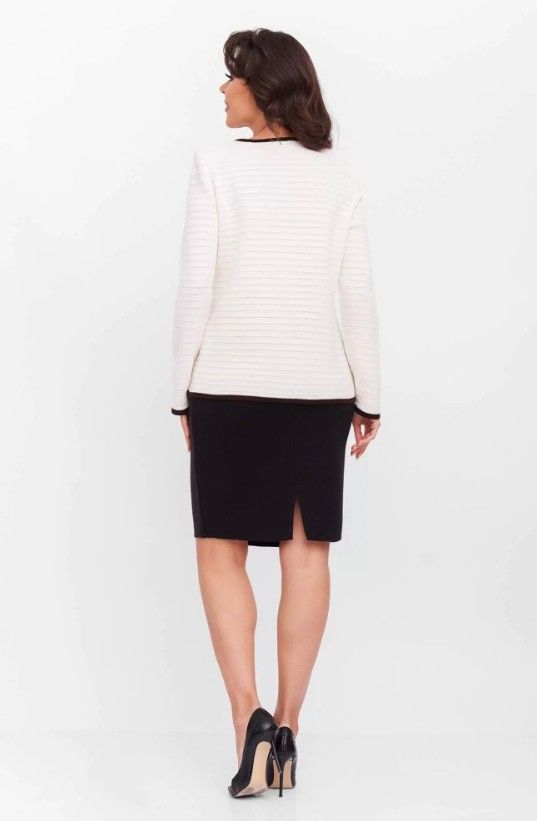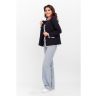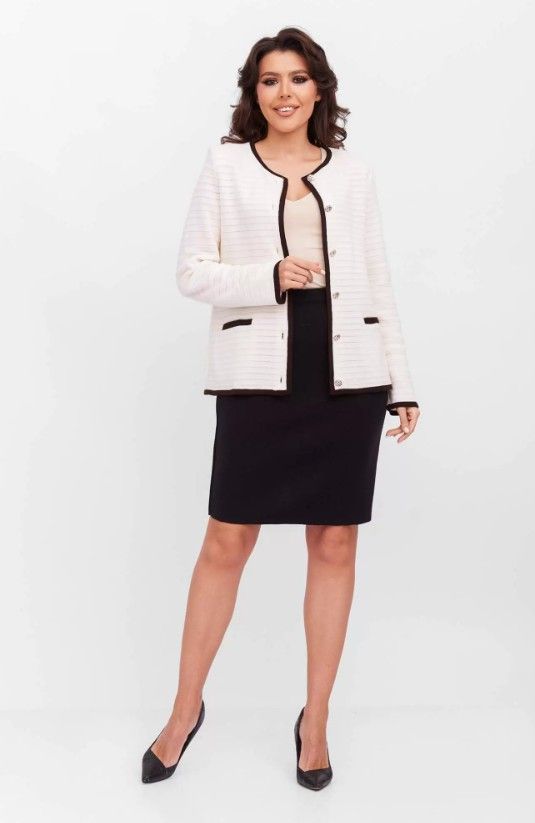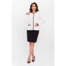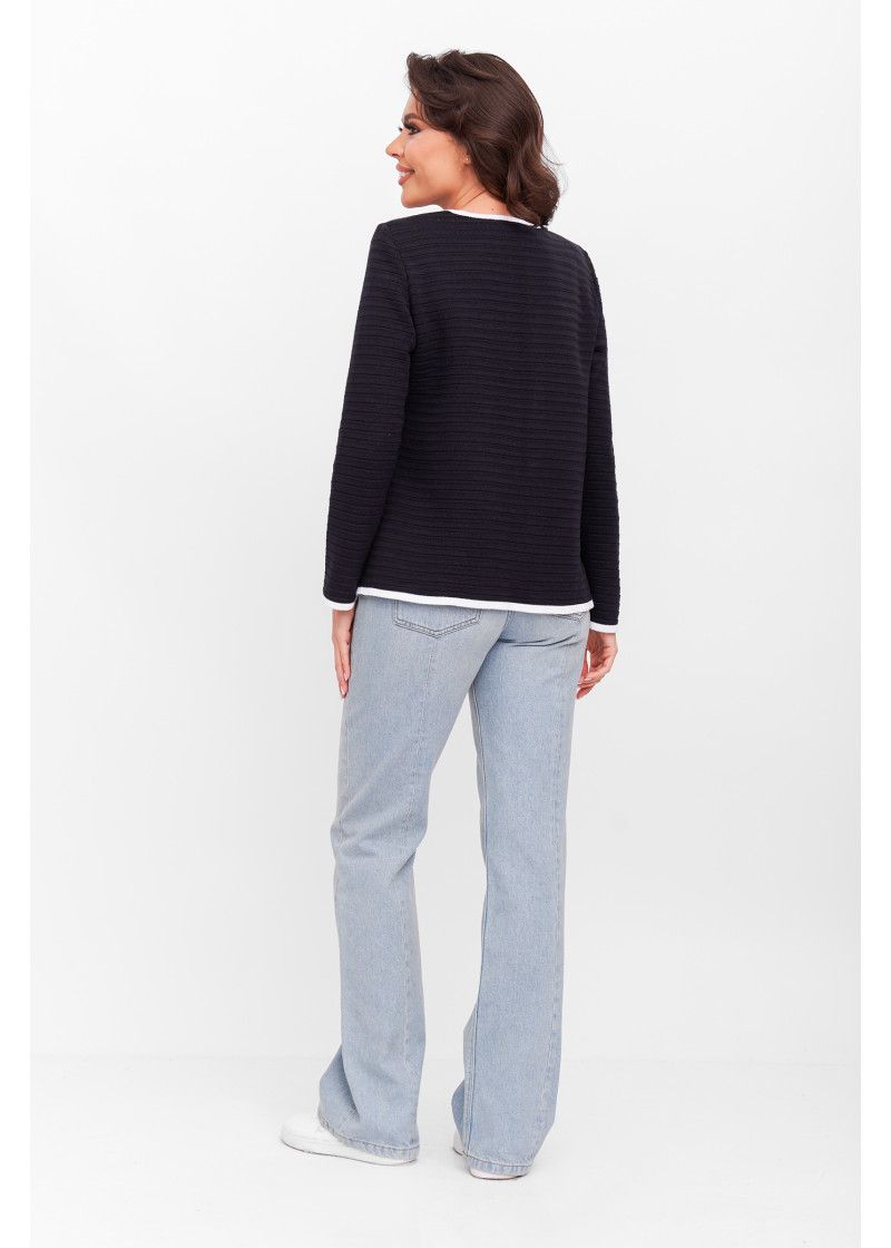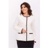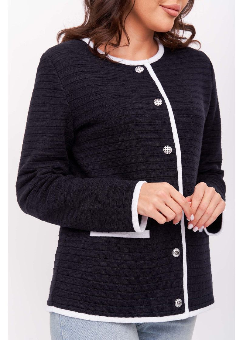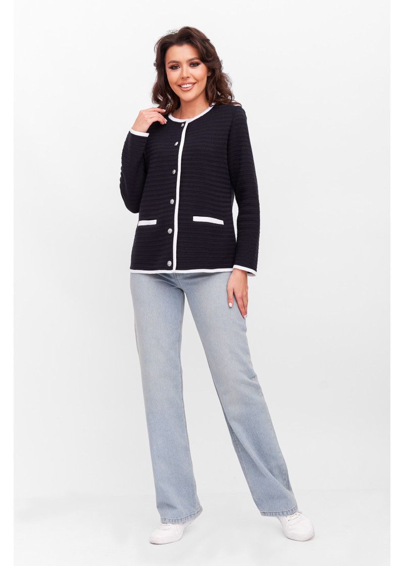 Жакет женский полуприлегающего силуэта с круглой горловиной. Жакет застегивается на металические пуговицы. Рукава втачные длинные. Два прорезных кармана. Горловина, низ рукавов, низ изделия и вход в карманы выполнены контрастным цветом.