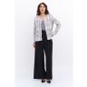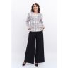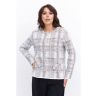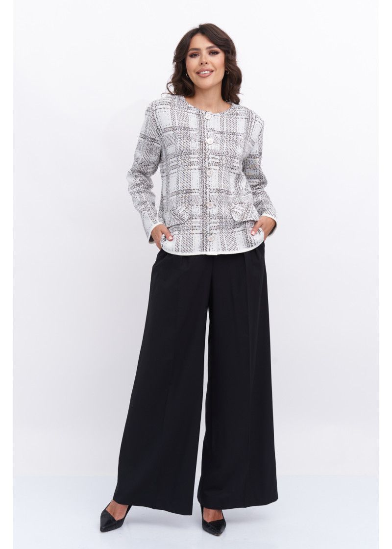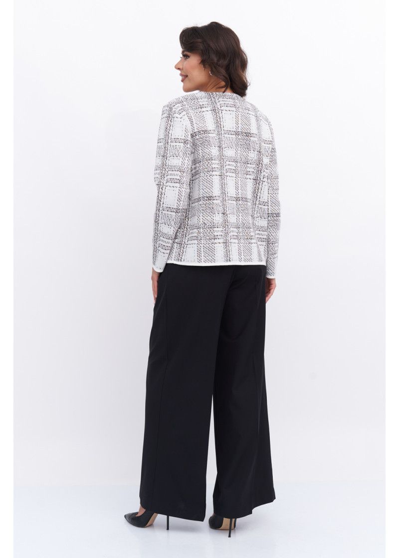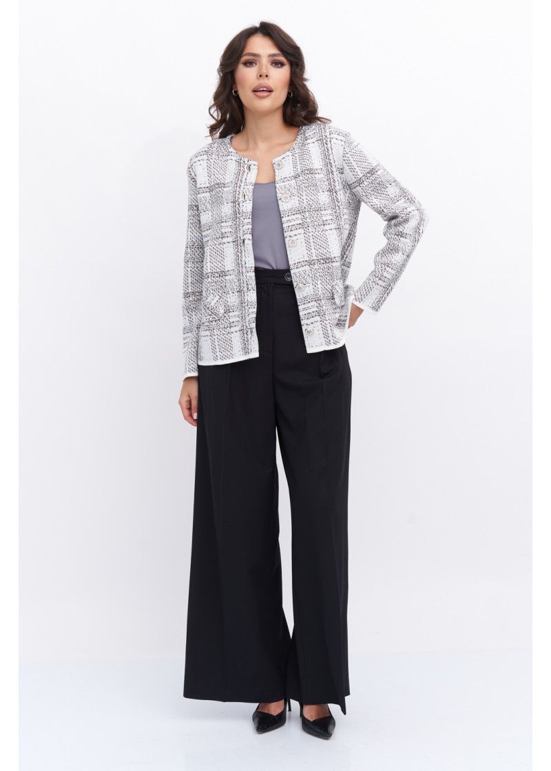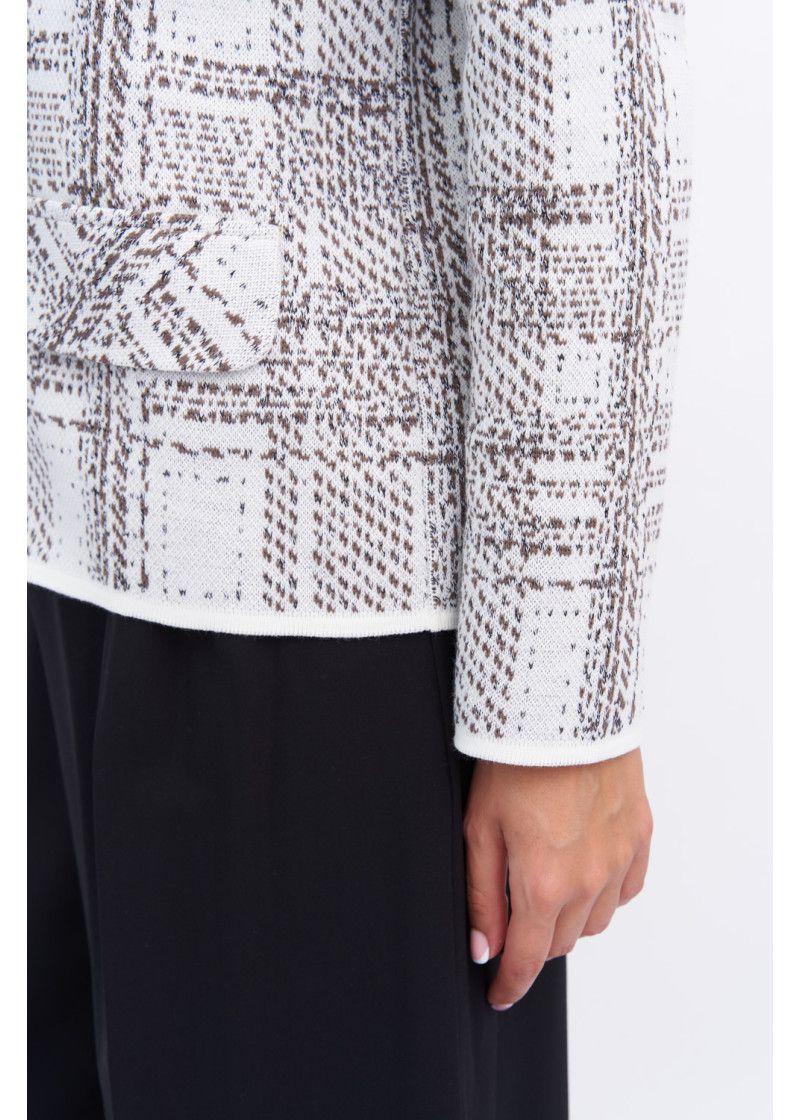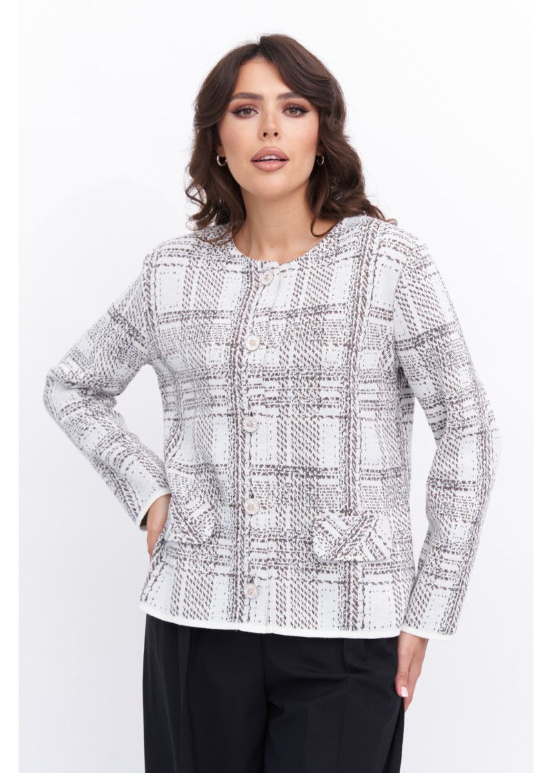 Женский вязаный жакет в классическом стиле полуприлегающего силуэта, с круглой горловиной, на пуговицах. Рукава втачные длинные. Клапаны, имитирующие карман. Жакет выполнен жаккардовым многоцветным переплетением, образующим клетку