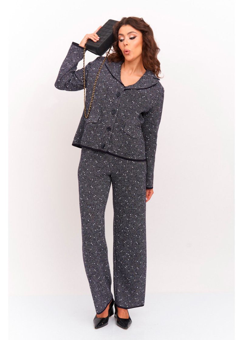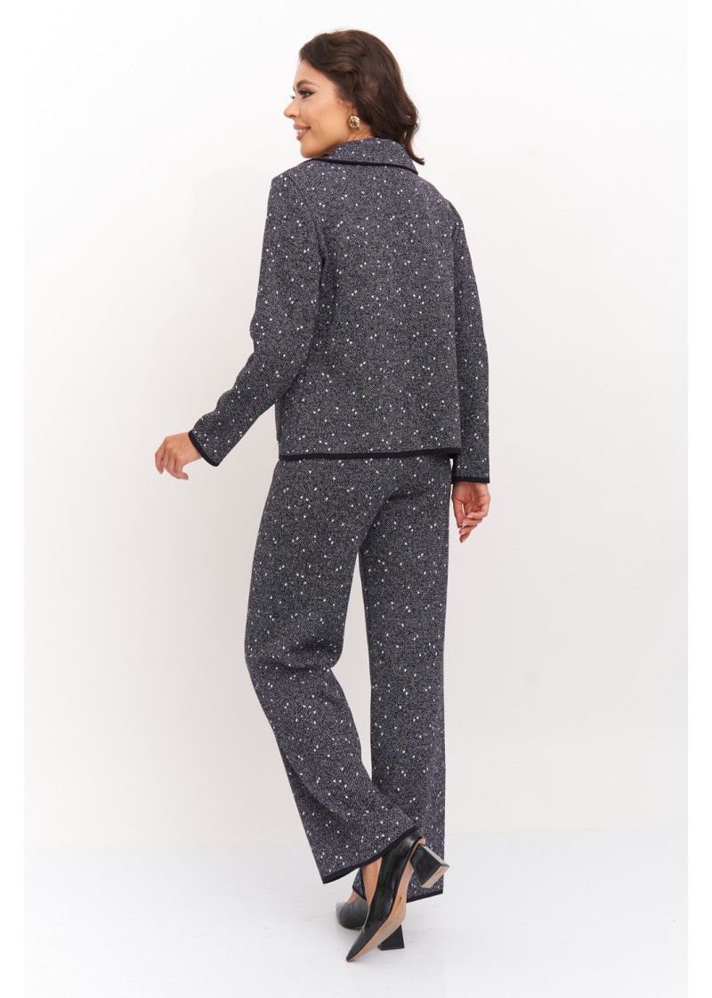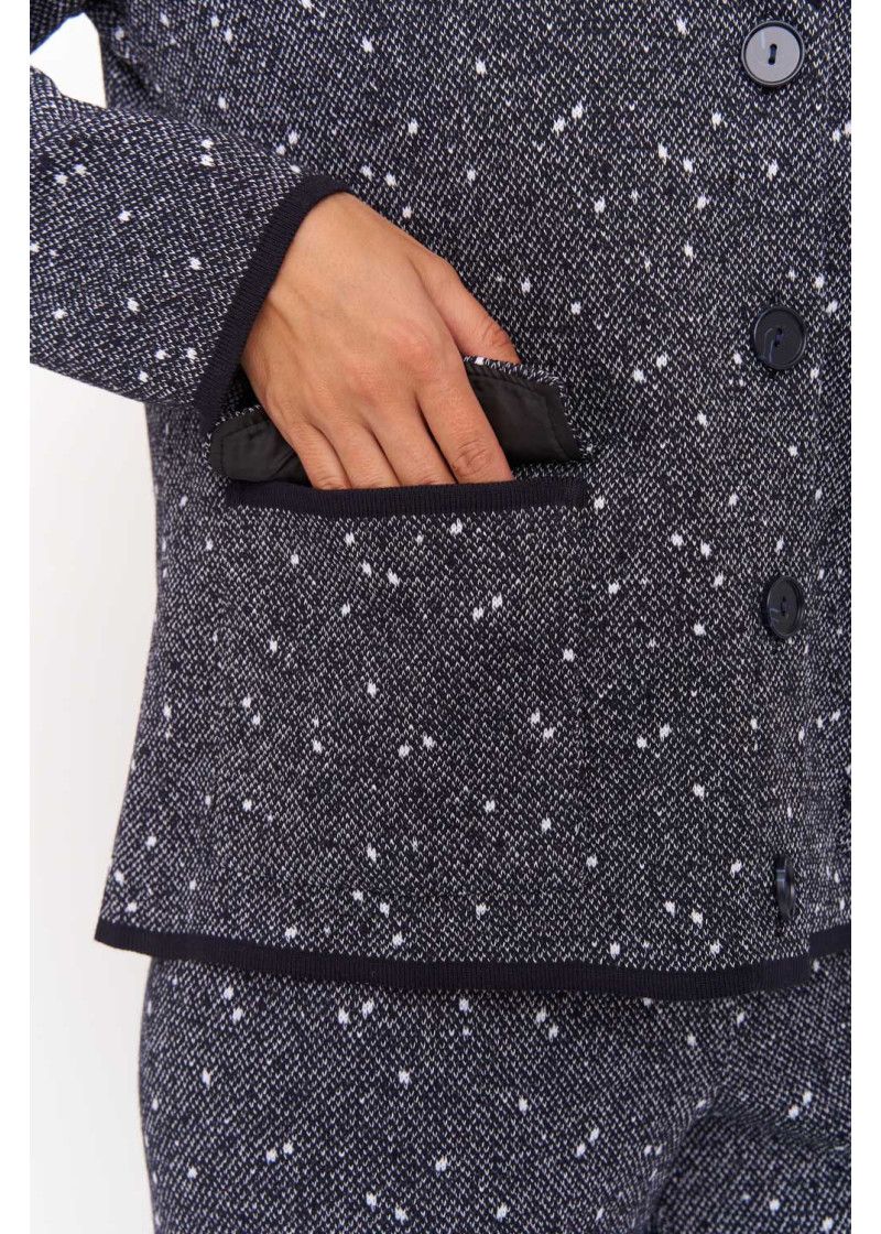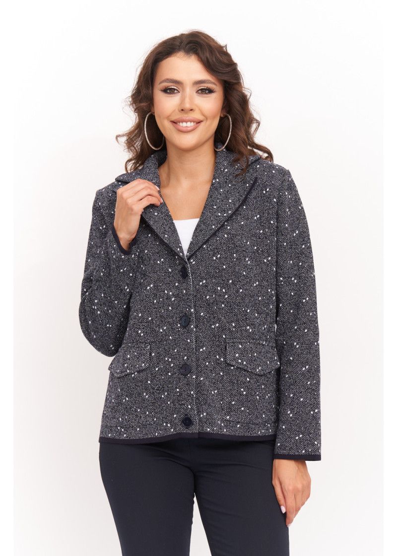 Женский вязаный жакет прямого силуэта с V-образным вырезом, английским воротником. Рукав втачной длинный. Застёжка на пуговицы. Два накладных кармана с клапаном. Изделие выполнено жаккардовым переплетением. Жакет подойдет для работы в офис и деловых встреч, в нем Вы будете выглядеть модно, но при этом лаконично и сдержанно.