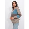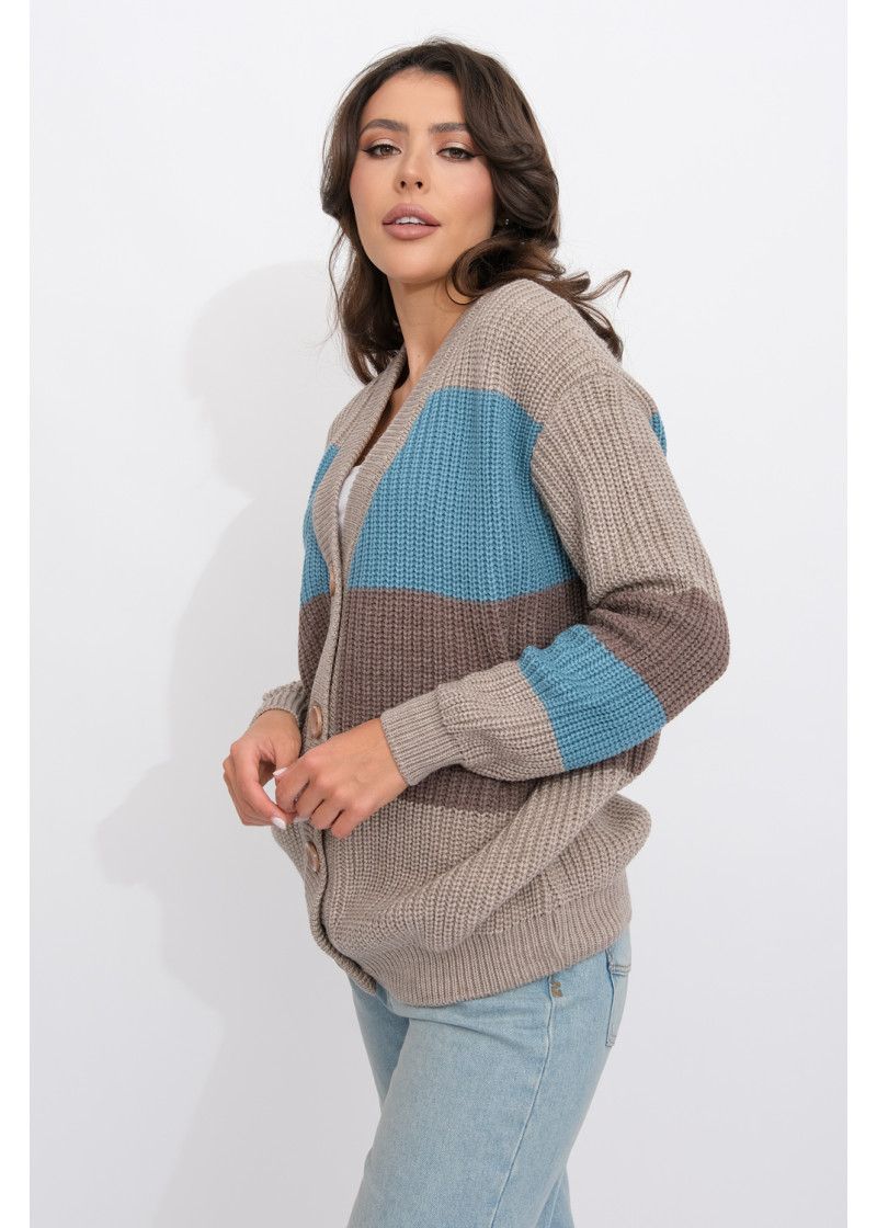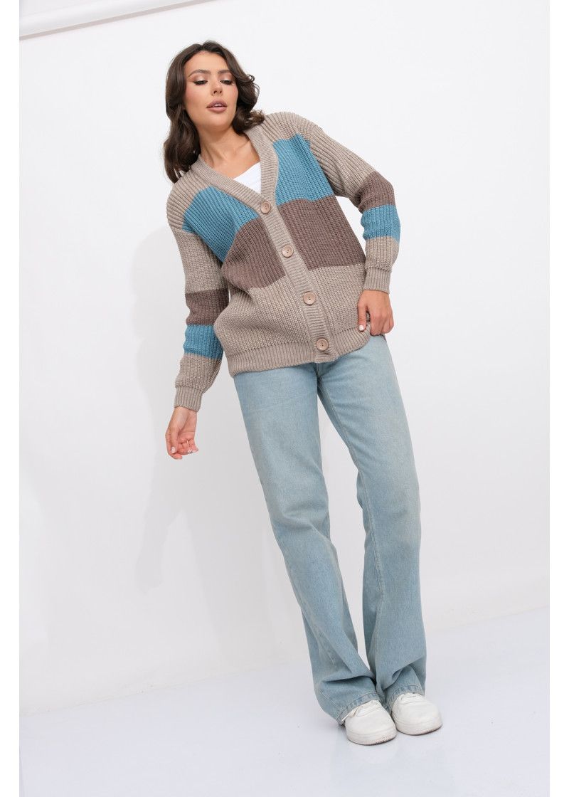 Вязаный женский жакет с V-образным вырезом горловины, спущенным плечом и рукавом полной длины. Застёжка спереди на пуговицы. Полочки, спинка и рукава выполнены с полосами разного цвета пряжи. Жакет выполнен из дышащего, тактильно приятного материала, с добавлением шерсти. Это универсальный второй слой для создания утепленных повседневных образов.
