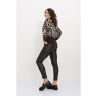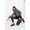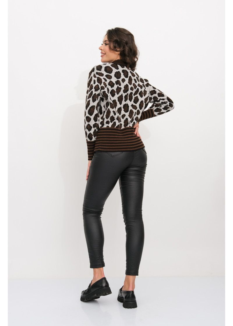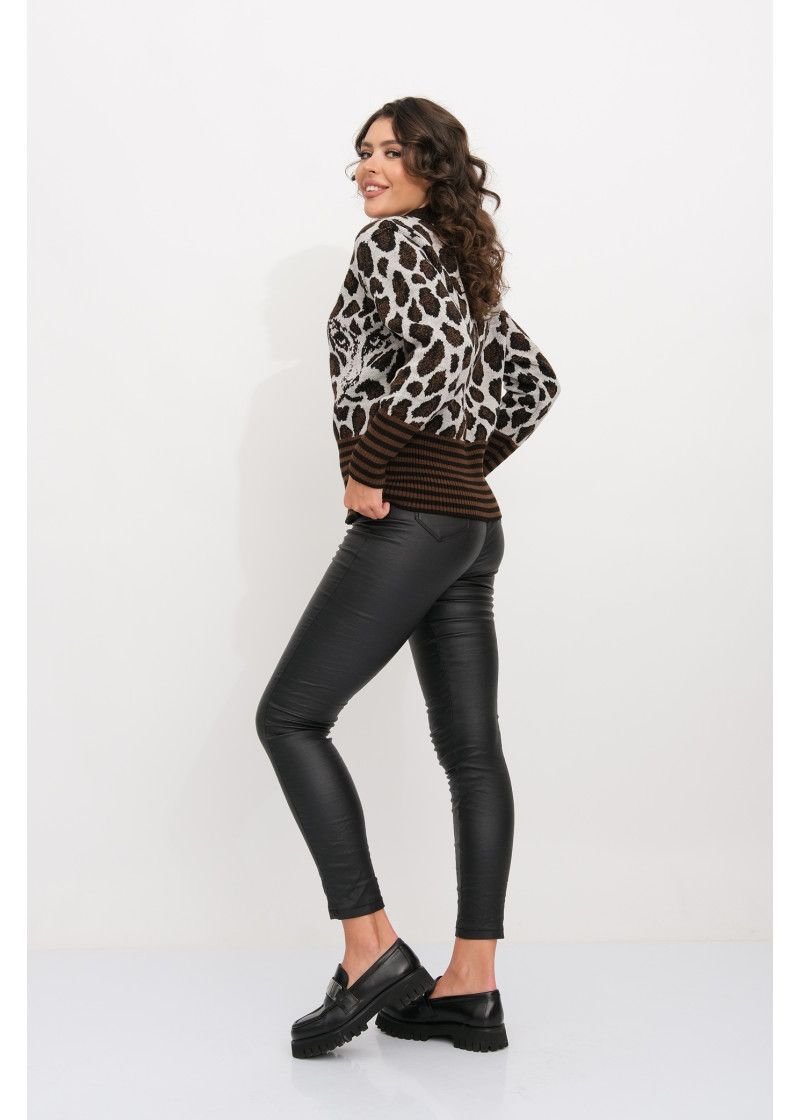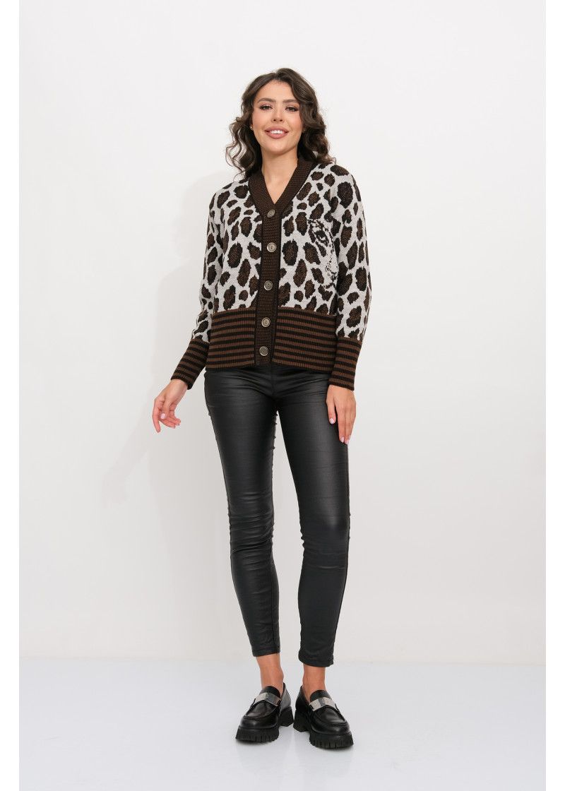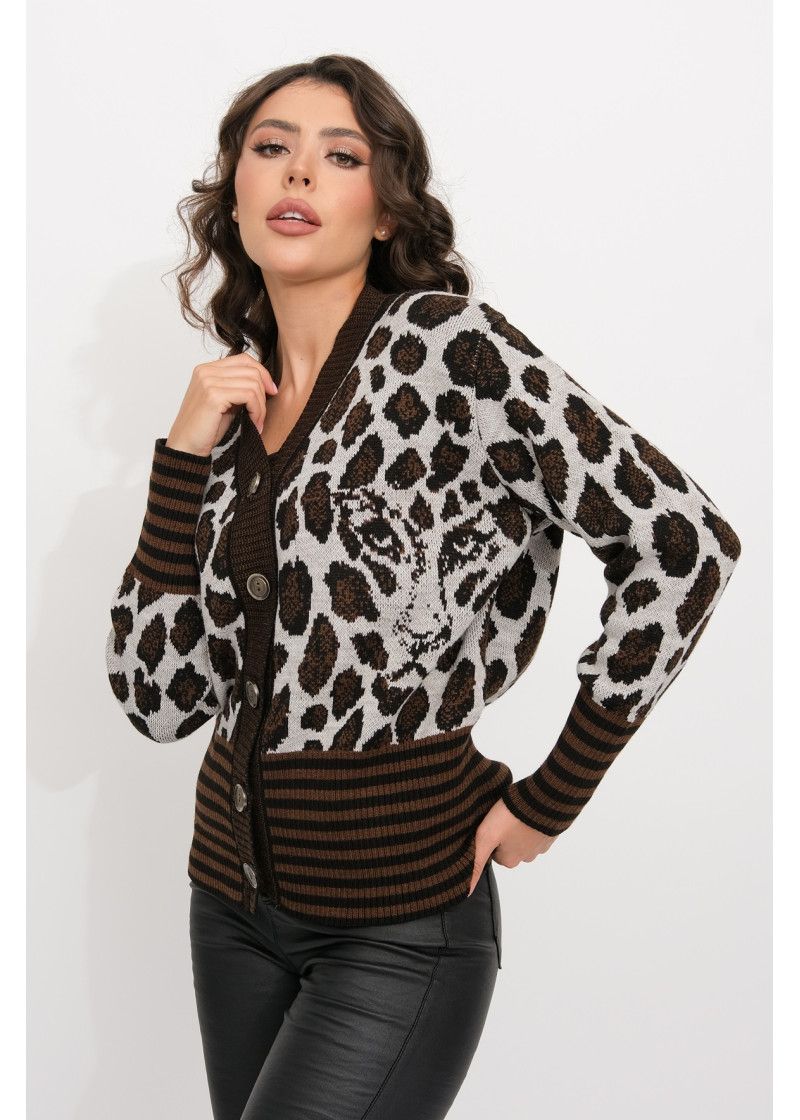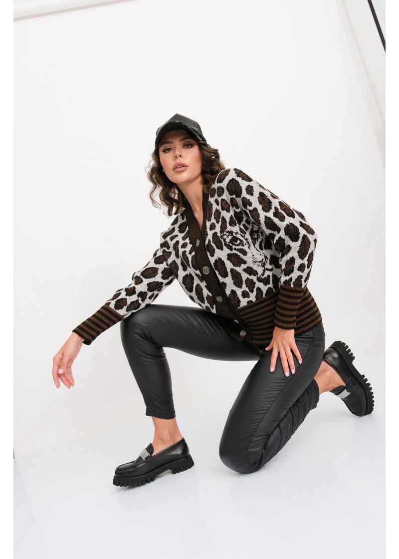 Вязаный жакет в стиле оверсайз с V-образным вырезом горловины, спущенным плечом и рукавом полной длины. Застёжка спереди на пуговицы. Полочки, спинка и рукава выполнены жаккардовым переплетением с анималистическим рисунком. Эта модель - универсальный второй слой для создания утепленных повседневных образов.
