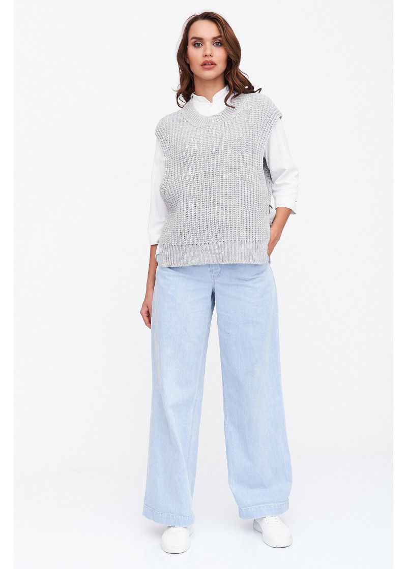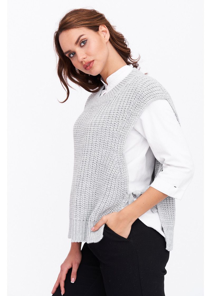 Оригинальный жилет прямого кроя. Круглая горловина с широкой эластичной резинкой, плечо спущенное. Удлиненная спинка, которая соединяется с передом по бокам трикотажными лентами, Можно надевать в офис и школу поверх блуз, очень практичный в использовании.