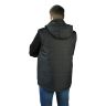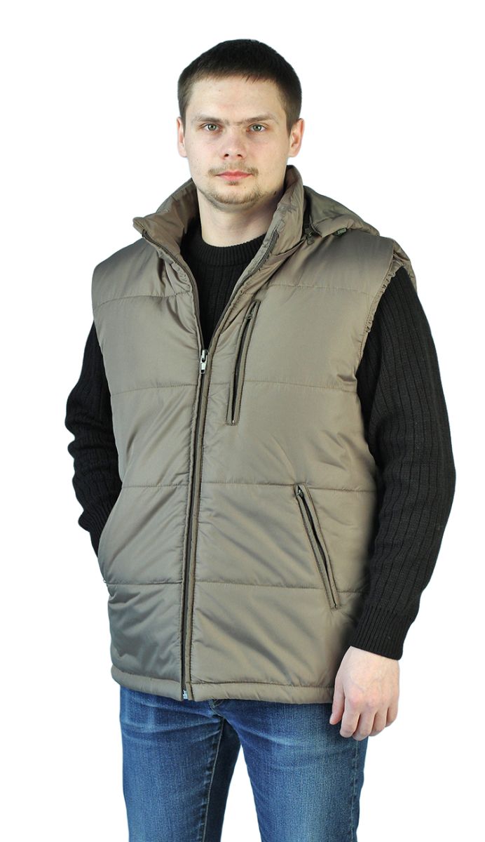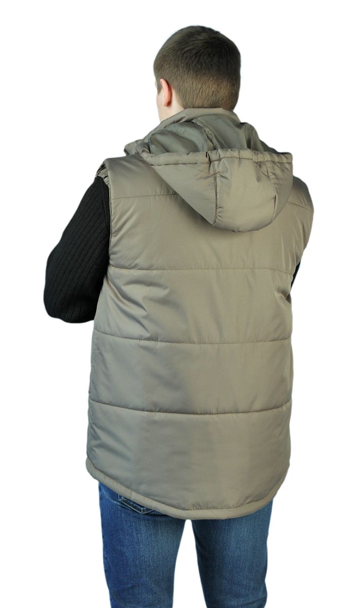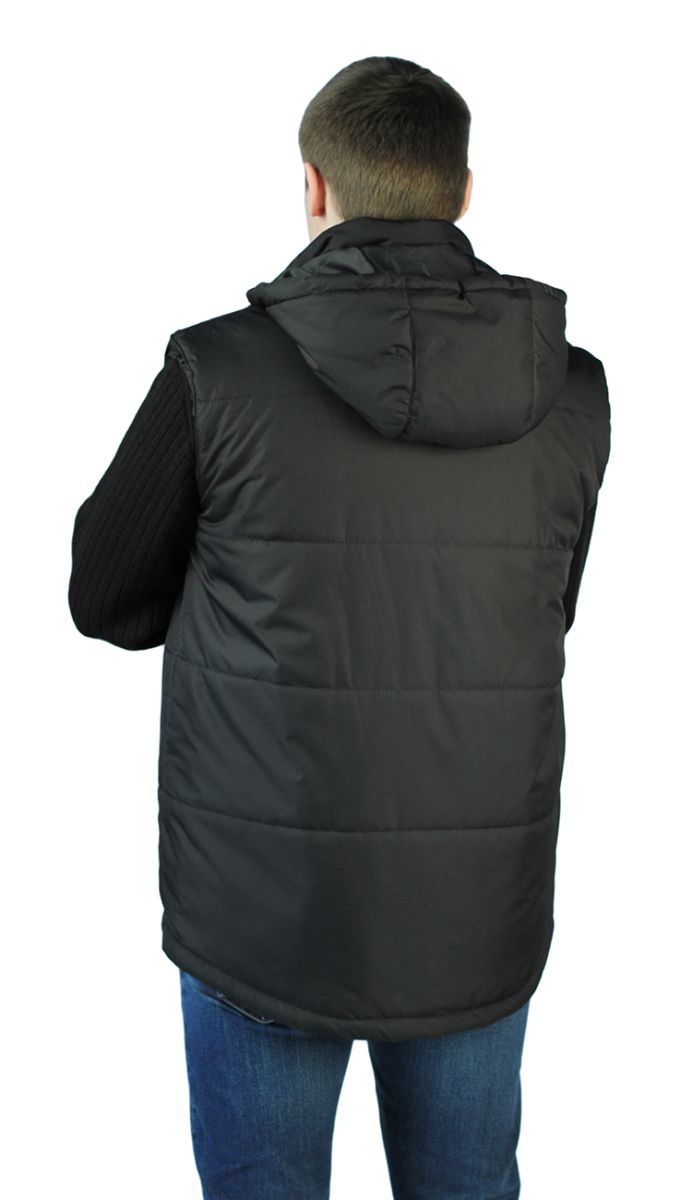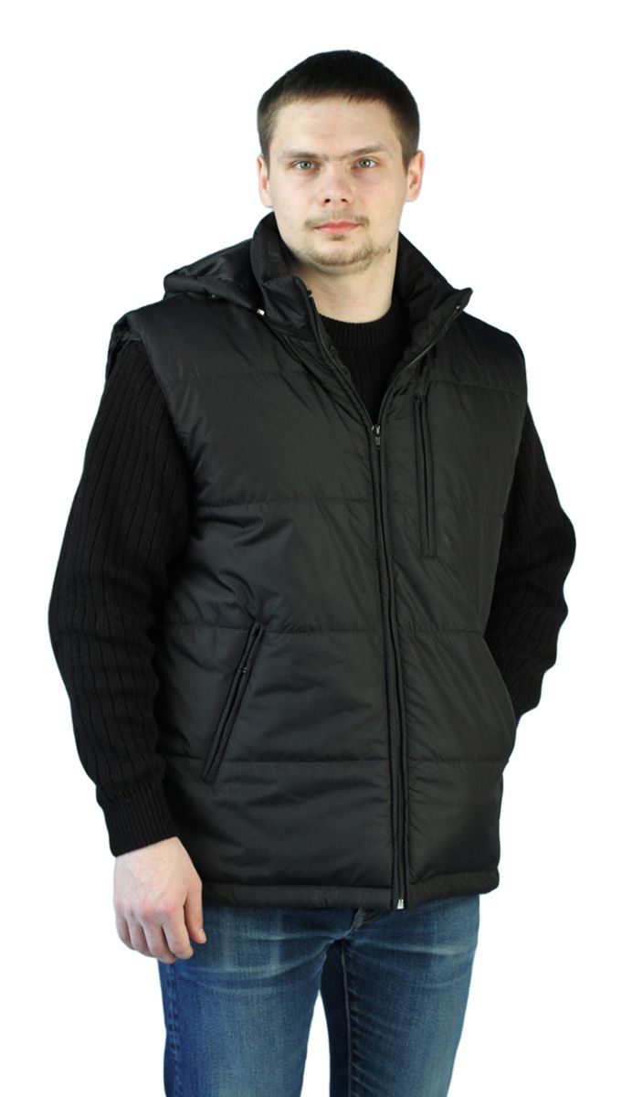 Жилет мужской, прямого силуэта, утепленный, простеган декоративными строчками с утеплителем - центральная застежка на молнию - нагрудный и нижние боковые прорезные карманы на молнии - ветрозащитные пуфты с резинкой в проймах - воротник – стойка с планкой для пристегивания капюшона - съемный капюшон с кулиской по лицевому срезу для регулировки высоты - удлиненная спинка, утягивающая кулиса по низу