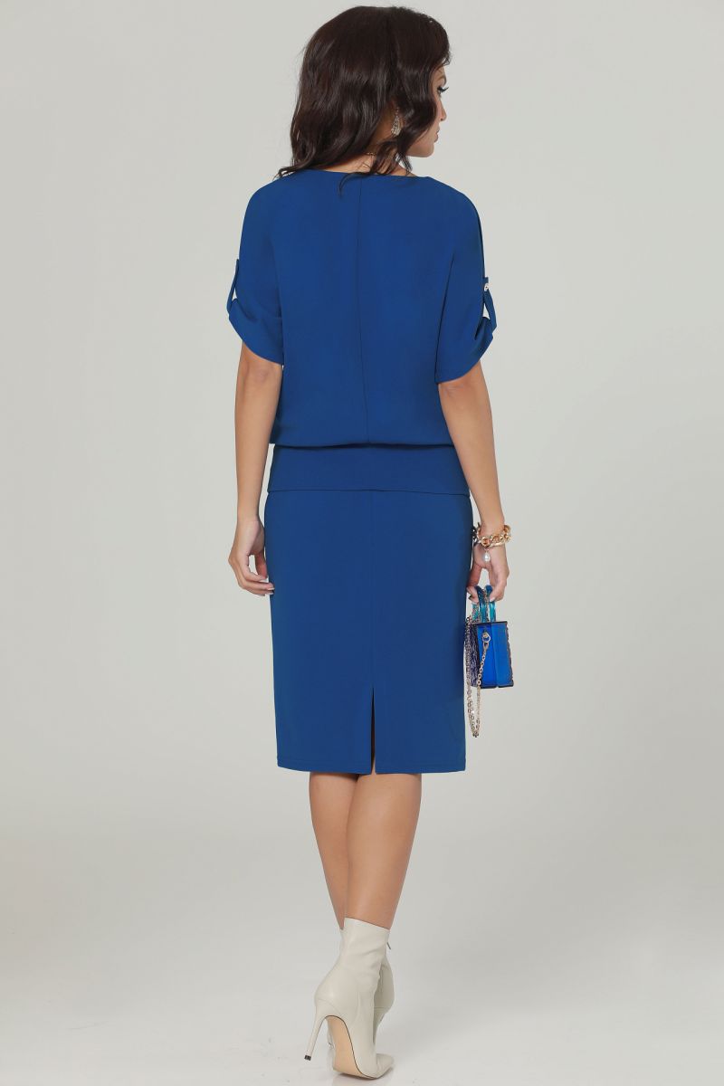 Комфортный и элегантный костюм на каждый день. Юбка-карандаш незаменима при создании делового образа. Компанию ей составляет свободная блузка с цельнокроеным рукавом, украшенным патами, с широким поясом. Благодаря трикотажной текстуре, пояс можно поднимать и опускать по желанию, создавая разный напуск, какой вам больше нравится.