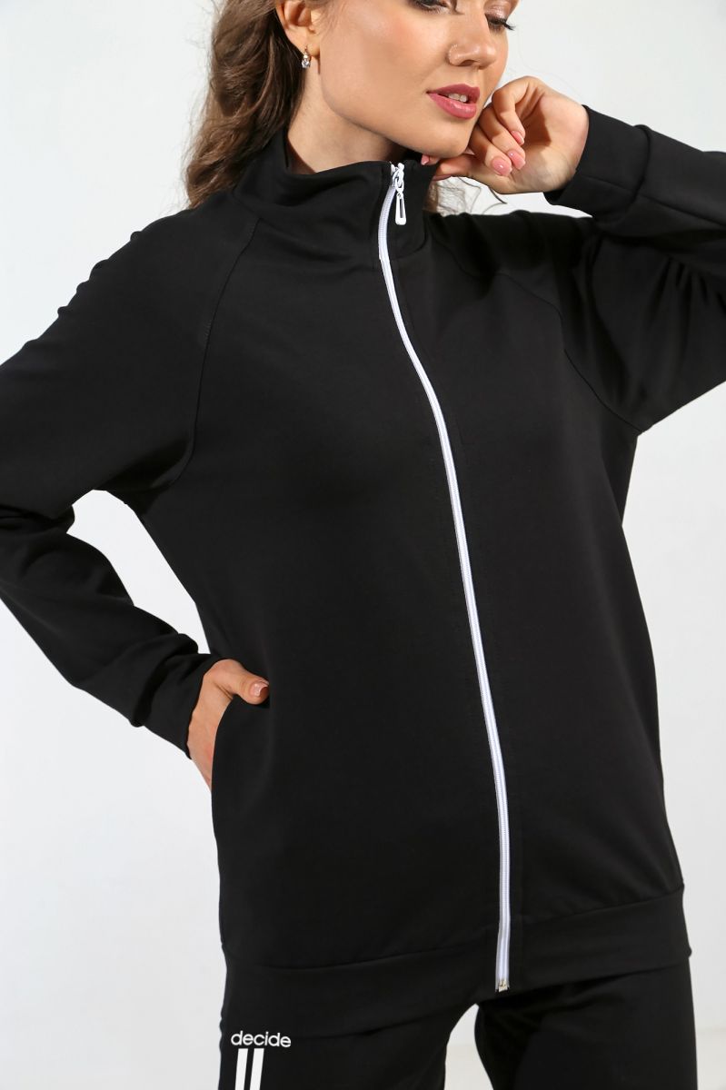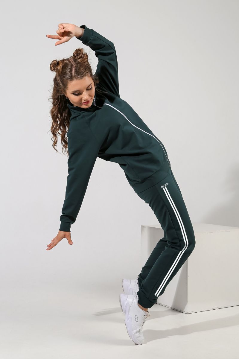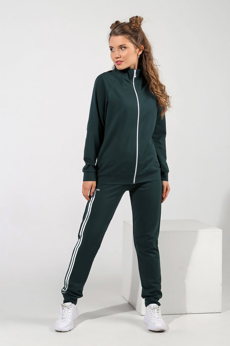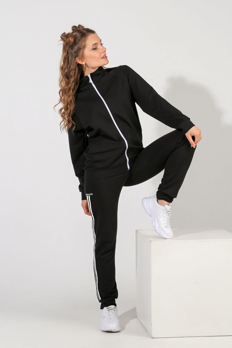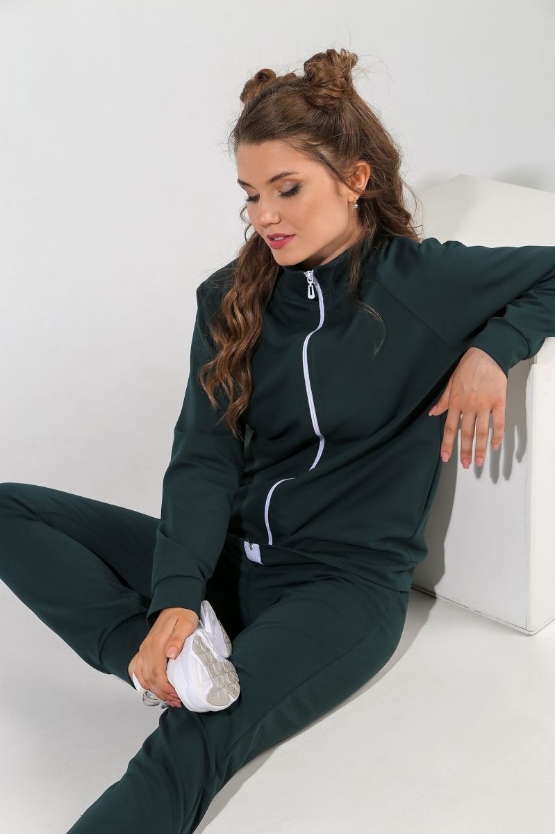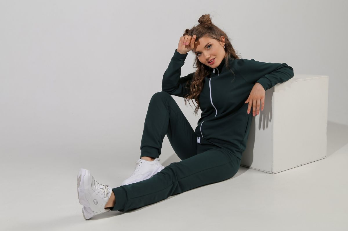 Из гладкокрашеного трикотажного полотна «Футер-двунитка», состоящий из куртки и брюк.