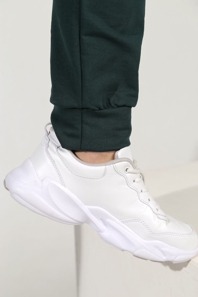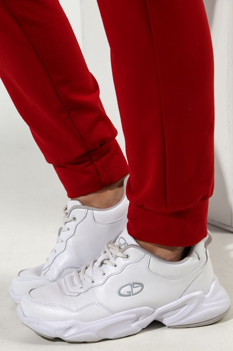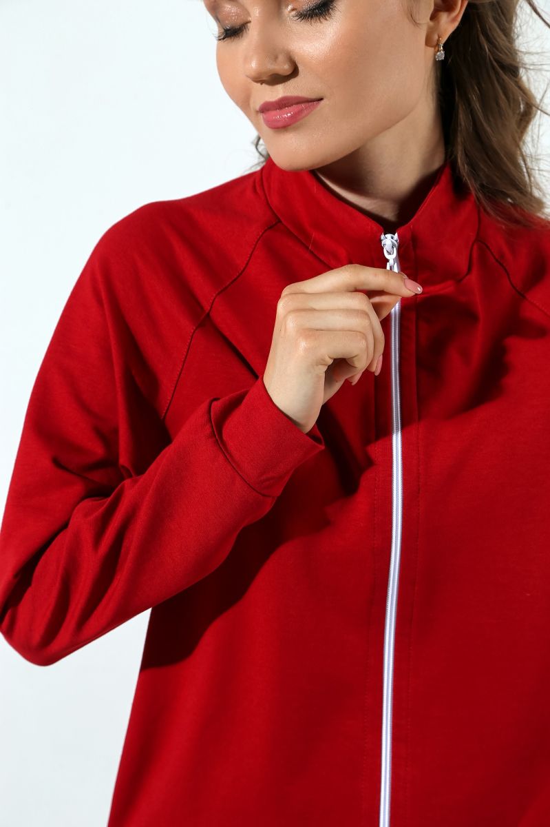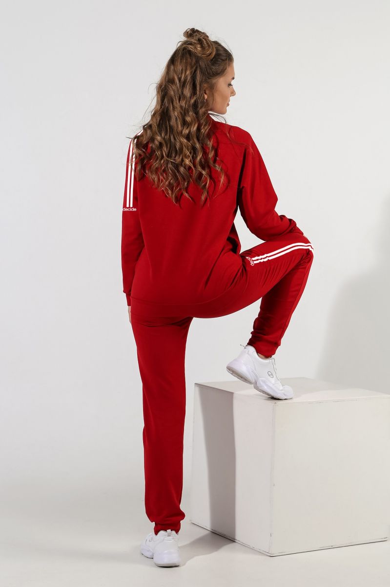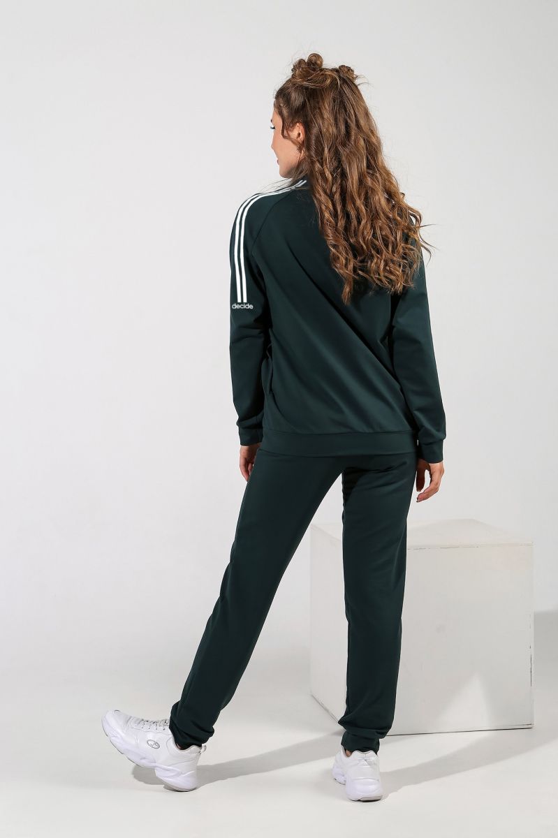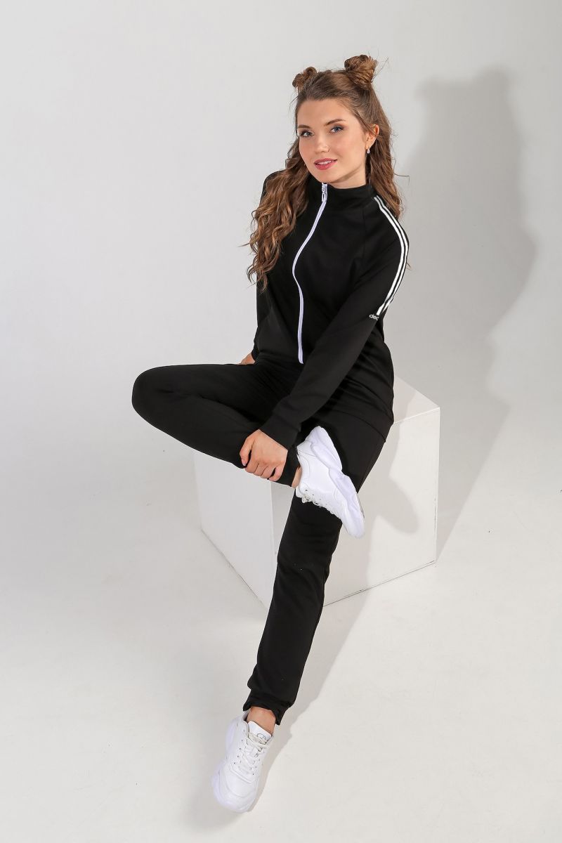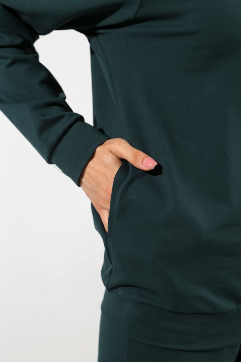 Из гладкокрашеного трикотажного полотна «Футер-двунитка», состоящий из куртки и брюк.
