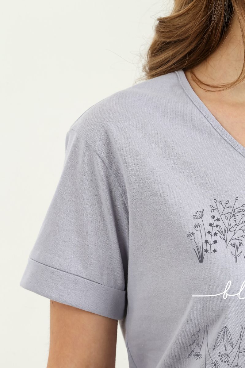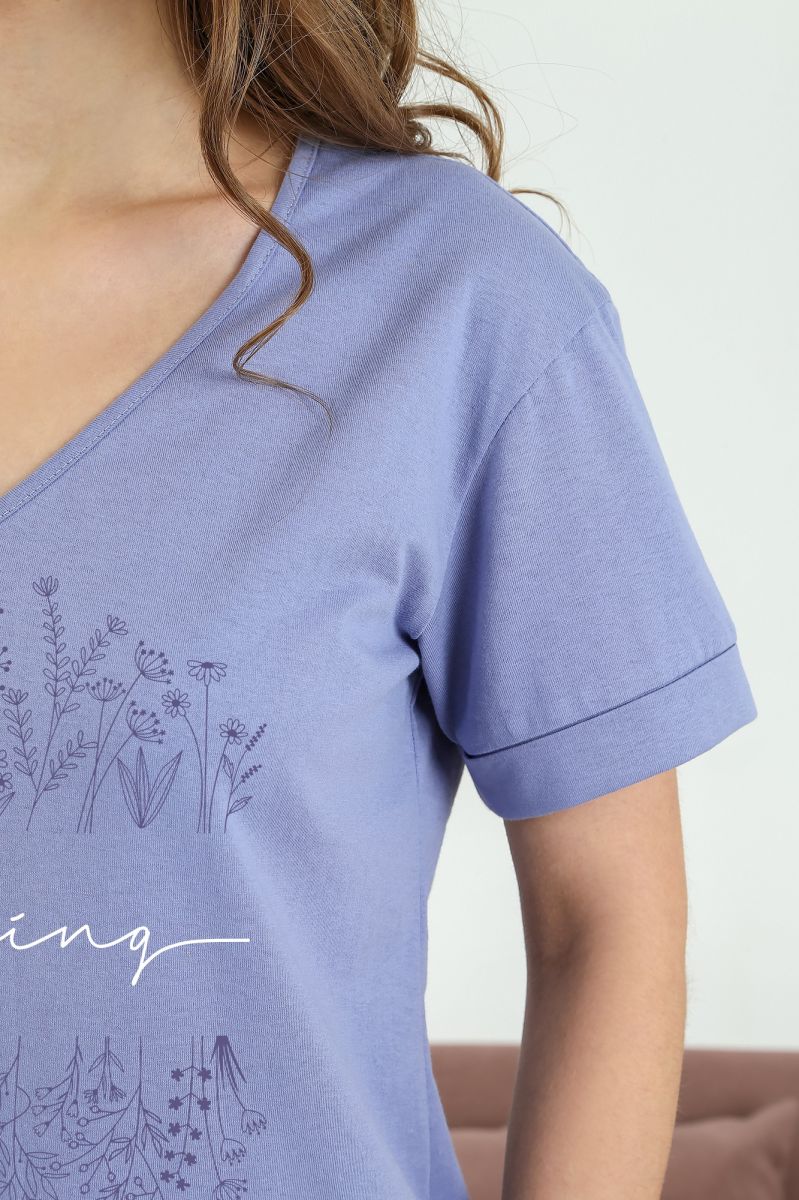 Футболка – из гладкокрашеного полотна «кулирка с лайкрой», классического покроя, с короткими втачными рукавами, горловиной v-образной формы, окантованной основным материалом и принтом на полочке, выполненным методом шелкографии. Нижние срезы рукавов обработаны притачными манжетами-отворотами.