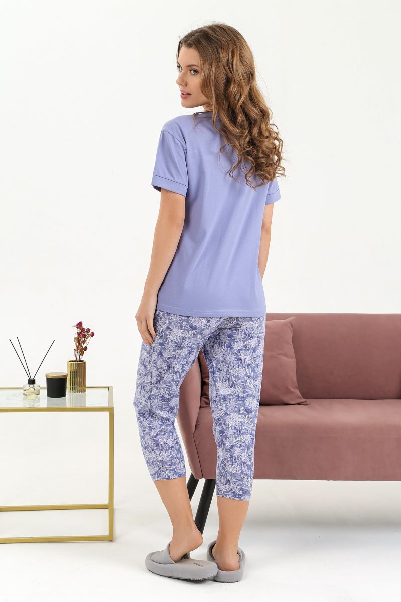 Костюм из трикотажного полотна «кулирка» в комбинации двух видов: гладкокрашеного полотна с лайкрой и с набивным рисунком и 100% хлопка в составе, состоящий из футболки и бриджей.